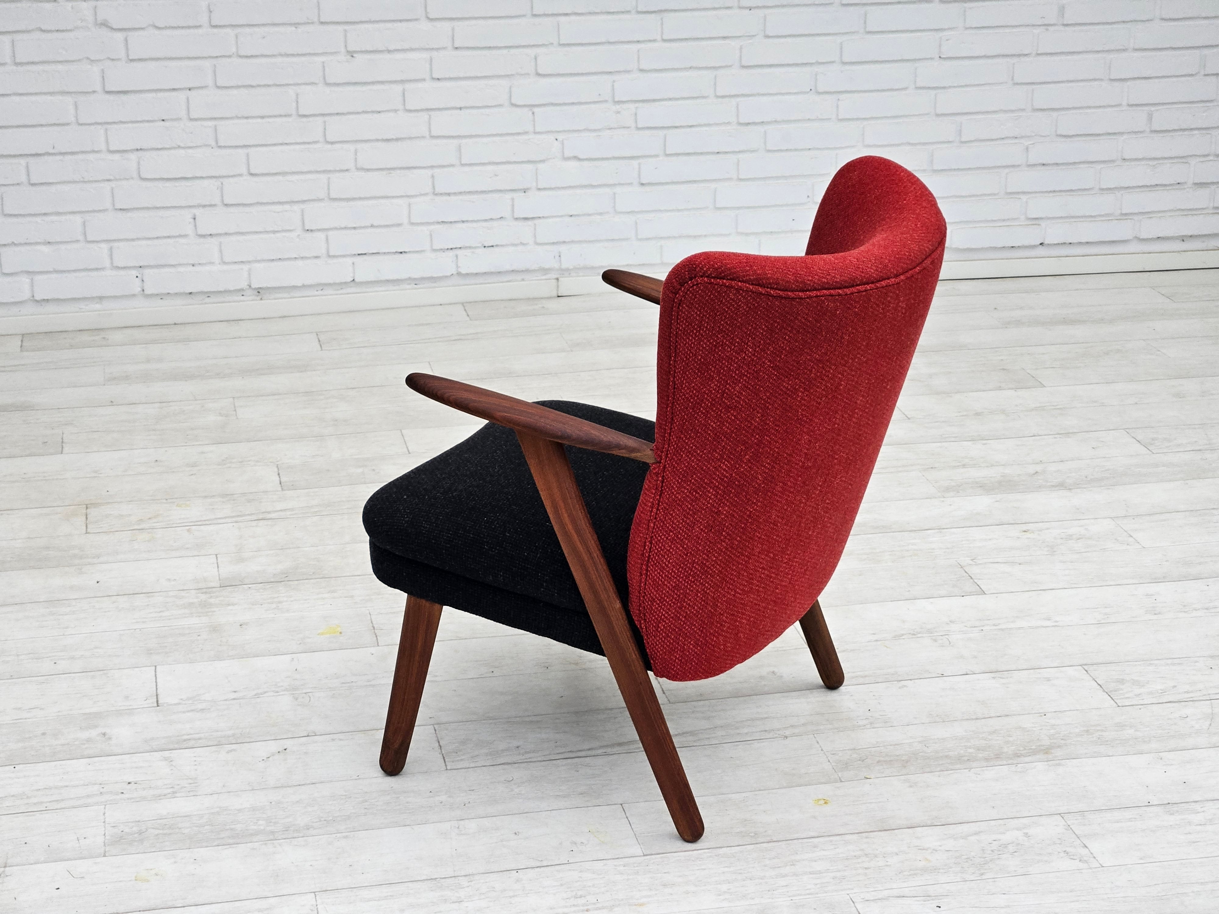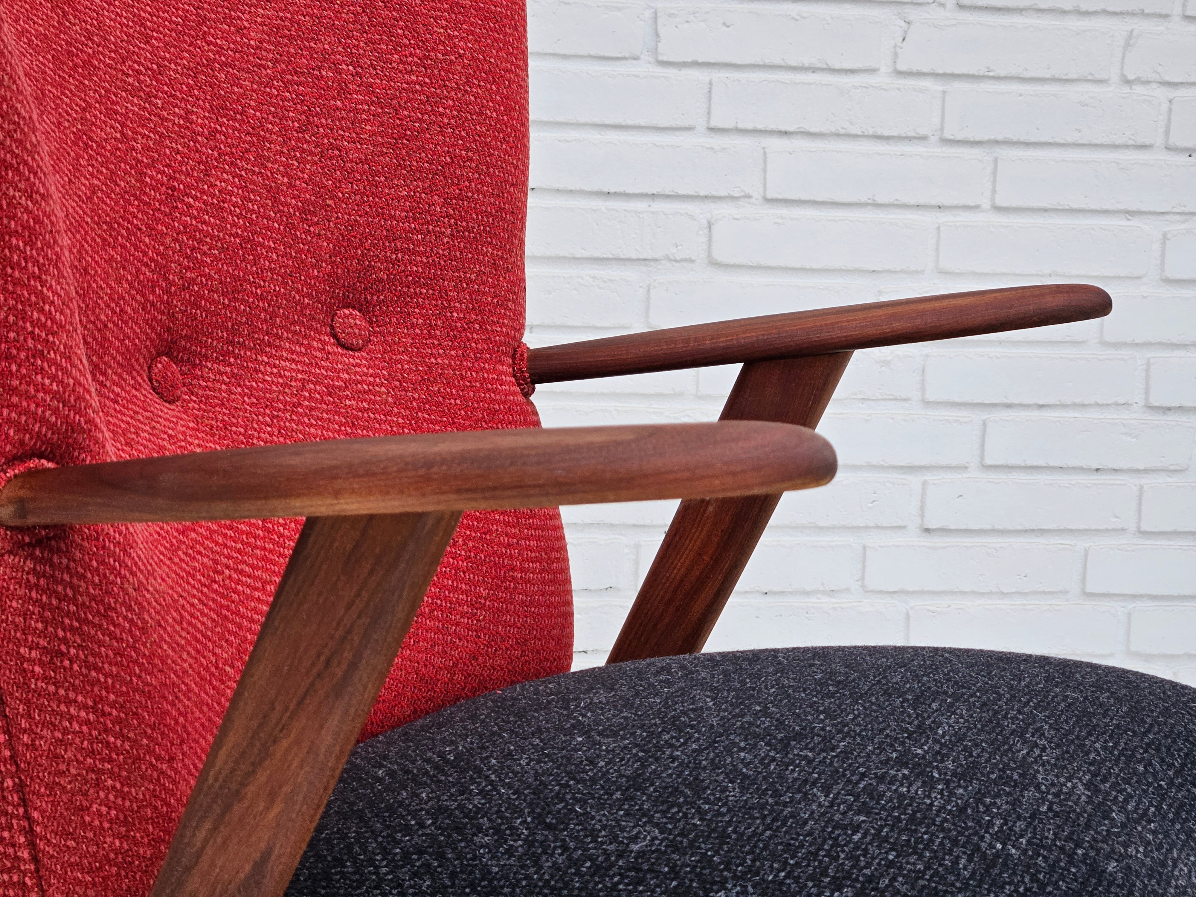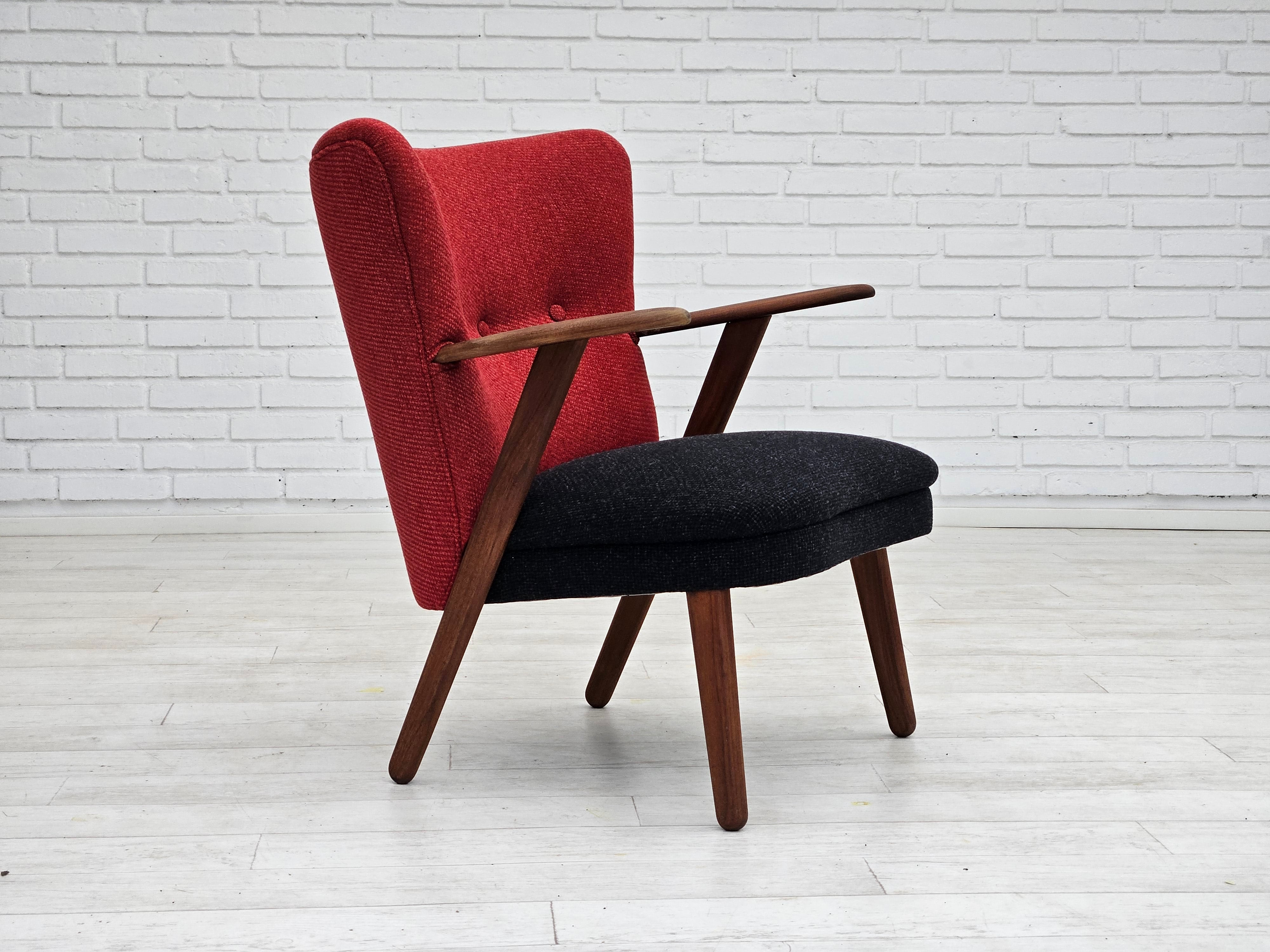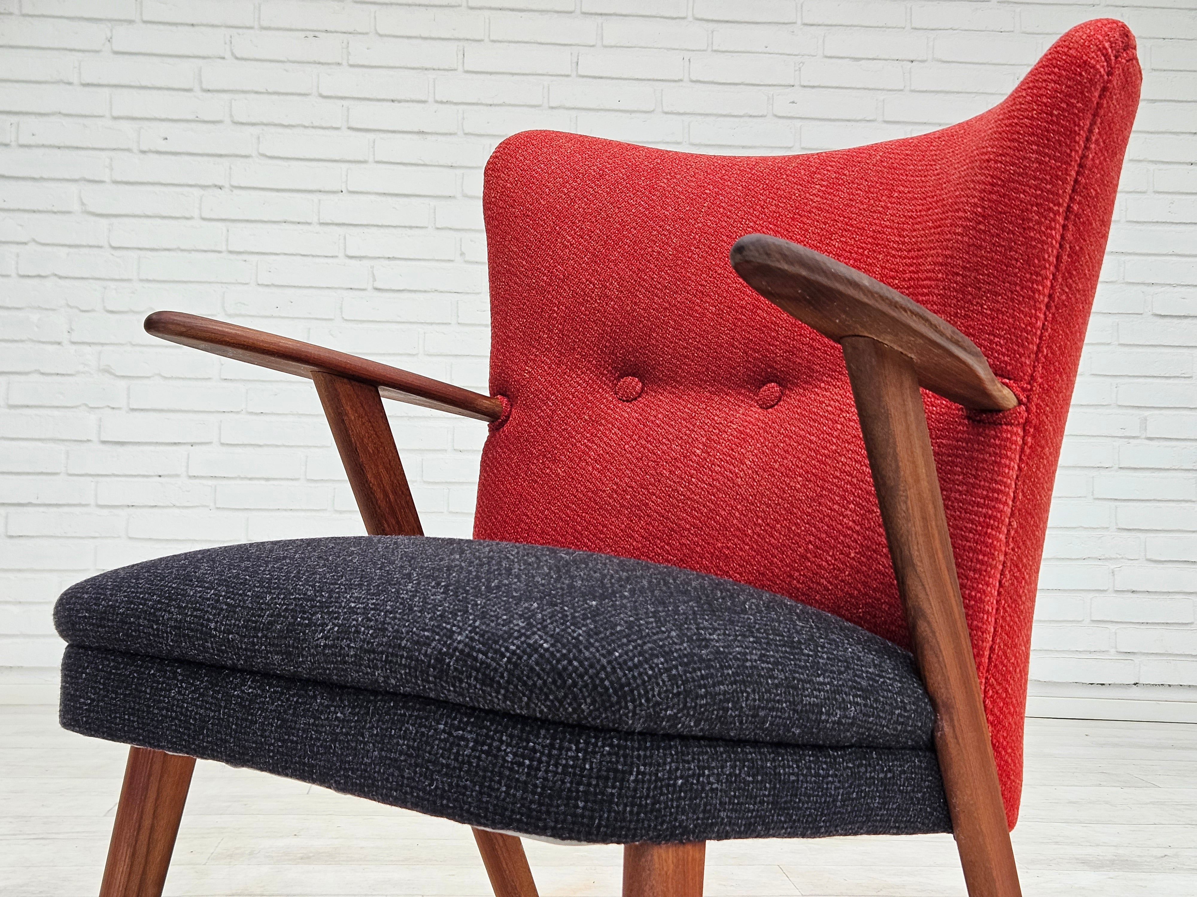 1960s, Dansk design af Erhardsen & Andersen. Total renoveret lænestole. Møbel uldstof i koksgrå og rød farve. Fornyet teaktræ. Helt ny polstring. Fremstillet af Dansk møbelproducent Eran Møbler, Nykøbing Mors i ca. 1960. Renoveret hos Retro Møbler Galleri af professionel møbelpolstrer, håndværker.
