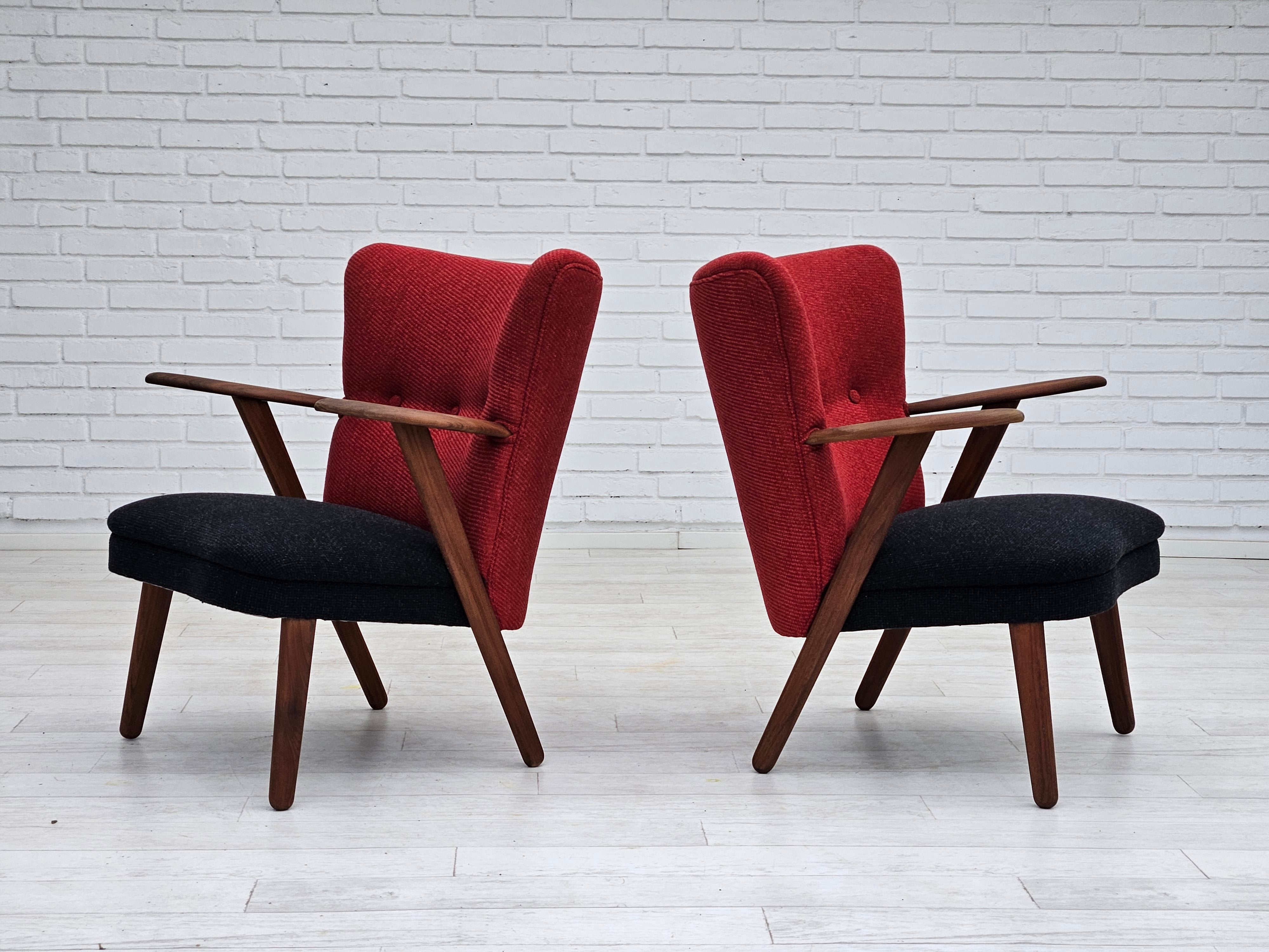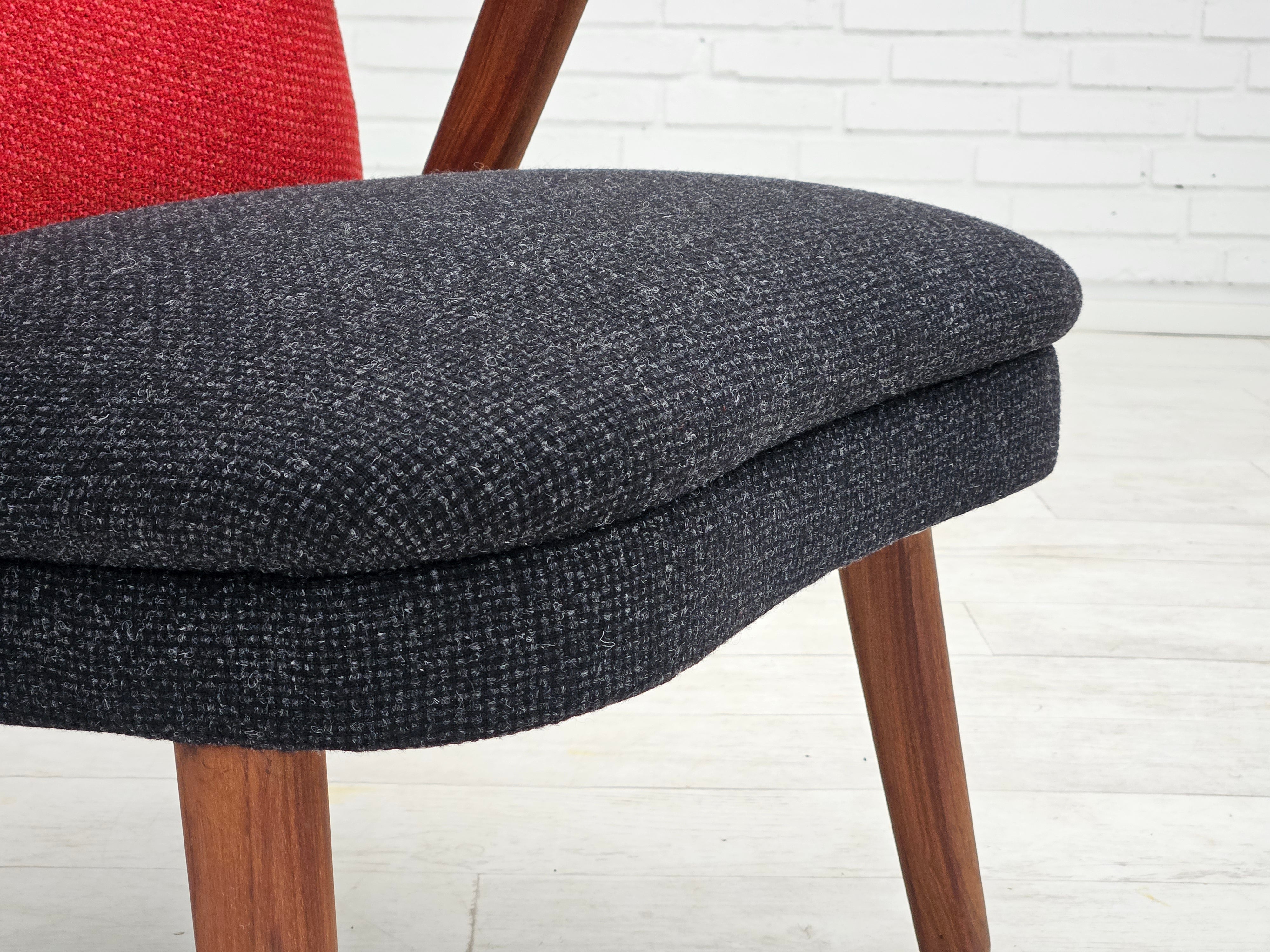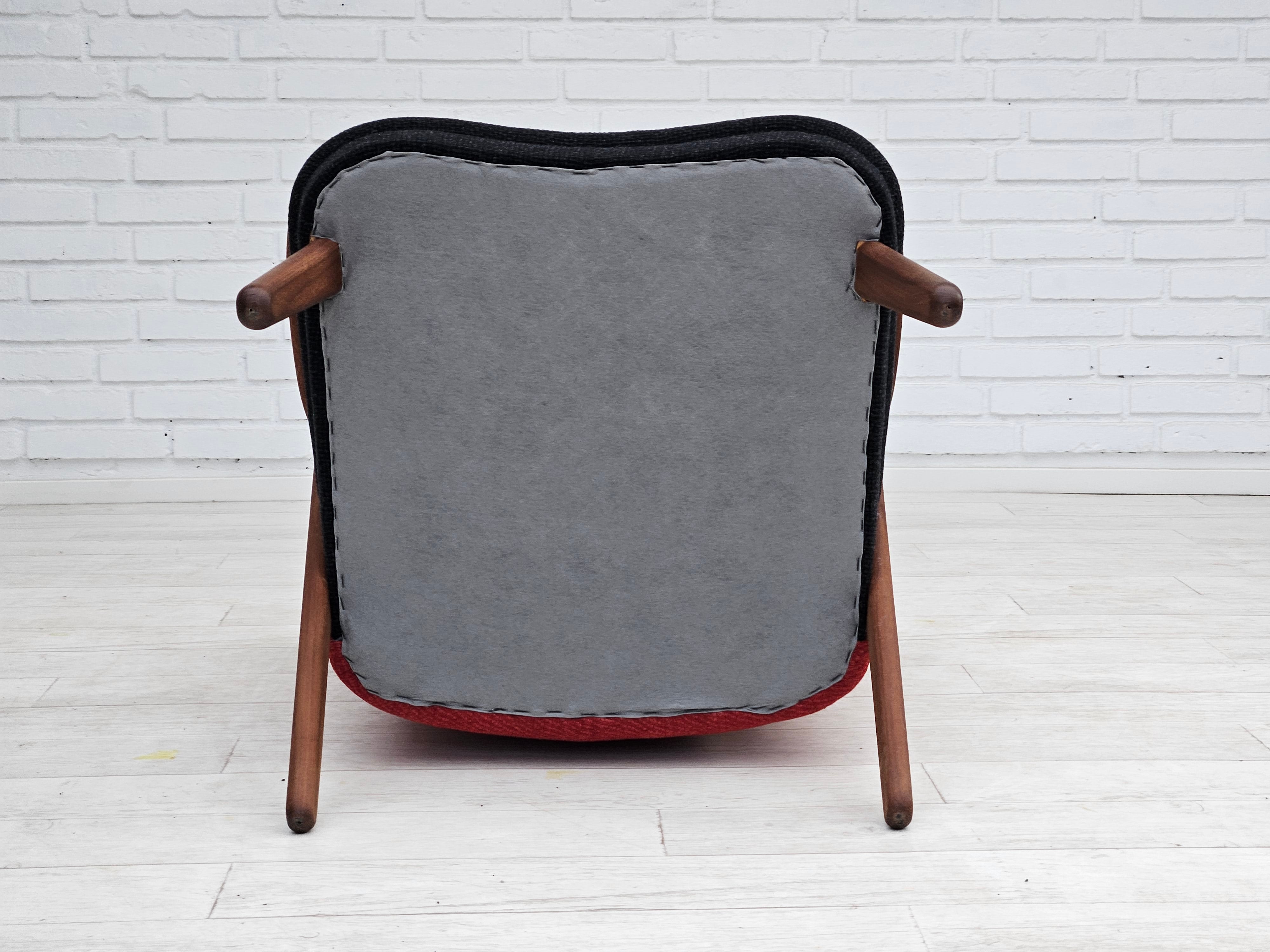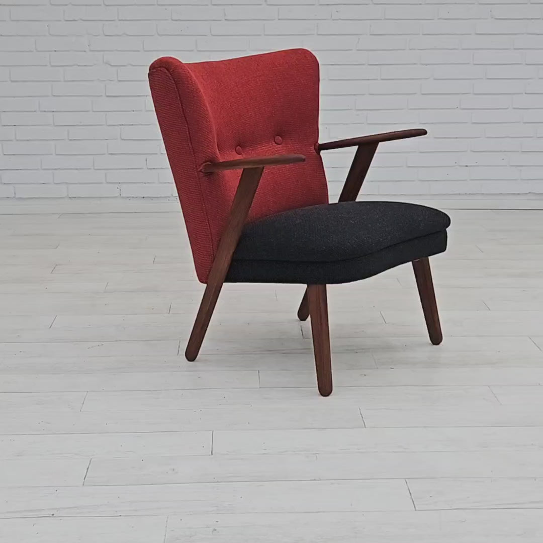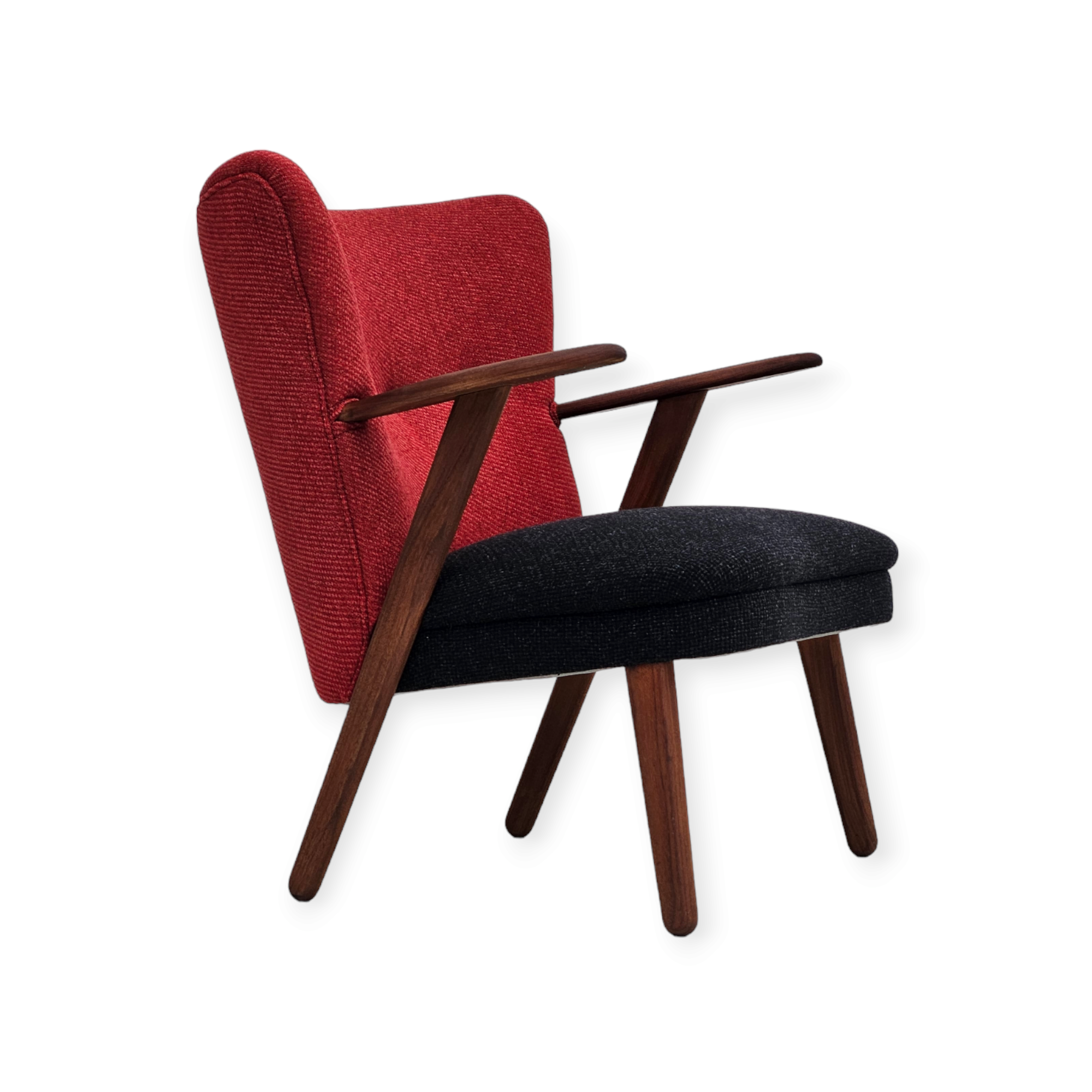 1960s, Dansk design af Erhardsen & Andersen. Total renoveret lænestole. Møbel uldstof i koksgrå og rød farve. Fornyet teaktræ. Helt ny polstring. Fremstillet af Dansk møbelproducent Eran Møbler, Nykøbing Mors i ca. 1960. Renoveret hos Retro Møbler Galleri af professionel møbelpolstrer, håndværker.