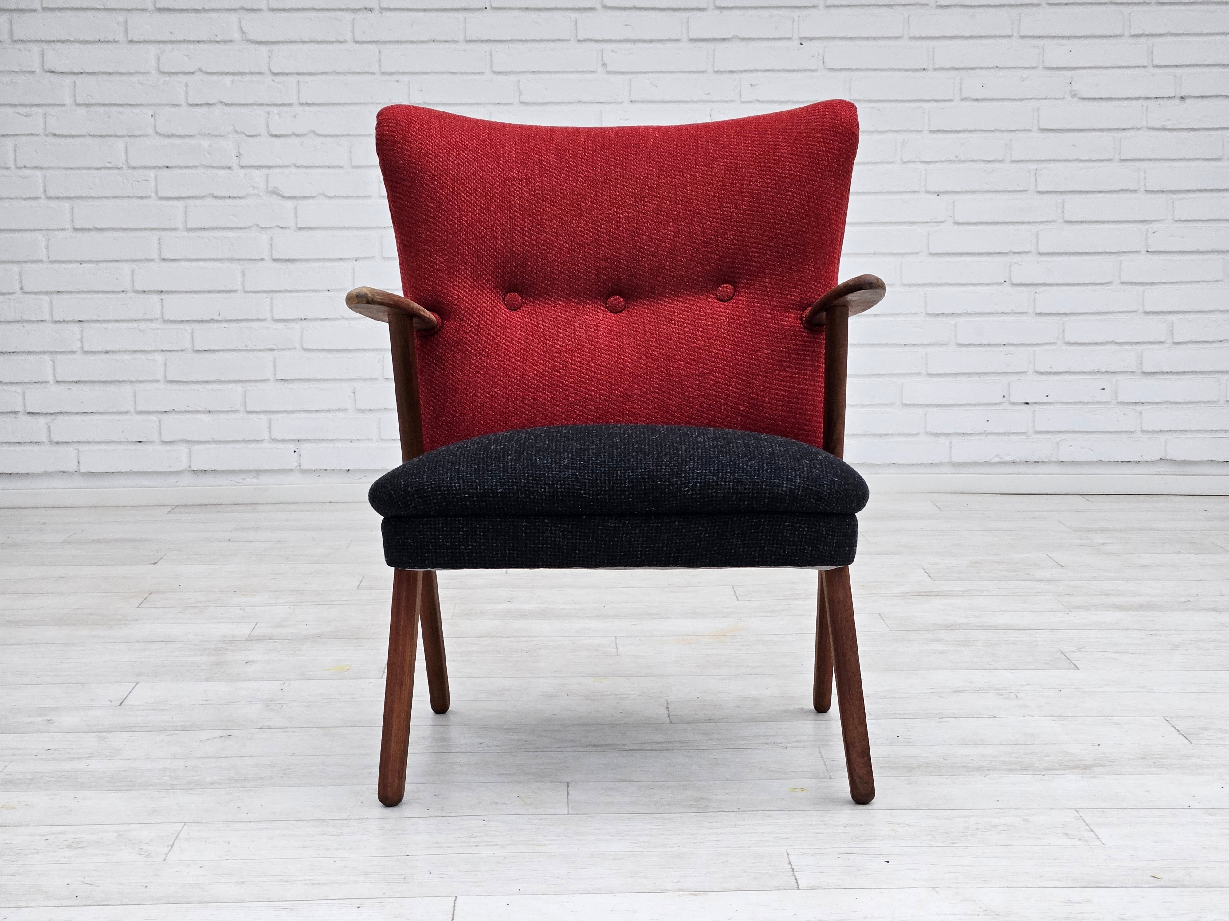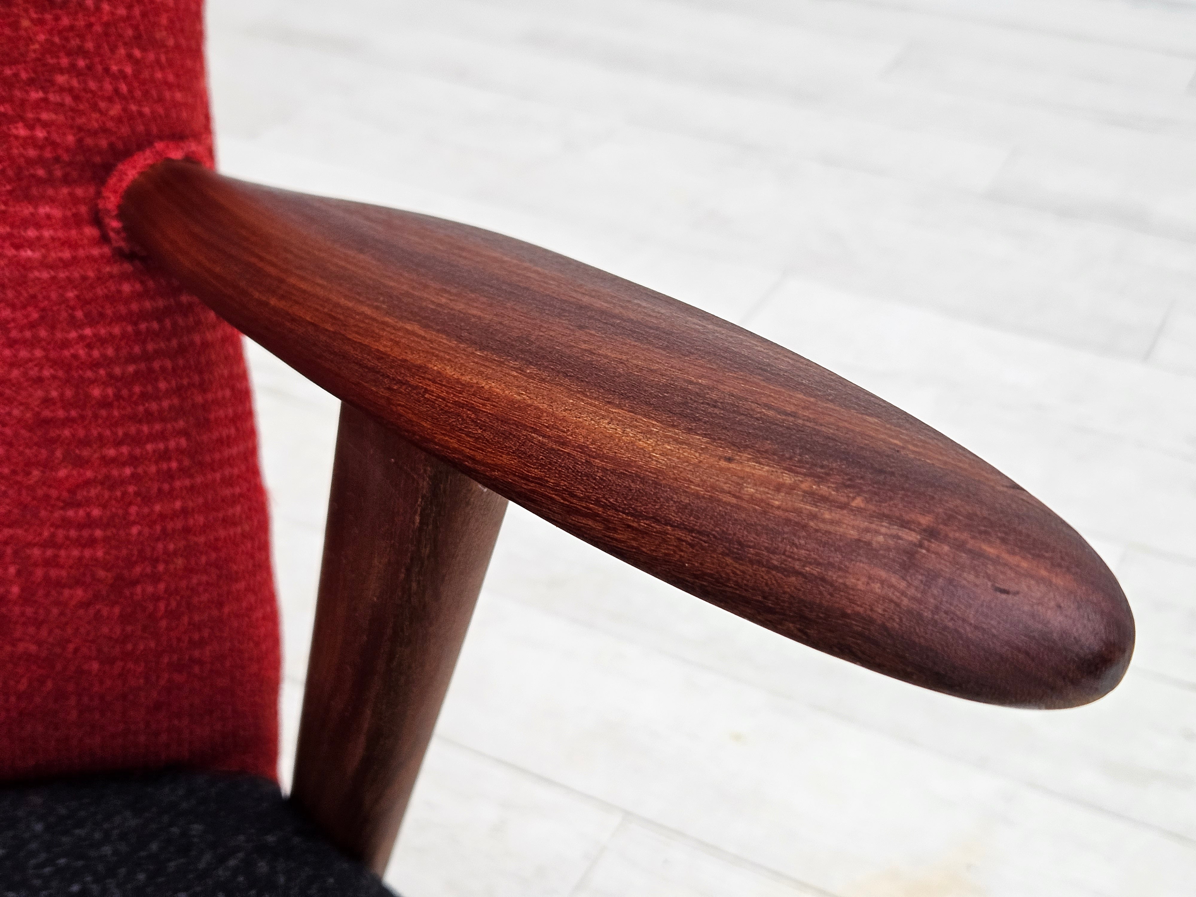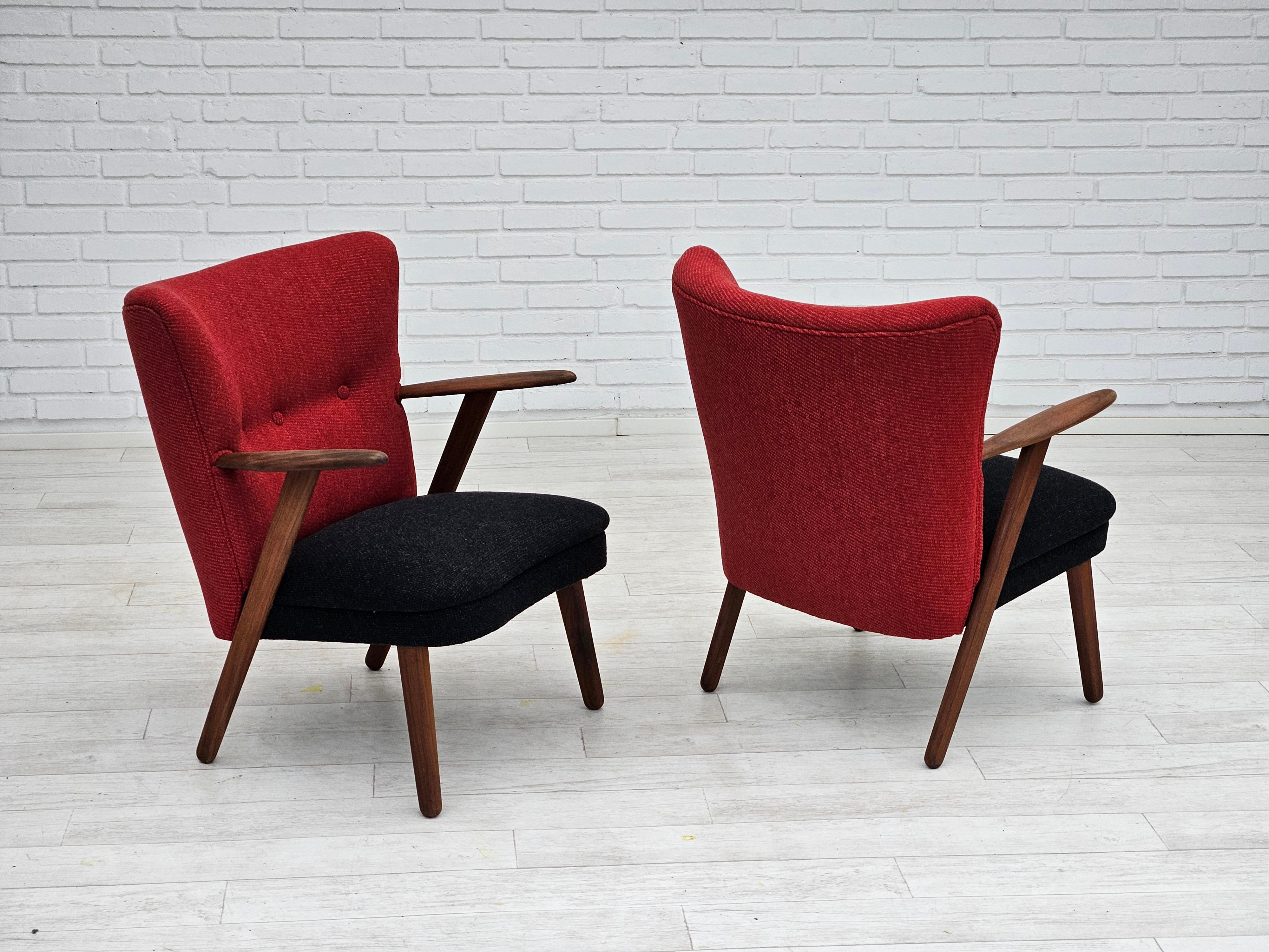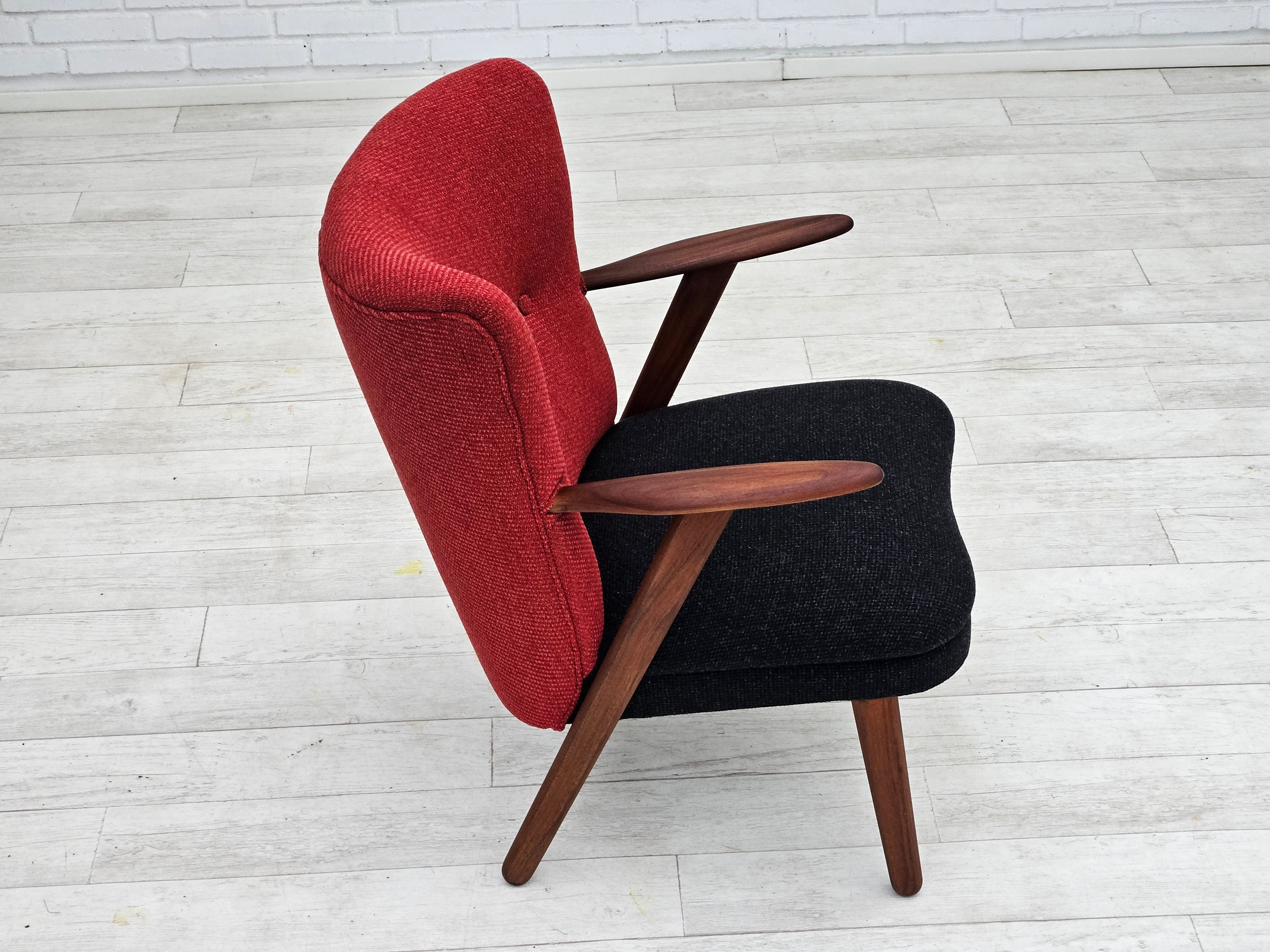 1960s, Dansk design af Erhardsen & Andersen. Total renoveret lænestole. Møbel uldstof i koksgrå og rød farve. Fornyet teaktræ. Helt ny polstring. Fremstillet af Dansk møbelproducent Eran Møbler, Nykøbing Mors i ca. 1960. Renoveret hos Retro Møbler Galleri af professionel møbelpolstrer, håndværker.