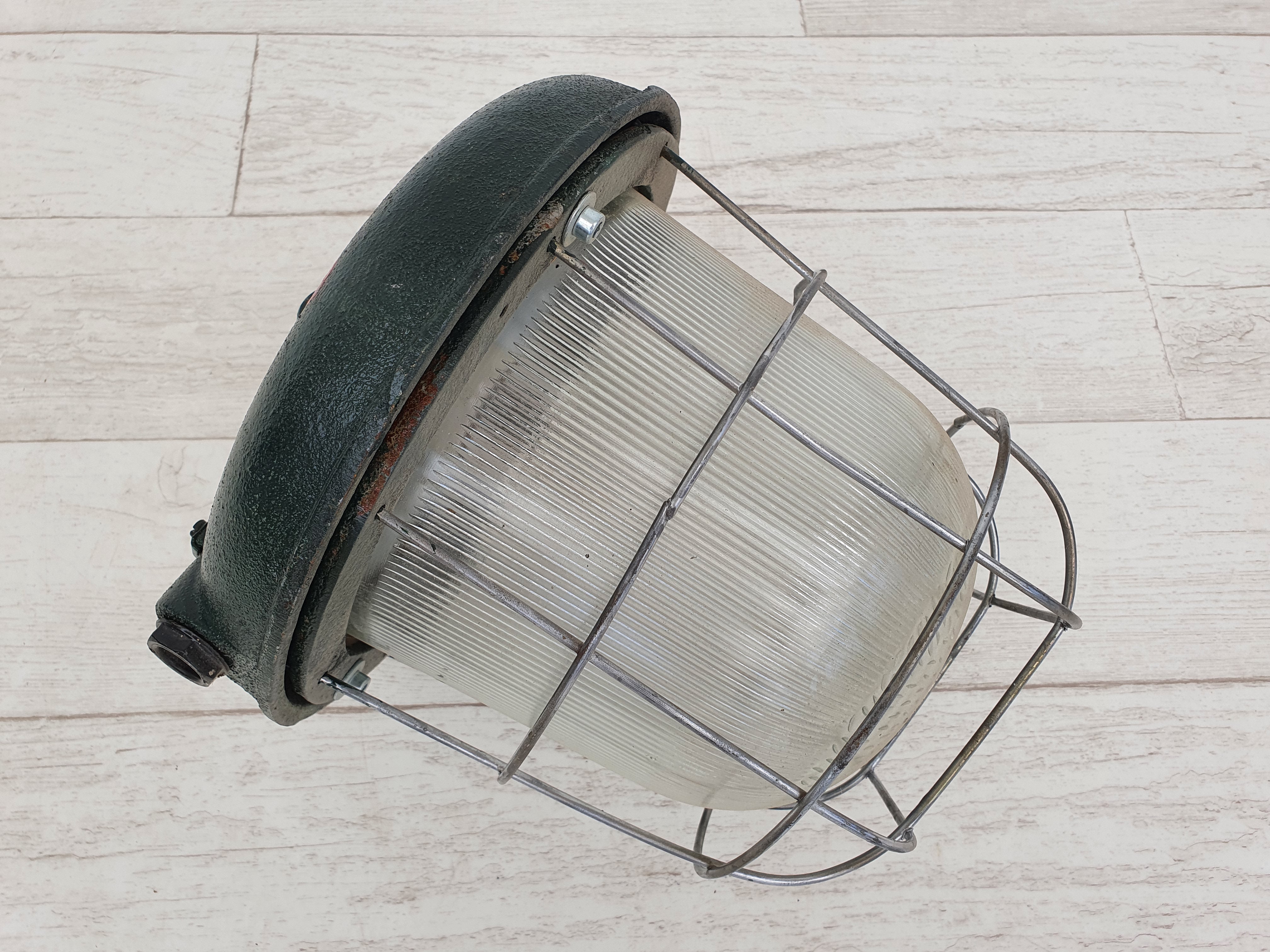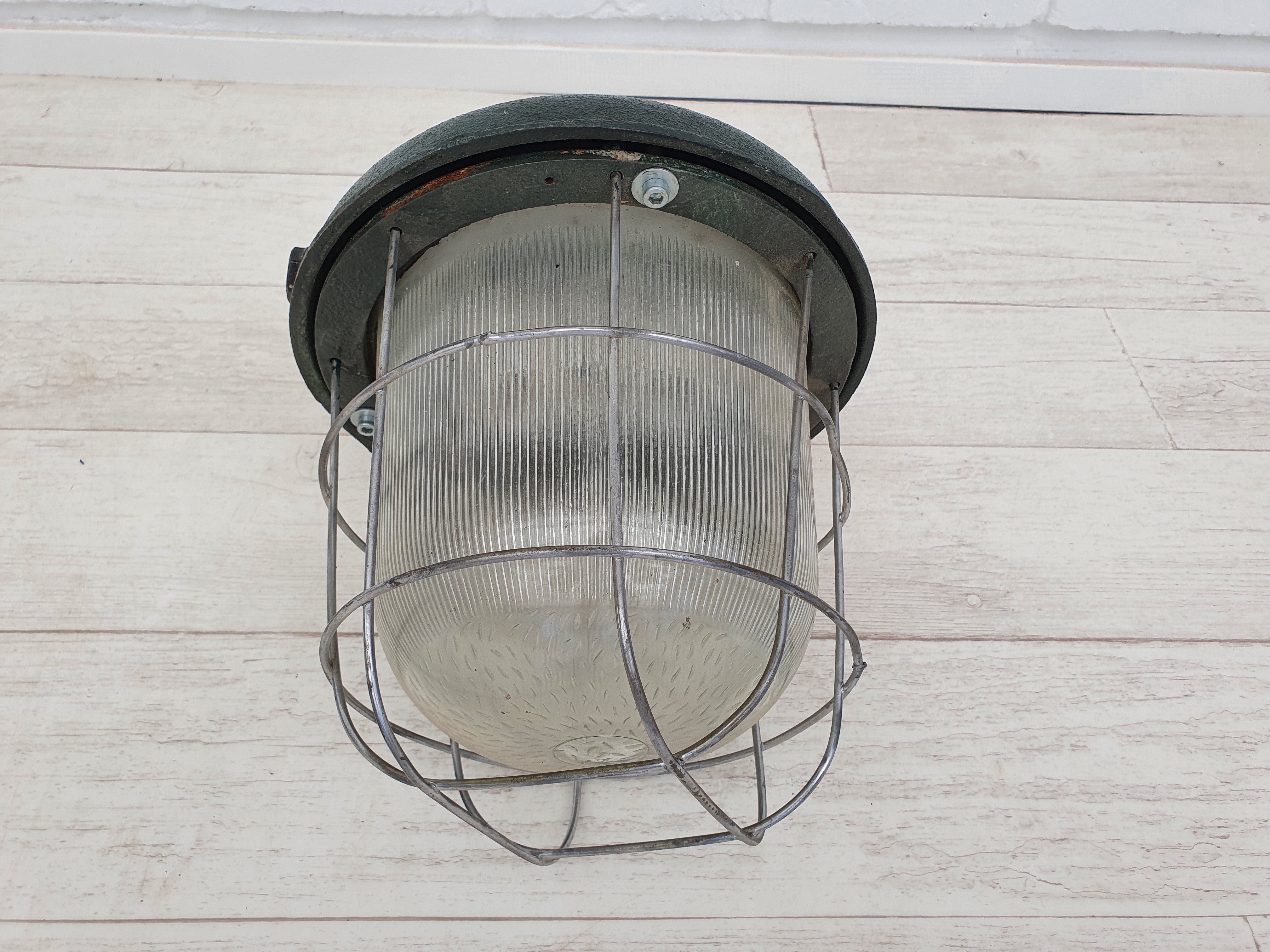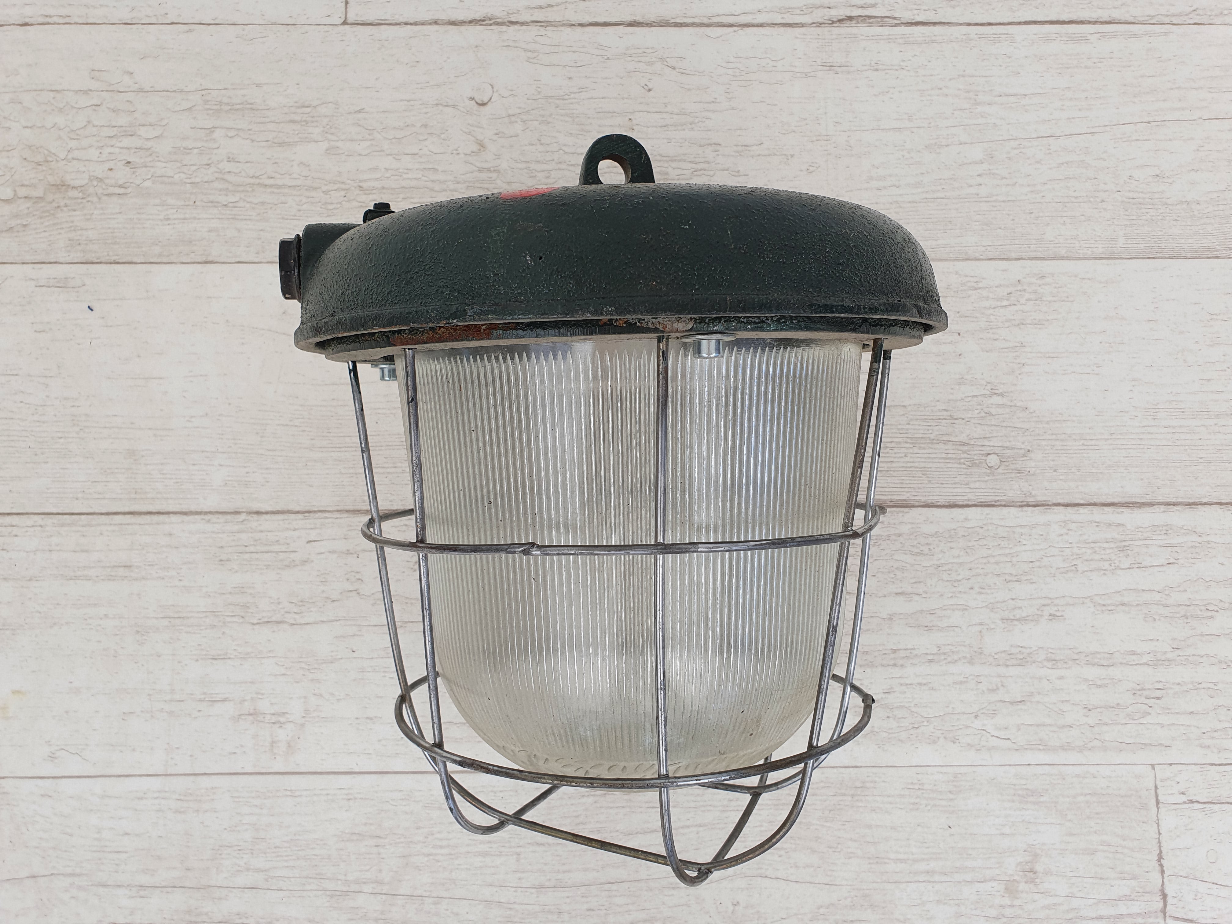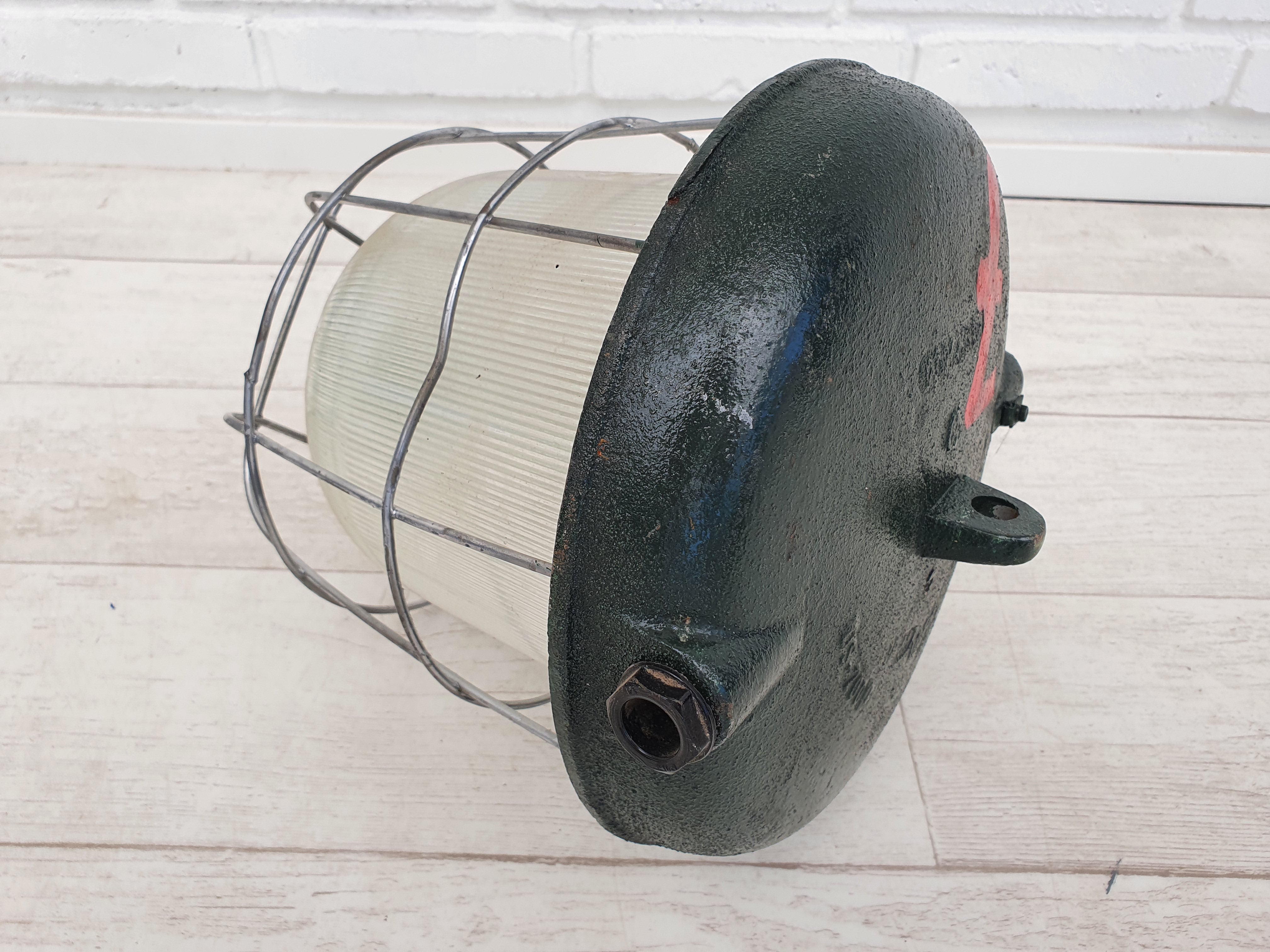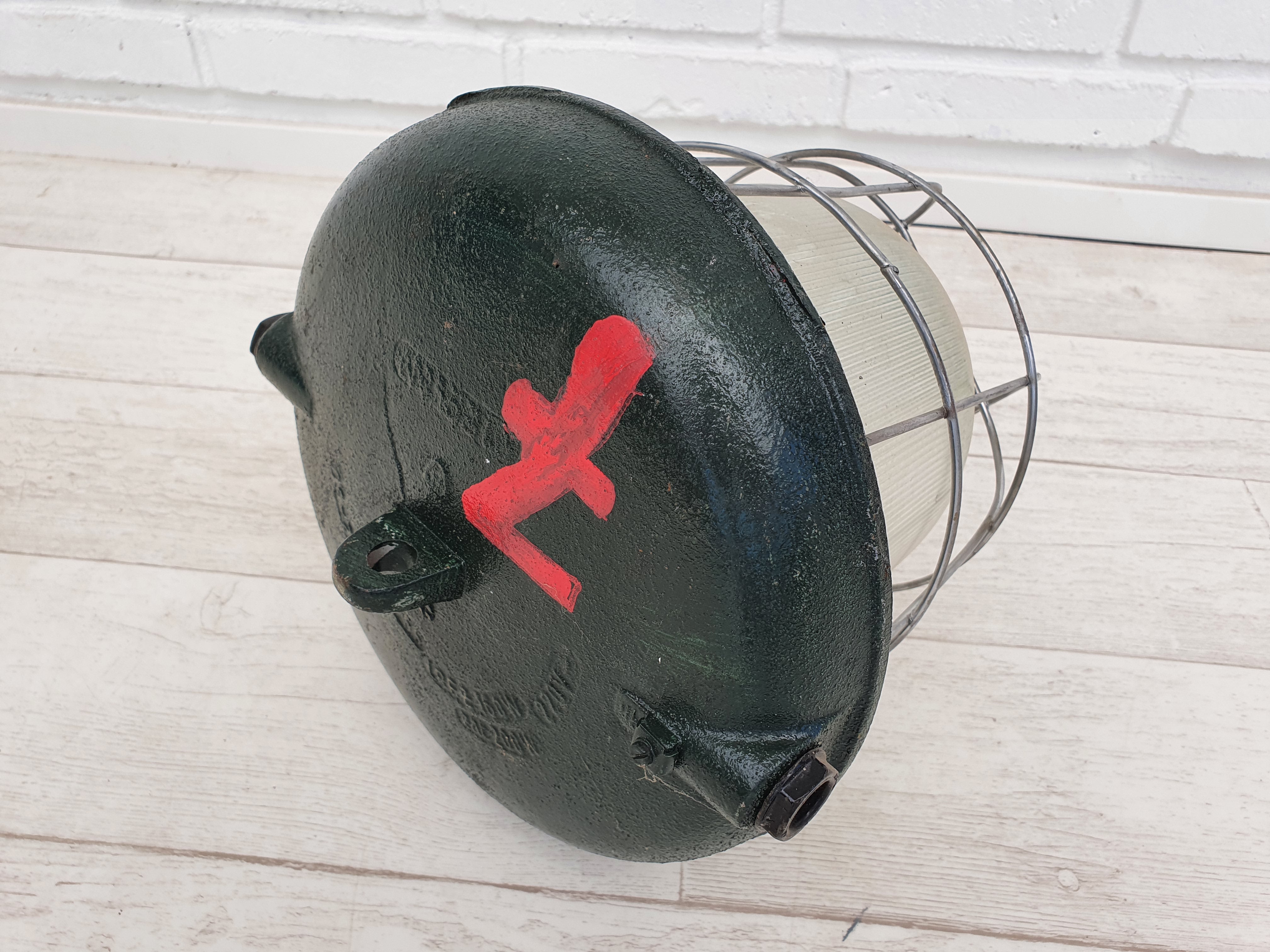 Gammel pendel, industriel værkstedslampe, glaskuppel, 60s
