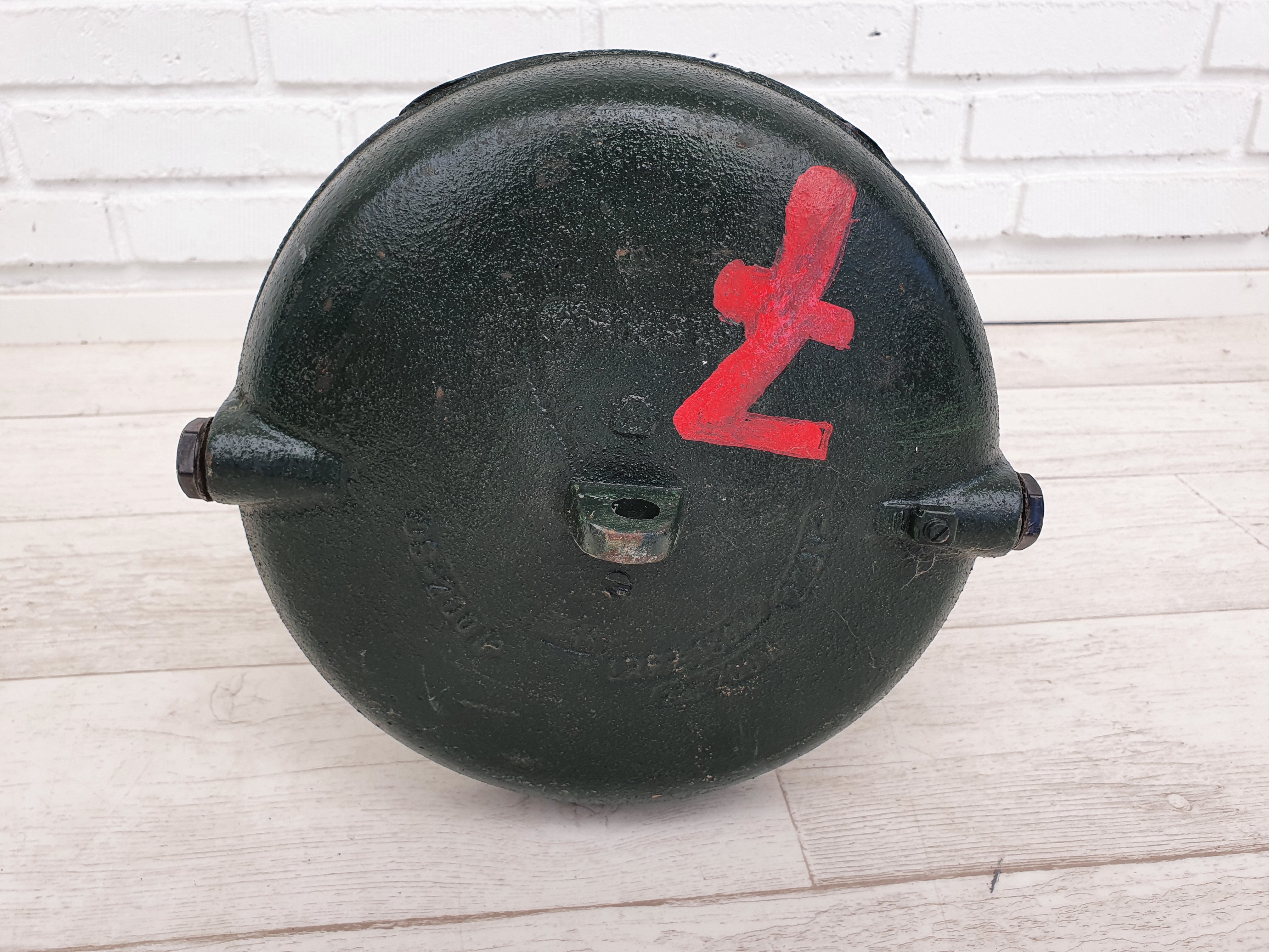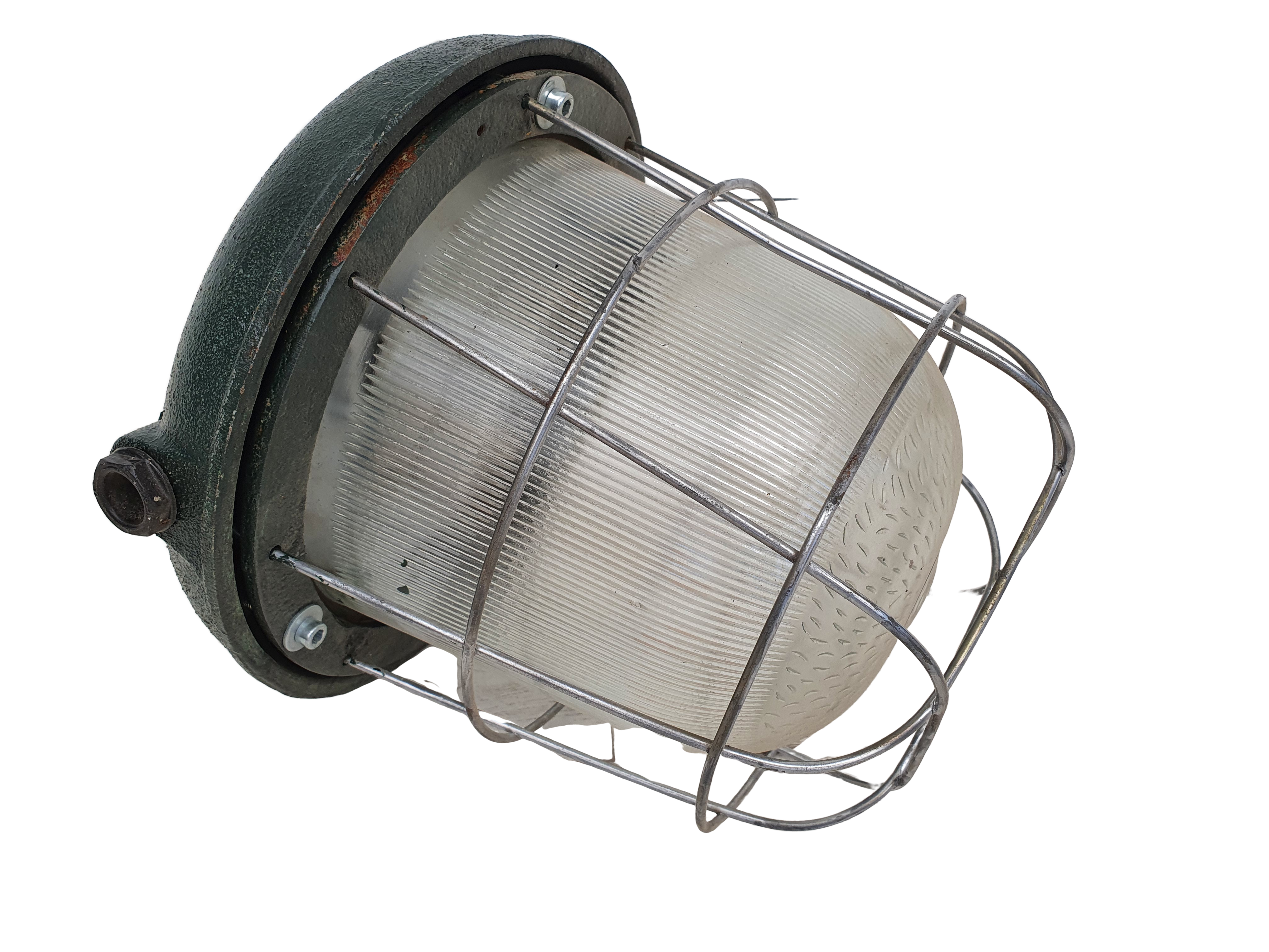 Gammel pendel, industriel værkstedslampe med glaskuppel, støbejern. De har angiveligt hængt i et lager i mange år. Meget fede, rå og industriel. Ville passe godt ind over et spisebord, køkkenbord eller andet sted hvor man ønsker at bryde den klassiske stil.