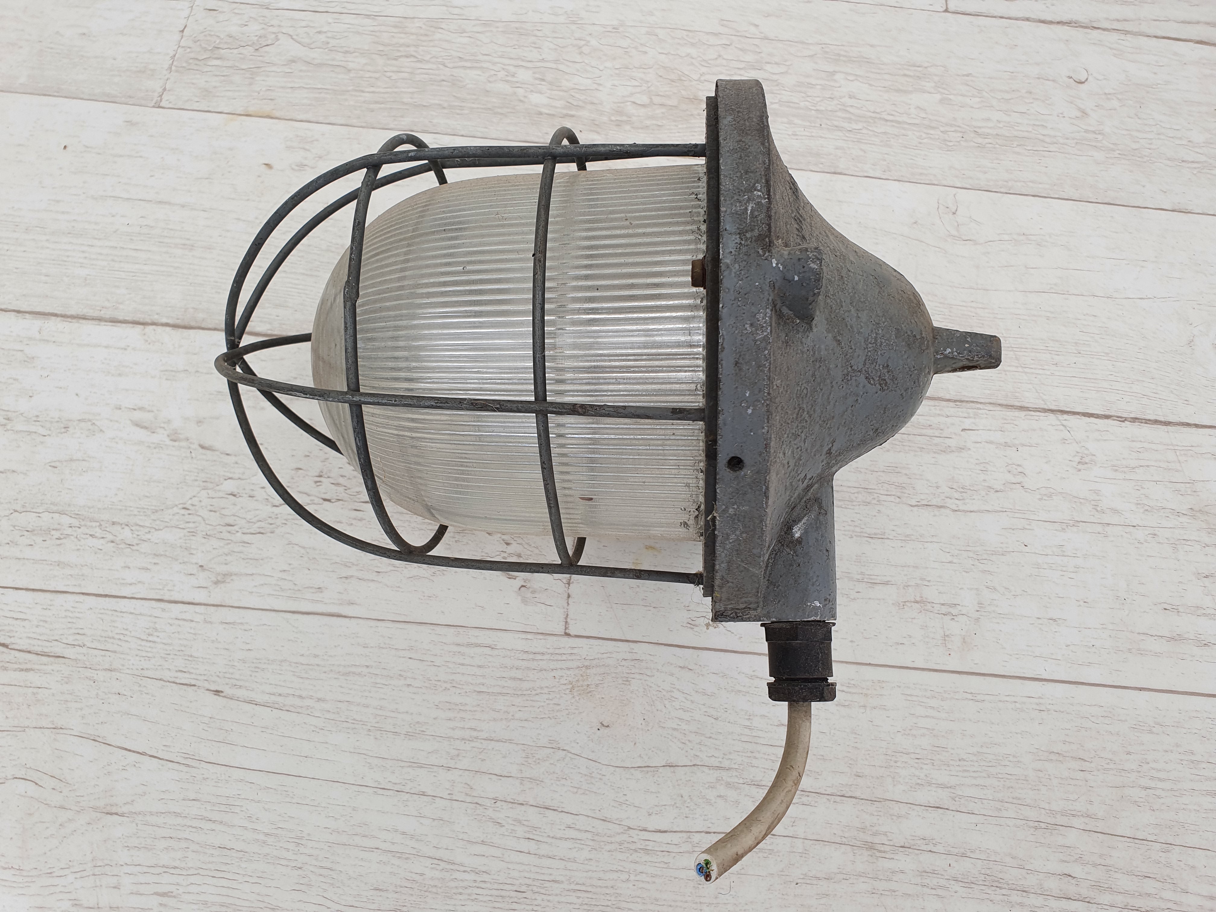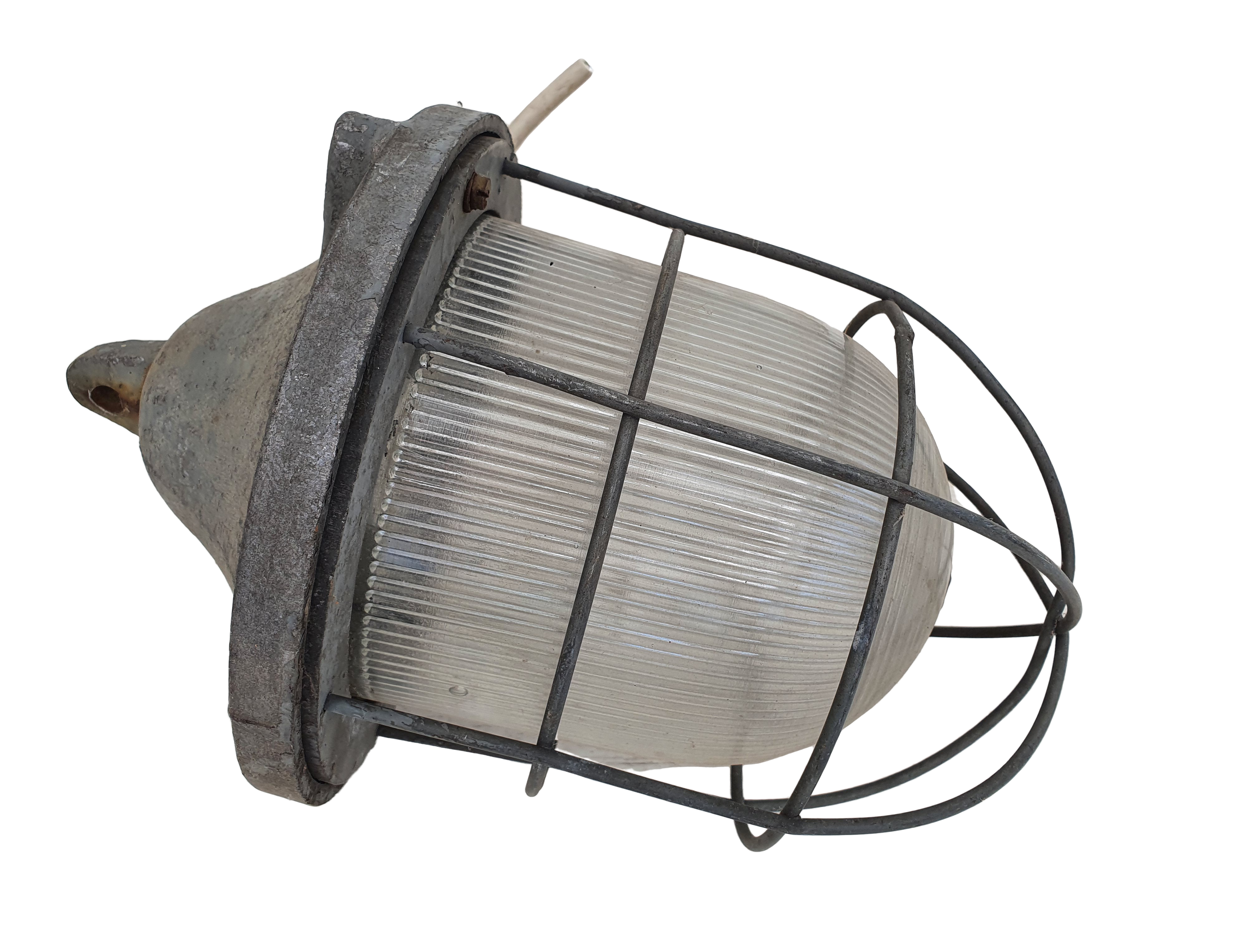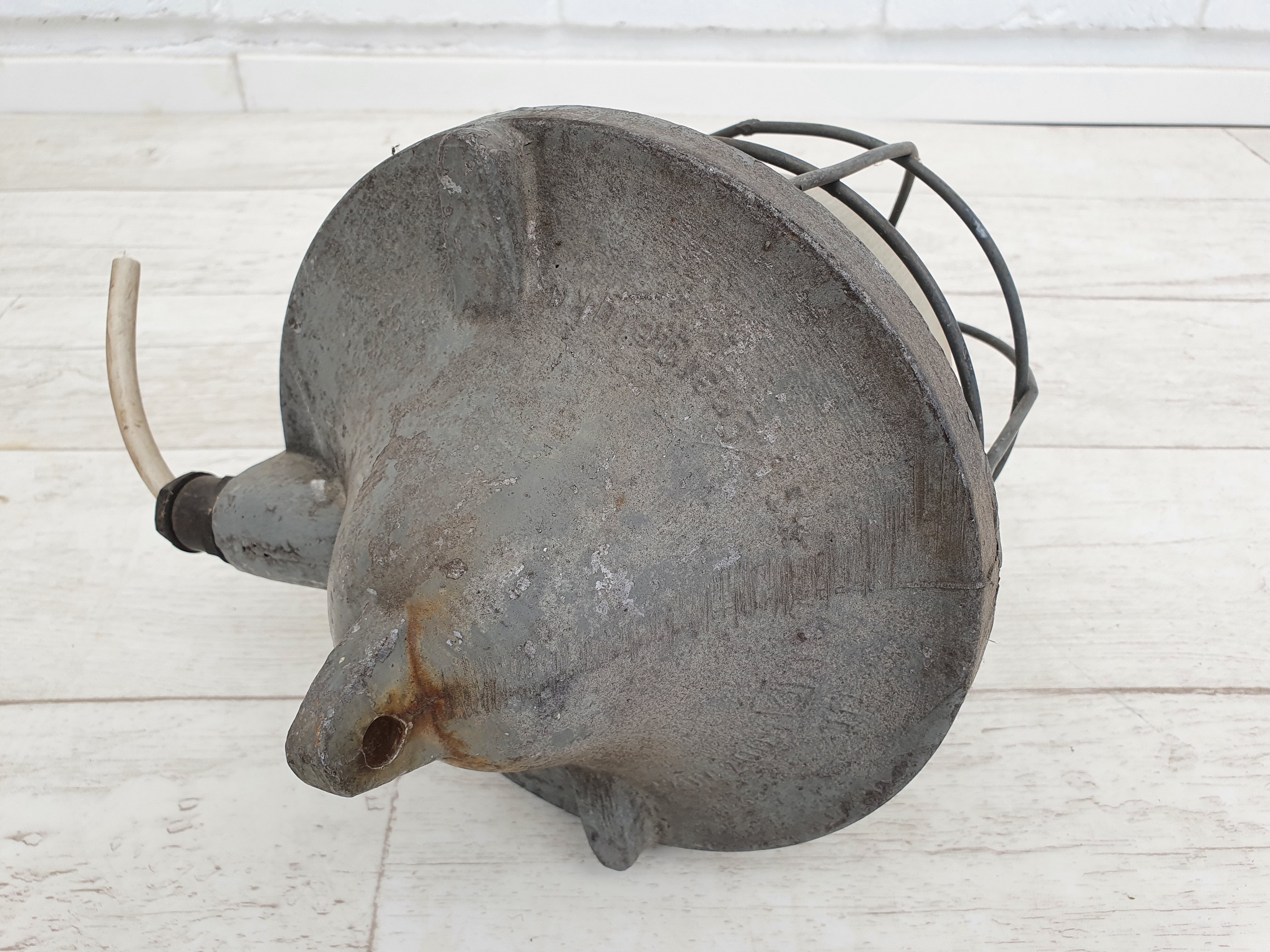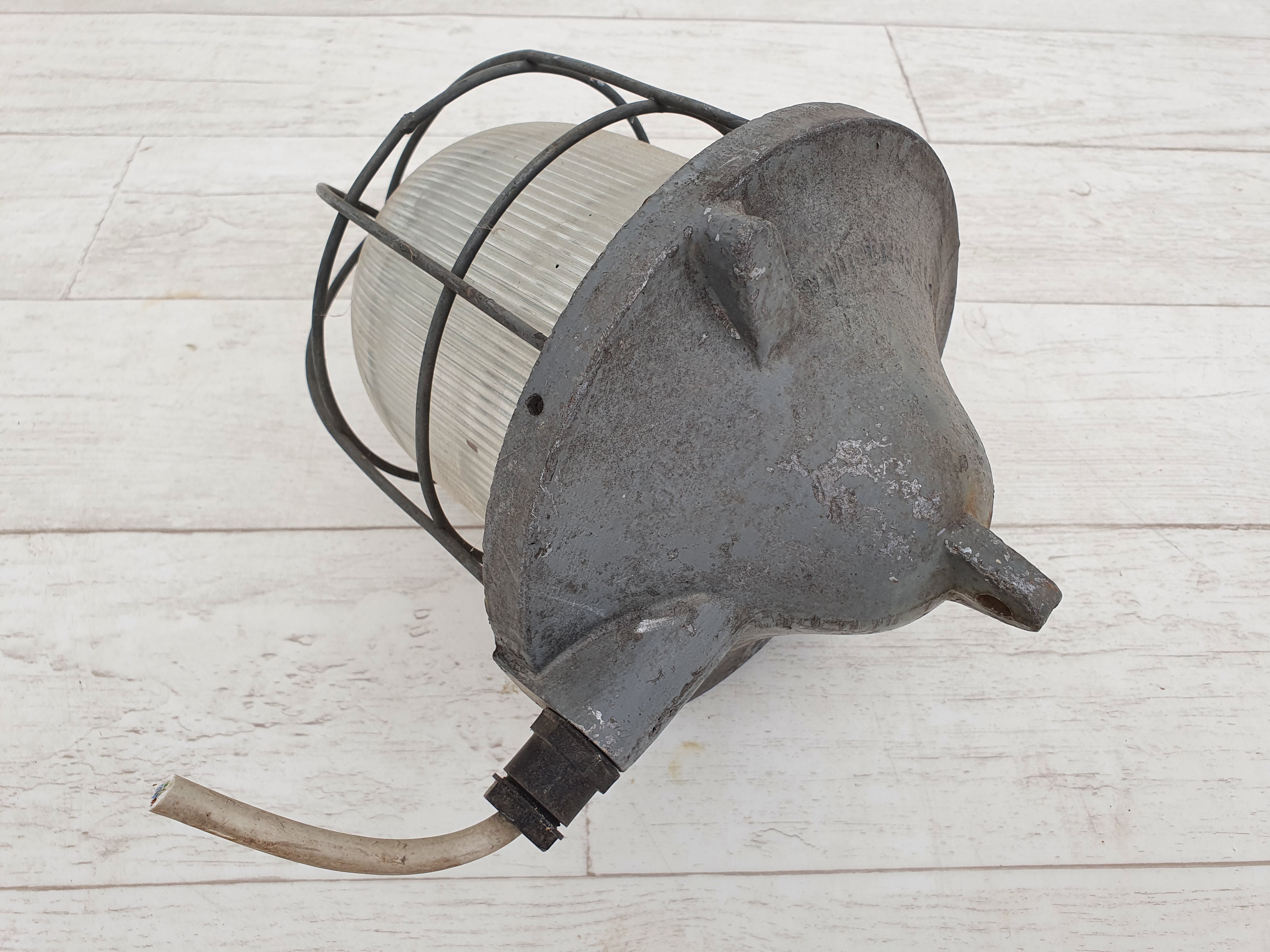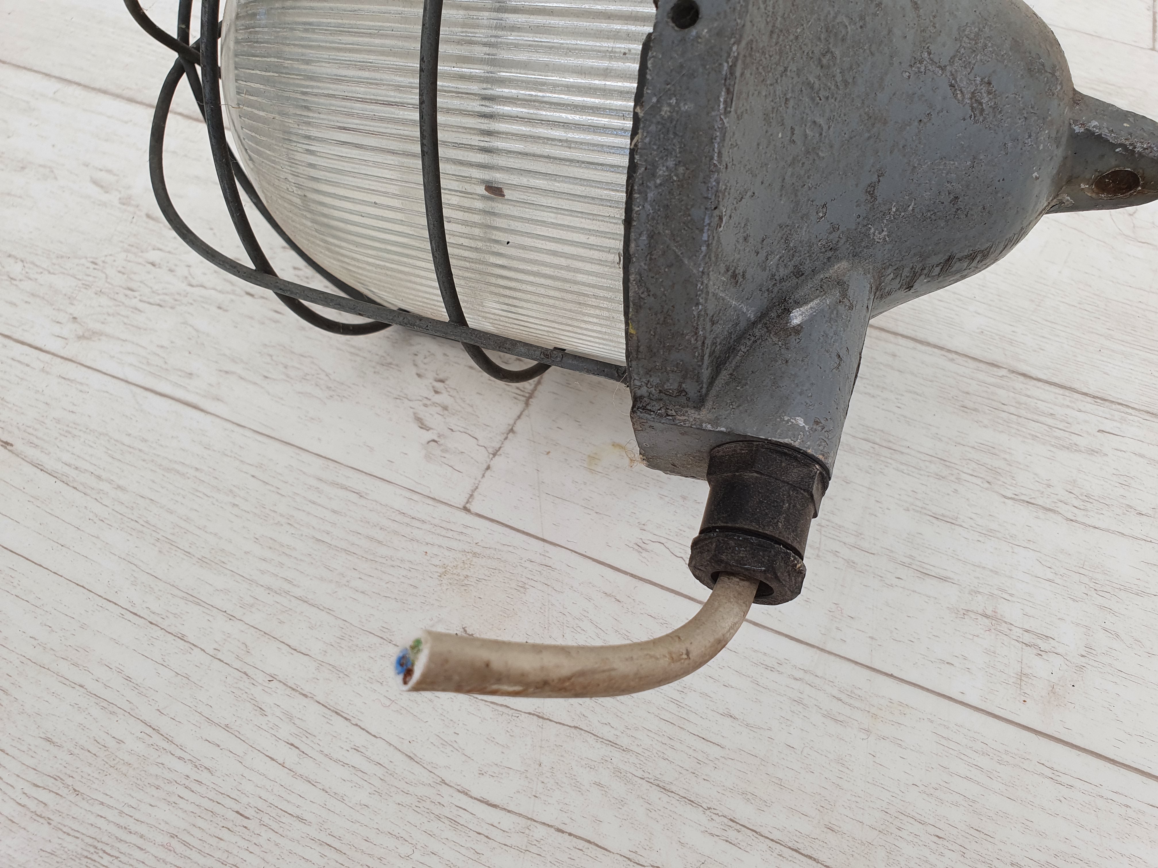 Gammel pendel, industriel værkstedslampe, glaskuppel, 60s