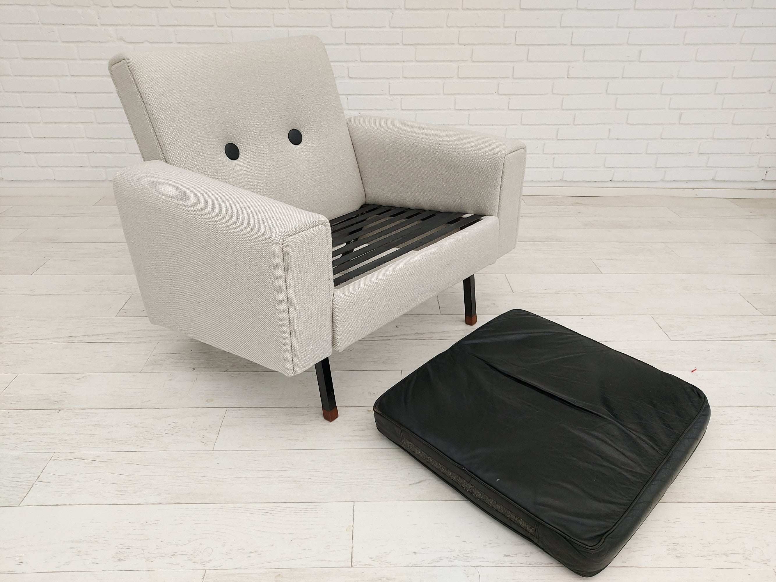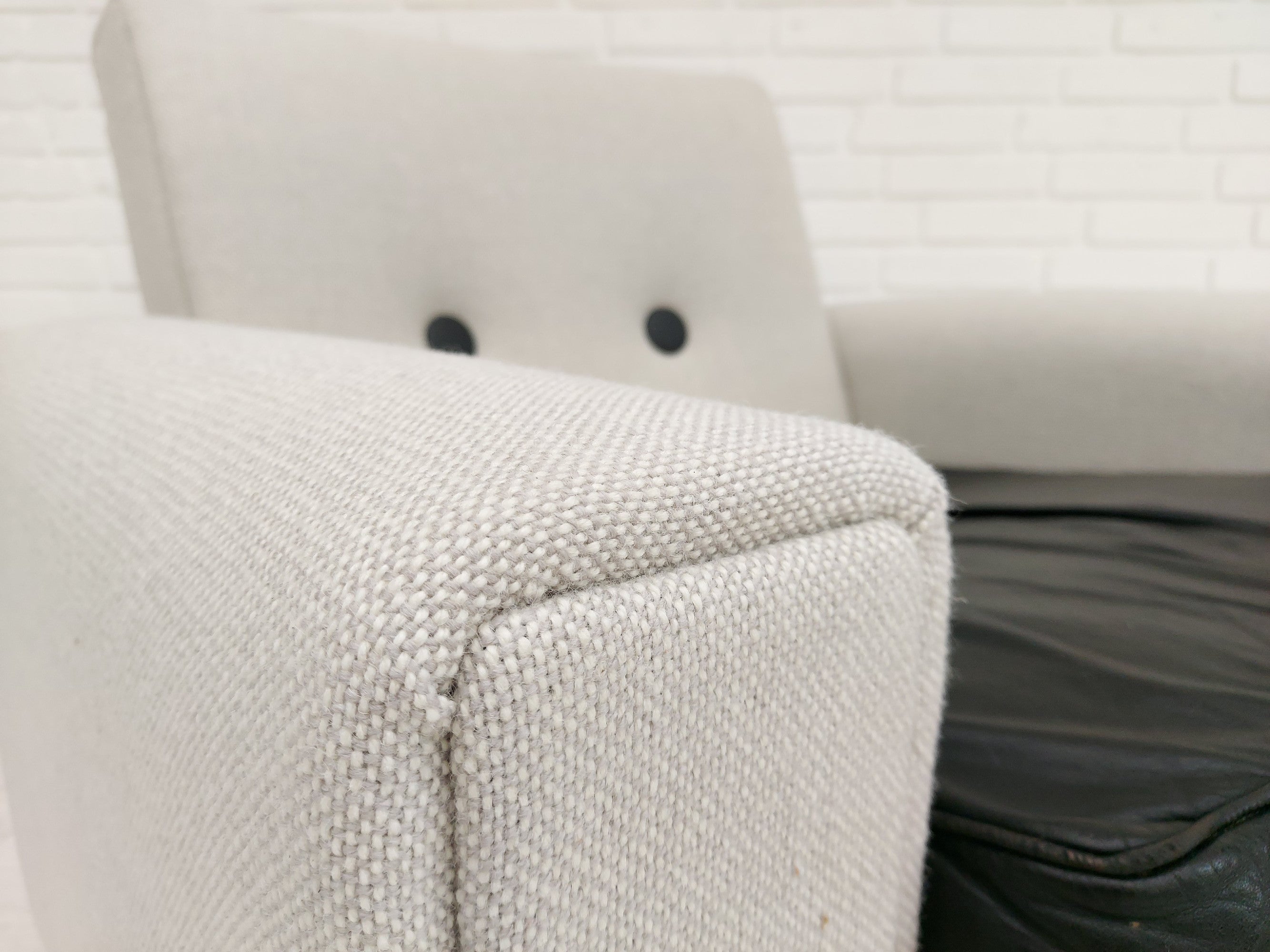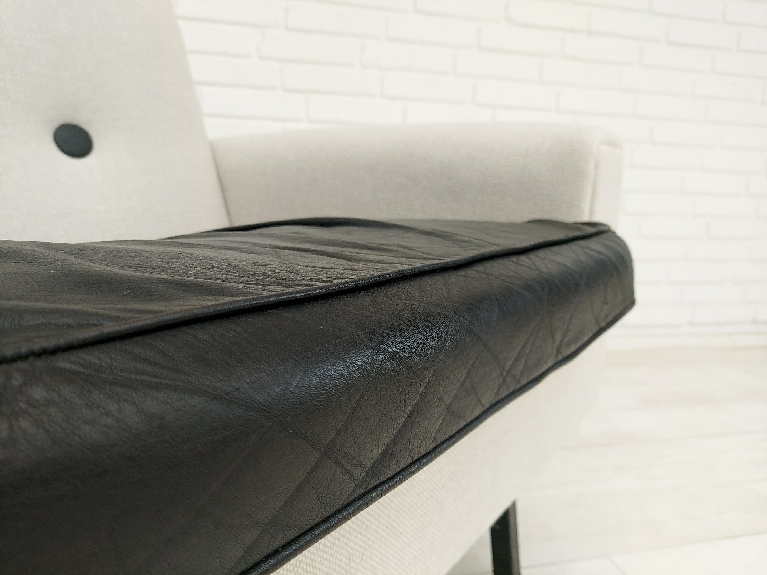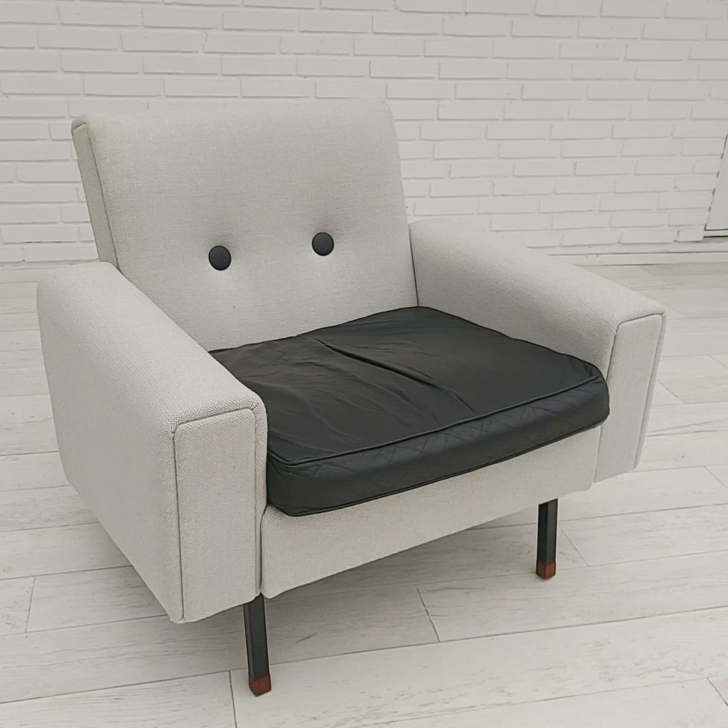 Total renoveret unik Dansk lænestol. Fremstillet af Dansk møbelproducent i ca 1970. Kvalitets KVADRAT møbeluld Hallingdal 103. Helt ny polstring. Helt ny løse sædehynde med original sort læder betræk. Sort kunst læder knapper. Metal ben, pulver lakeret i sort farve med bejdset træpropper.