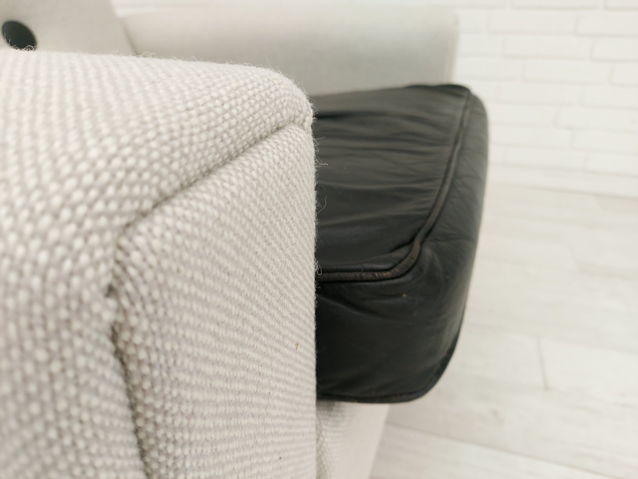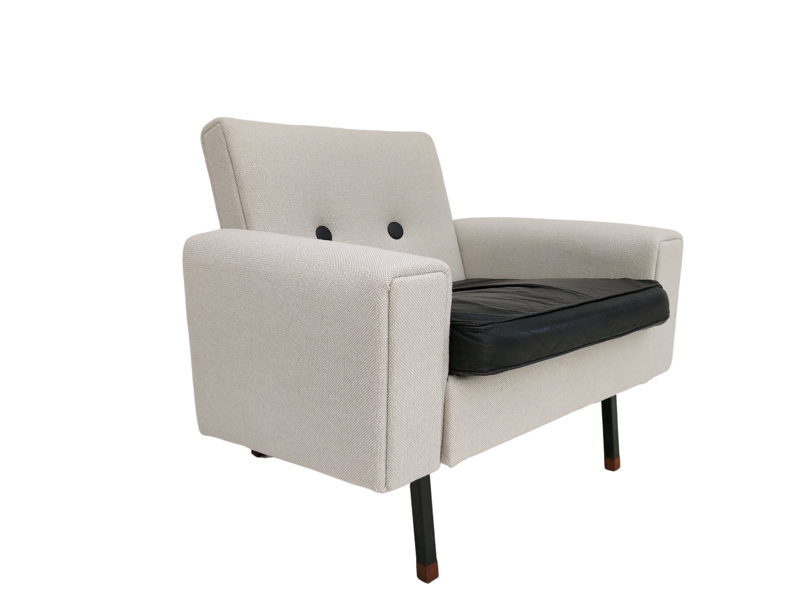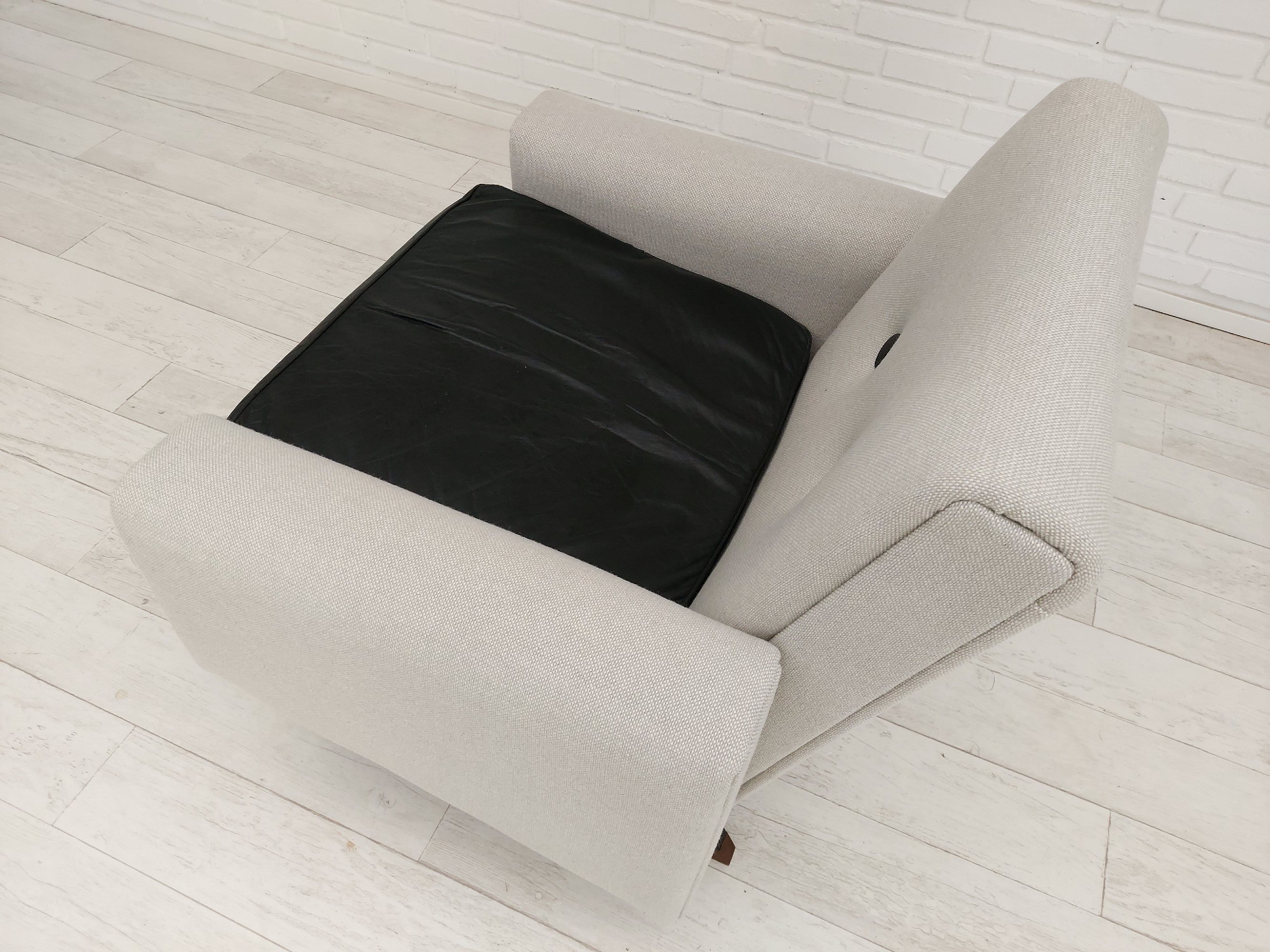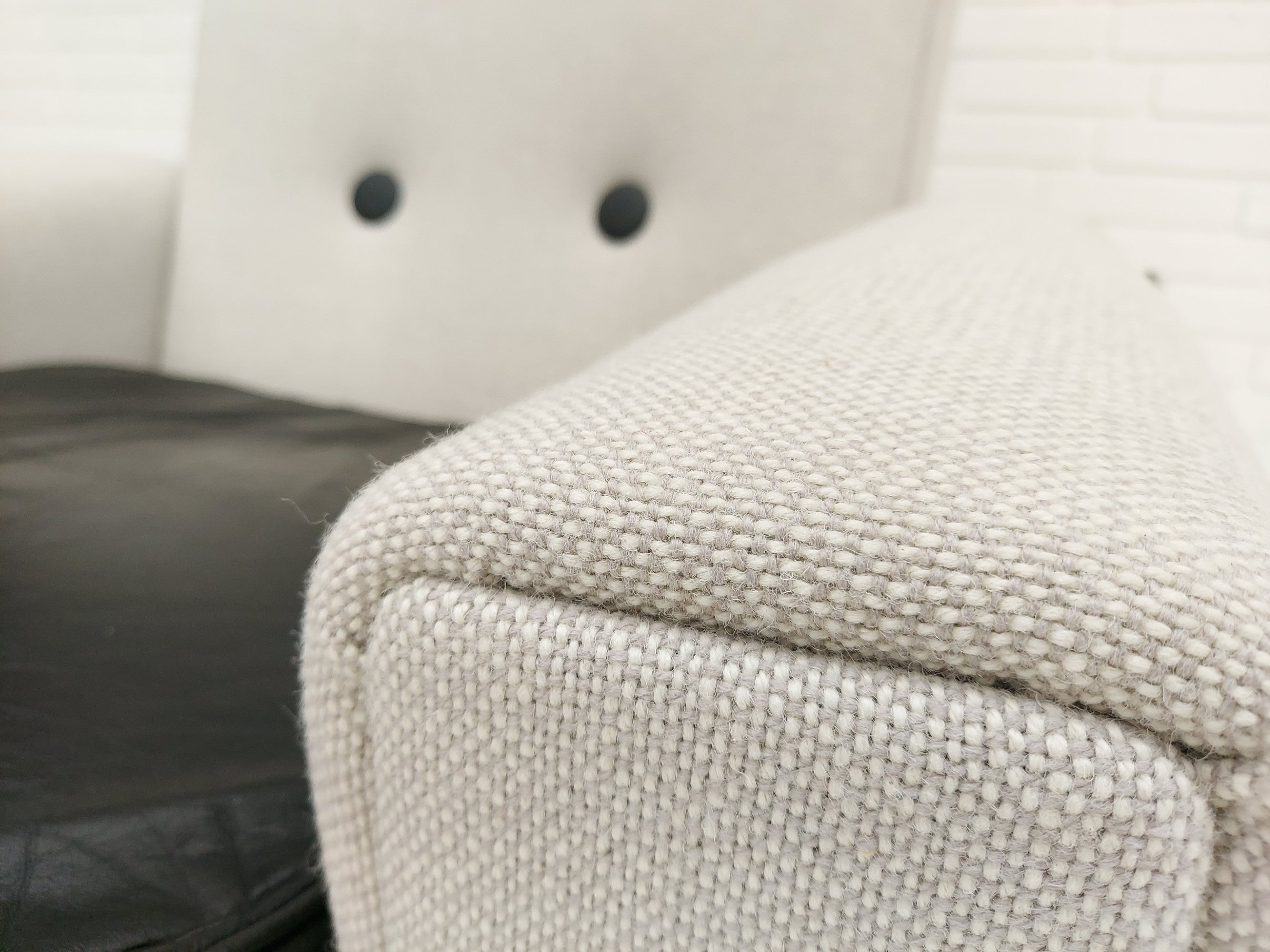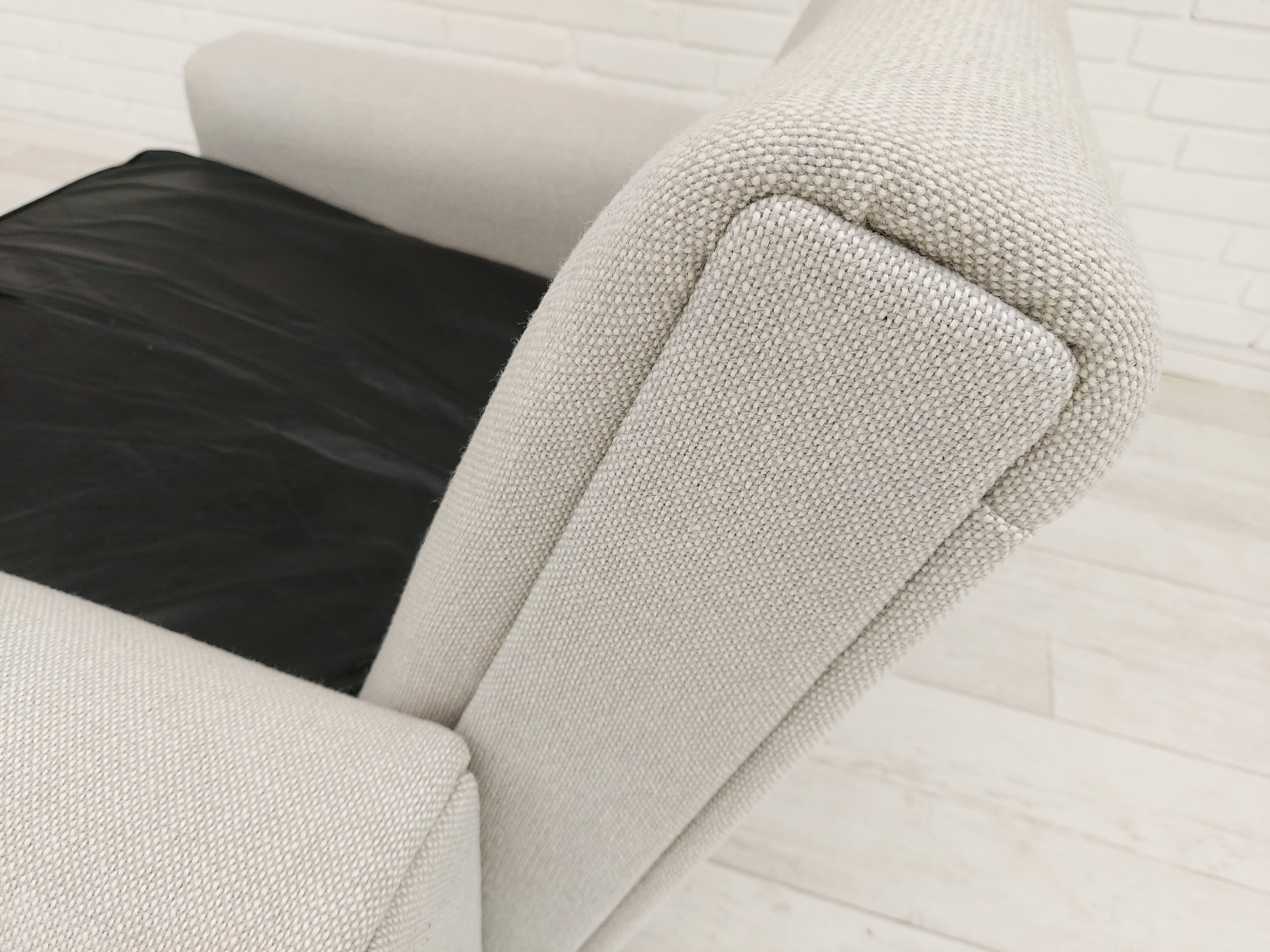 Total renoveret unik Dansk lænestol. Fremstillet af Dansk møbelproducent i ca 1970. Kvalitets KVADRAT møbeluld Hallingdal 103. Helt ny polstring. Helt ny løse sædehynde med original sort læder betræk. Sort kunst læder knapper. Metal ben, pulver lakeret i sort farve med bejdset træpropper.