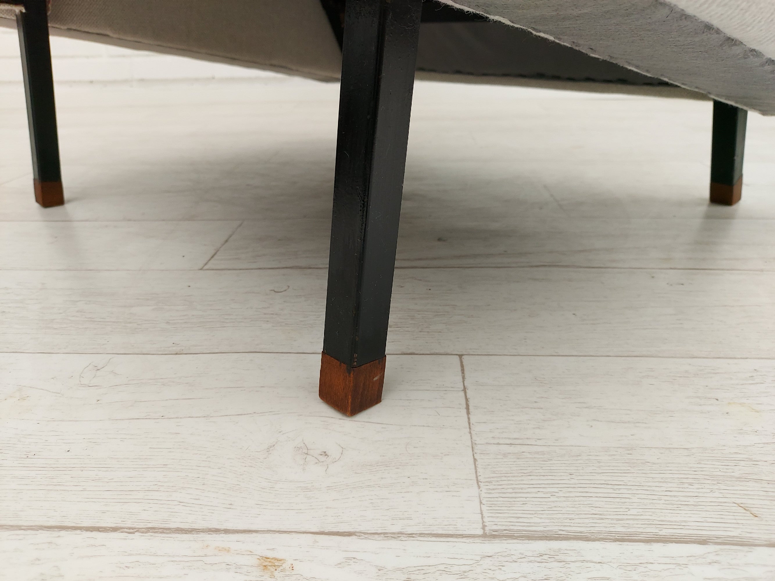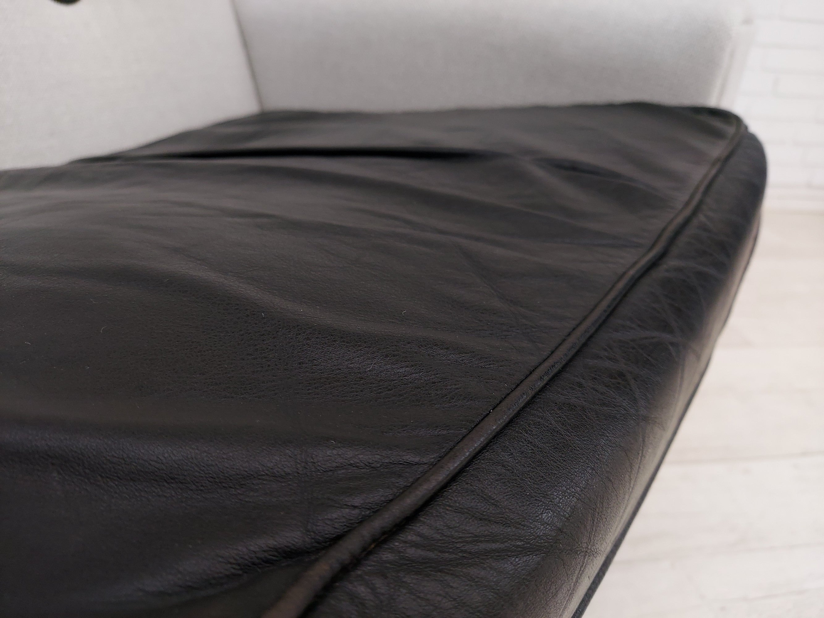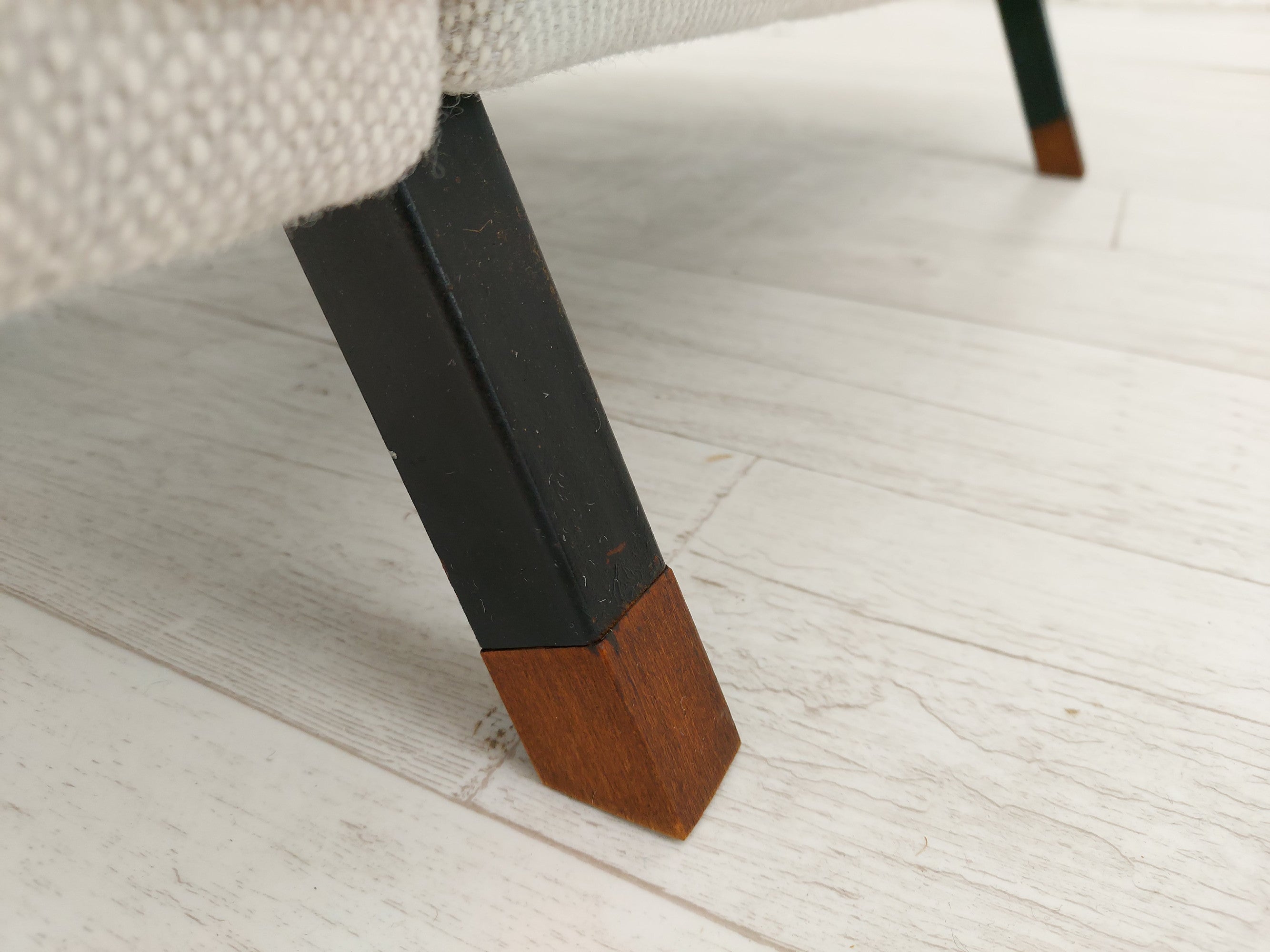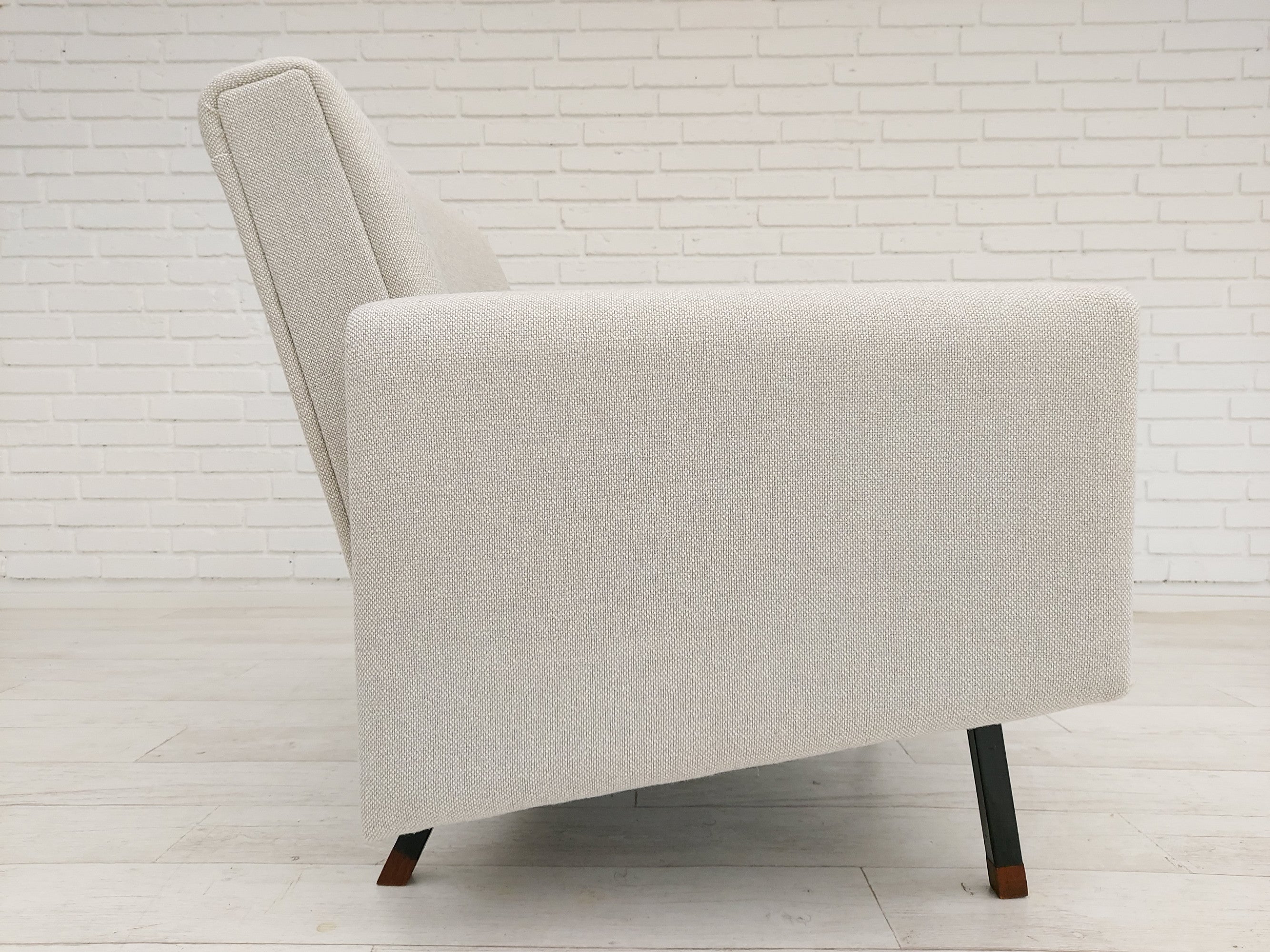 Total renoveret unik Dansk lænestol. Fremstillet af Dansk møbelproducent i ca 1970. Kvalitets KVADRAT møbeluld Hallingdal 103. Helt ny polstring. Helt ny løse sædehynde med original sort læder betræk. Sort kunst læder knapper. Metal ben, pulver lakeret i sort farve med bejdset træpropper.