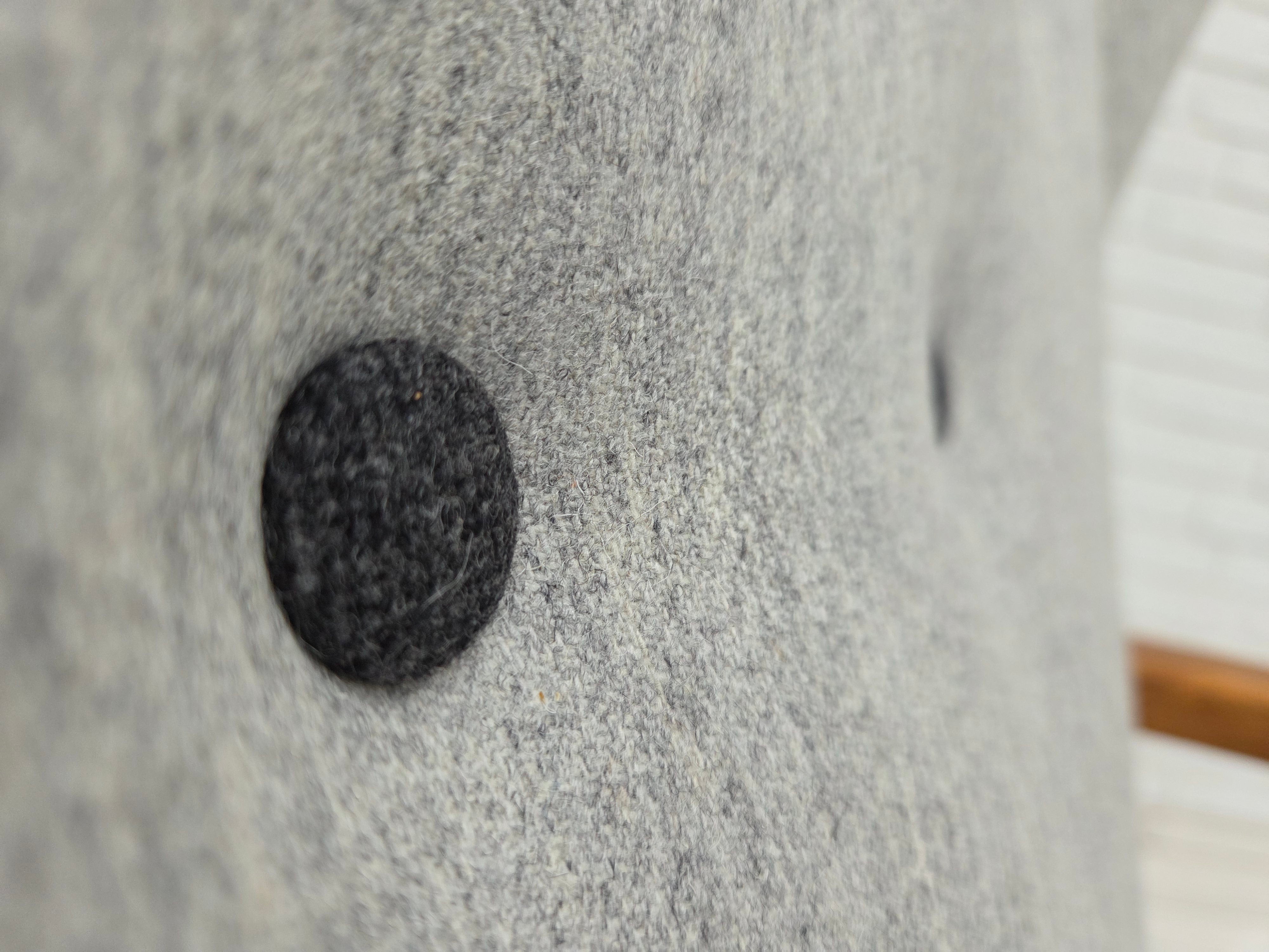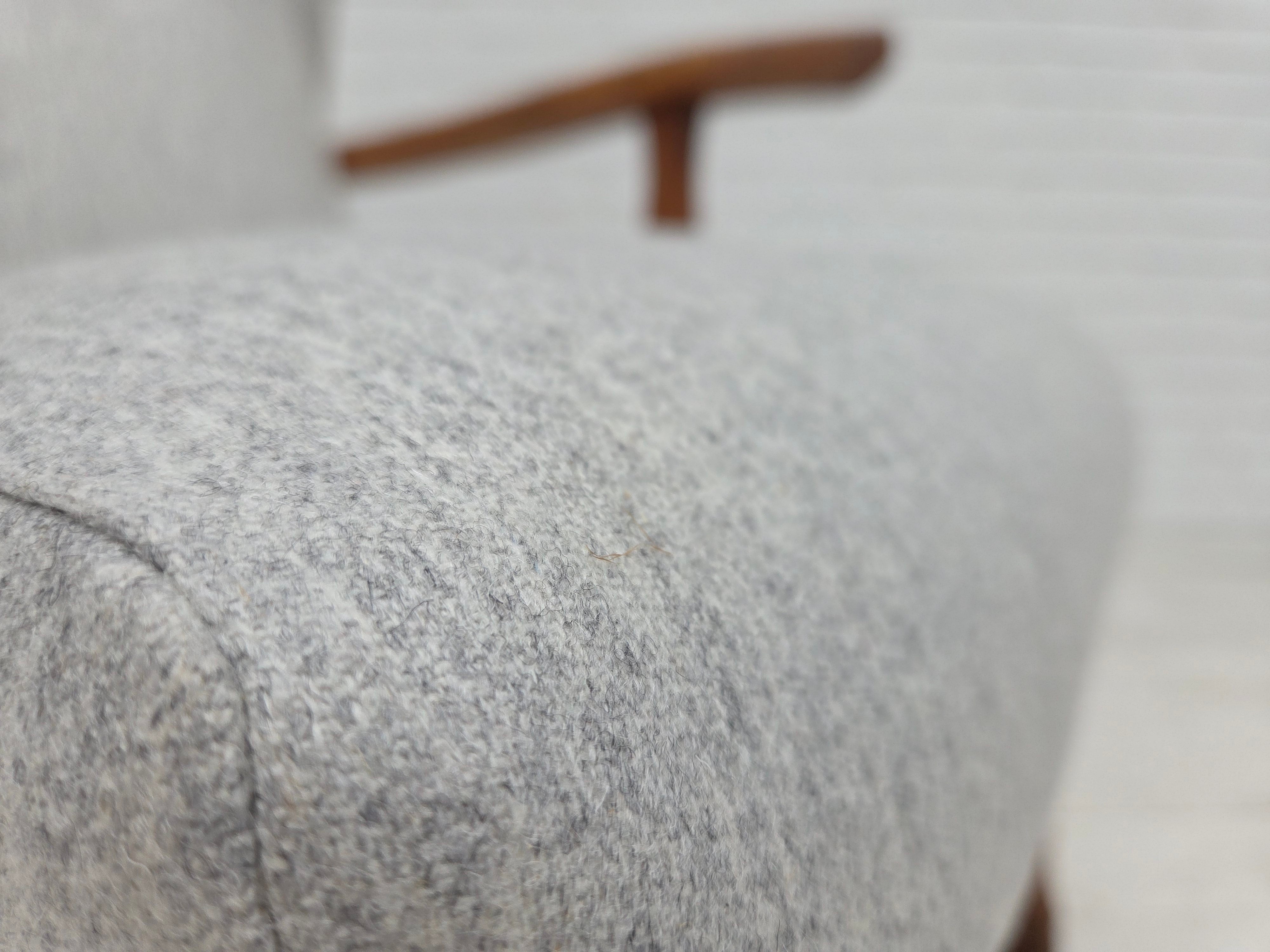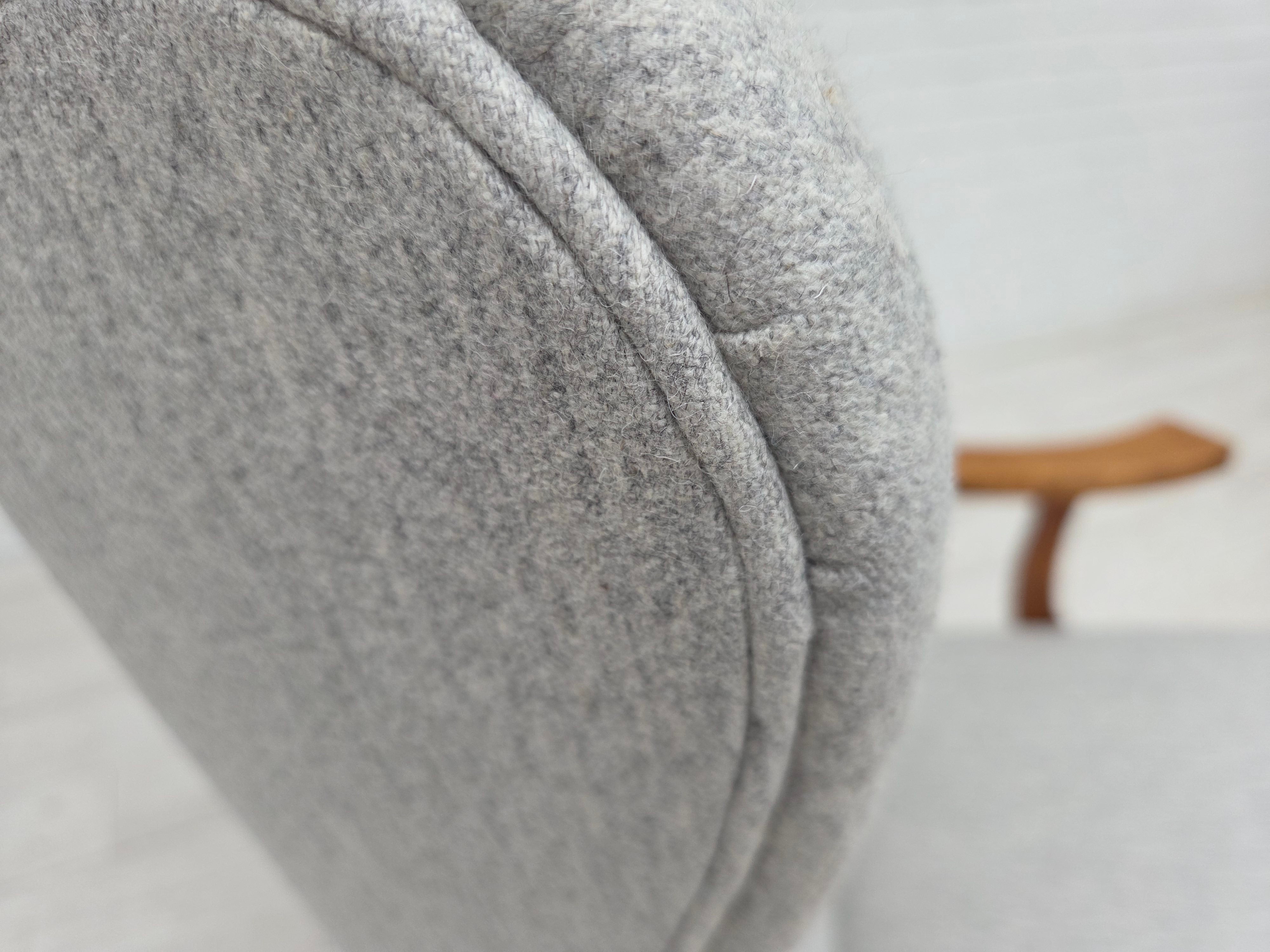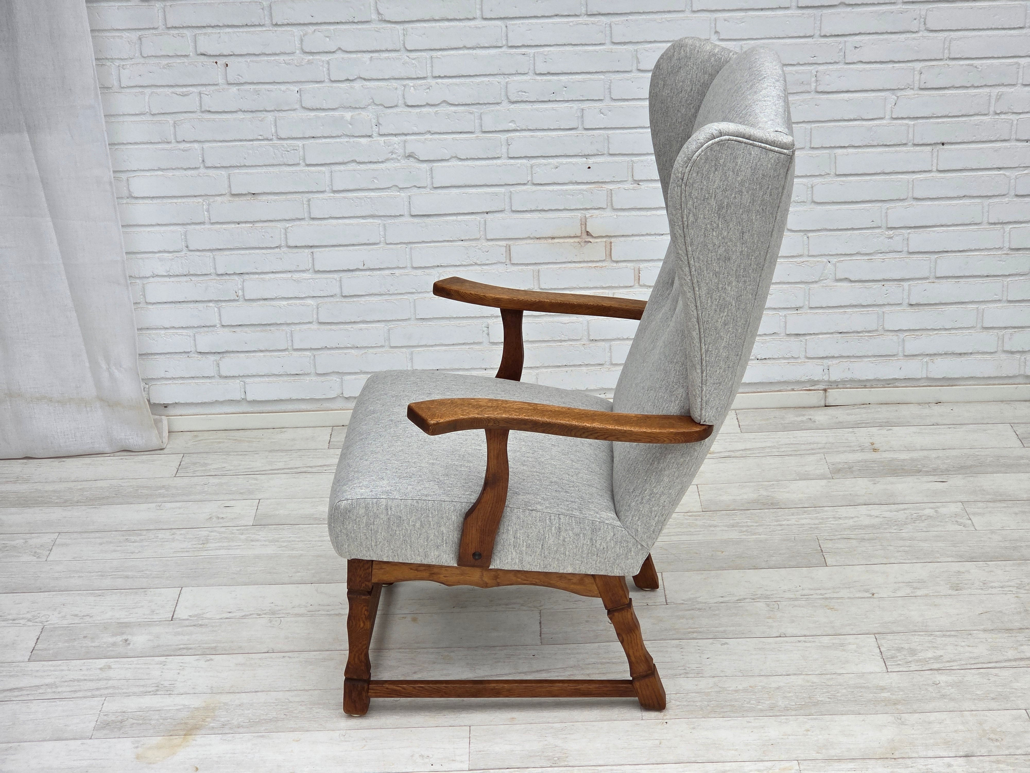1950erne, Dansk højrygget lænestol. Total renoveret i kvalitets lysegrå møbeluld. Massiv egtræ fornyet. Helt ny polstring. Fremstillet af Dansk møbelproducent i ca. 1950-55erne. Reupholsteret hos Retro Møbler Galleri af professionel møbelpolstrer, håndværker.