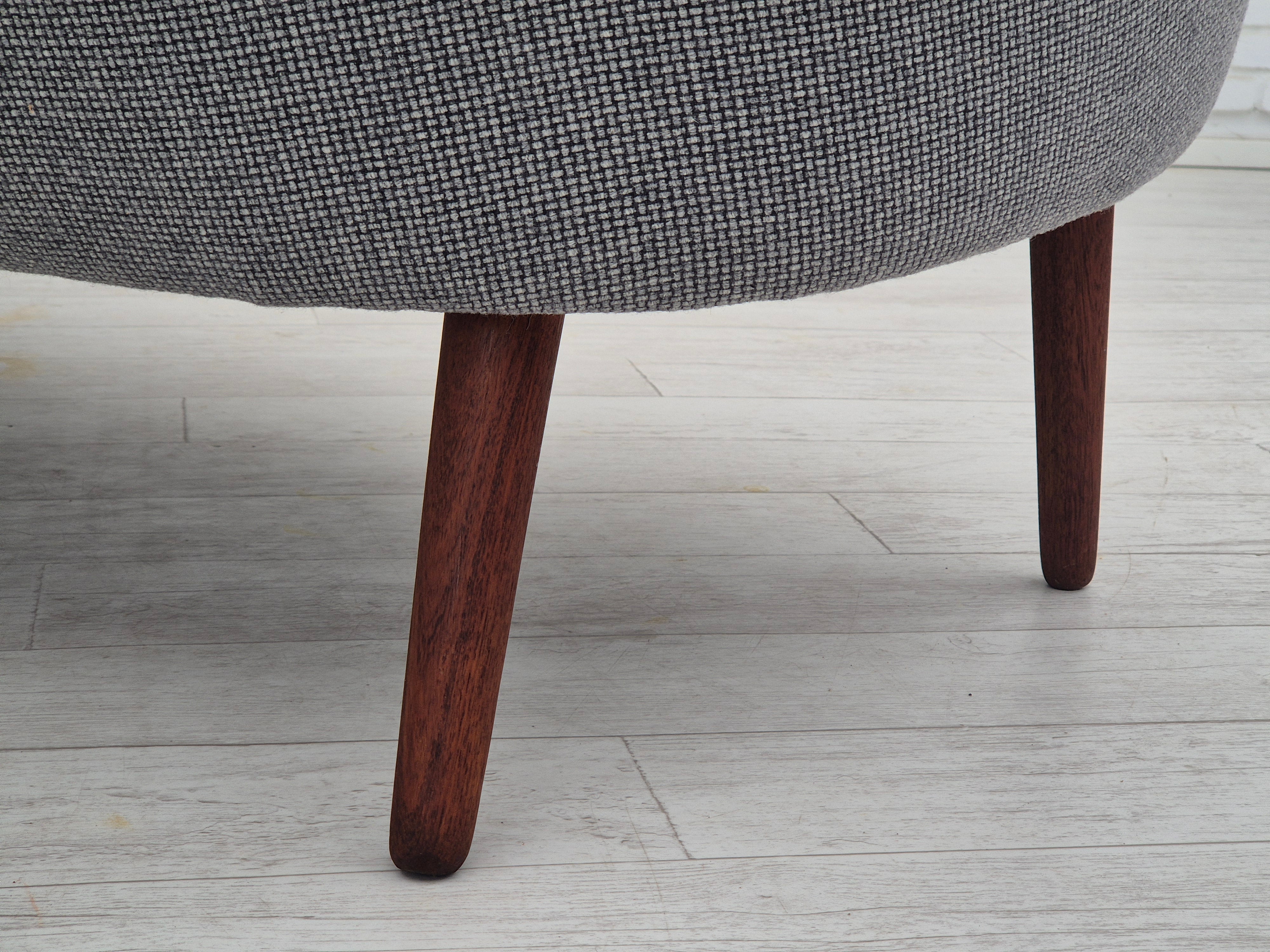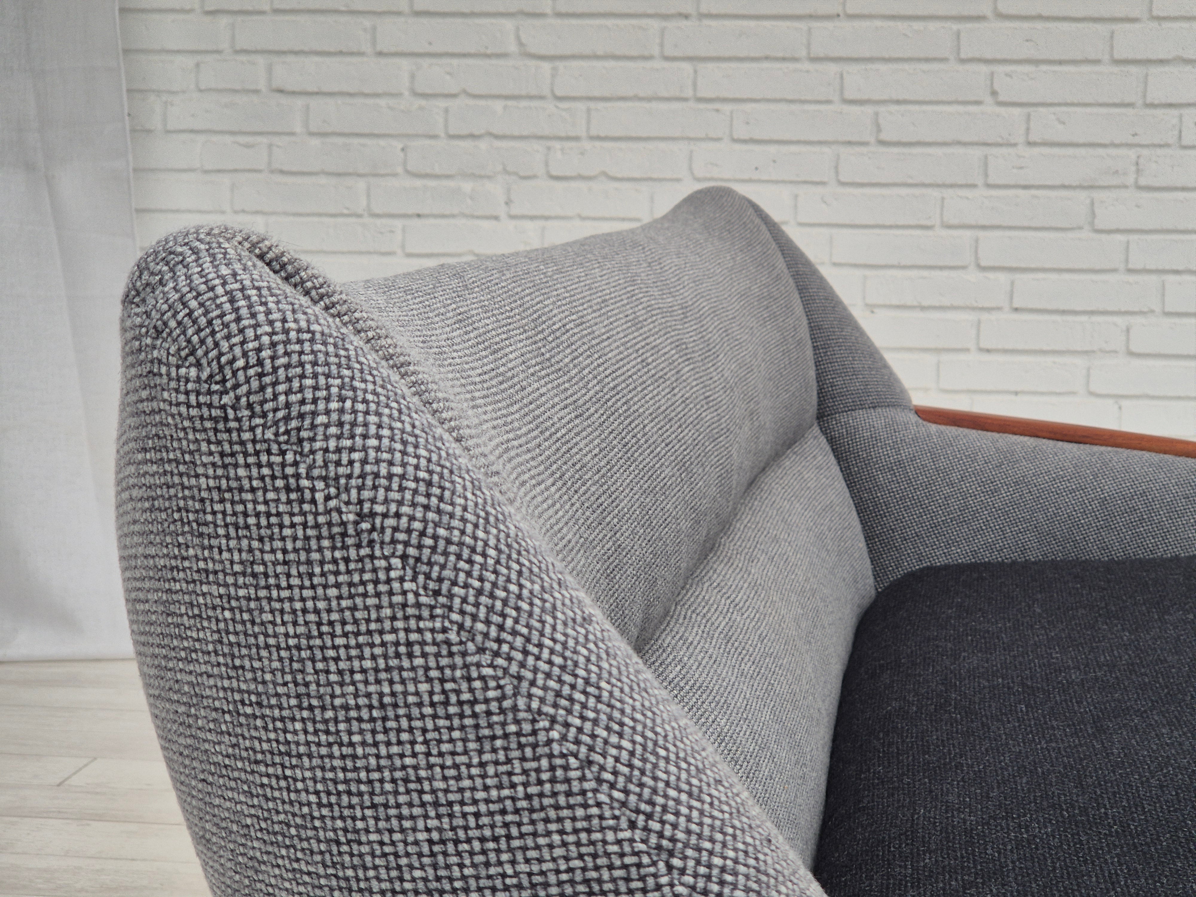 1960erne, Dansk sofa af Kurt Østervig model 58 er færdig. Total renovering: ny polstring, ny elastik gjorde, træ konstruktion er tjekket, ben og armlæn er fornyet, helt ny sædehynde. Ombetrukket i kvalitets møbeluld "Glasgow" fra Nevotex i to forskellige farver. Sofa fremstillet af Dansk møbelproducent Rolschau Møbler i ca. 1960erne. Renoveret lige efter originalt design ( håndsyet elementer) hos Retro Møbler Galleri af professionel møbelpolstrer, håndværker.