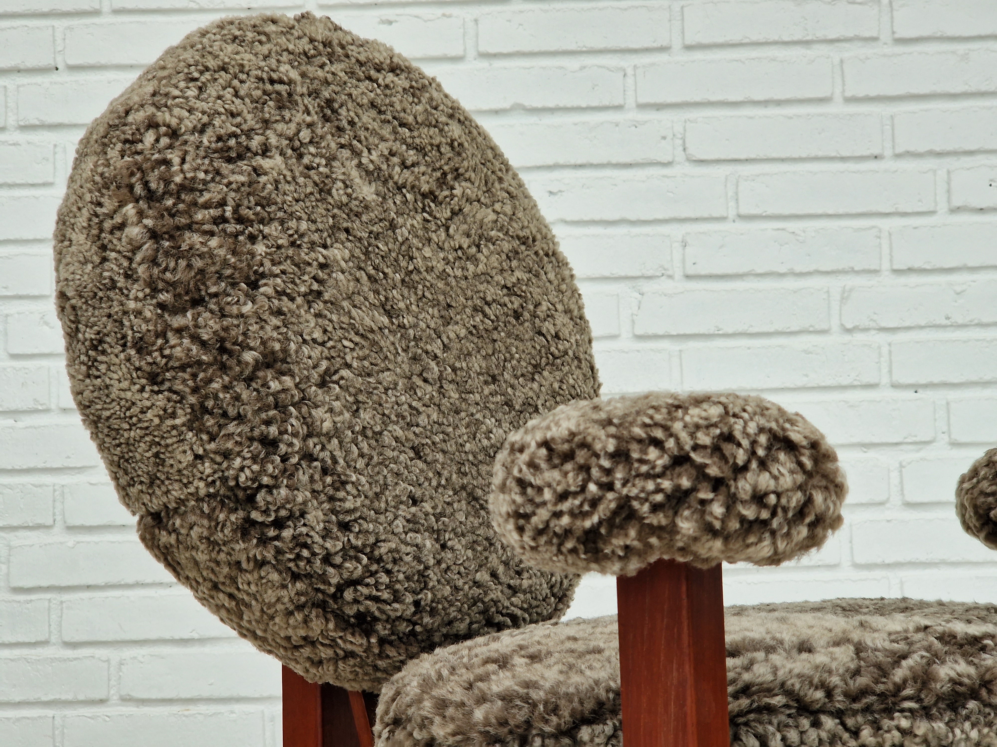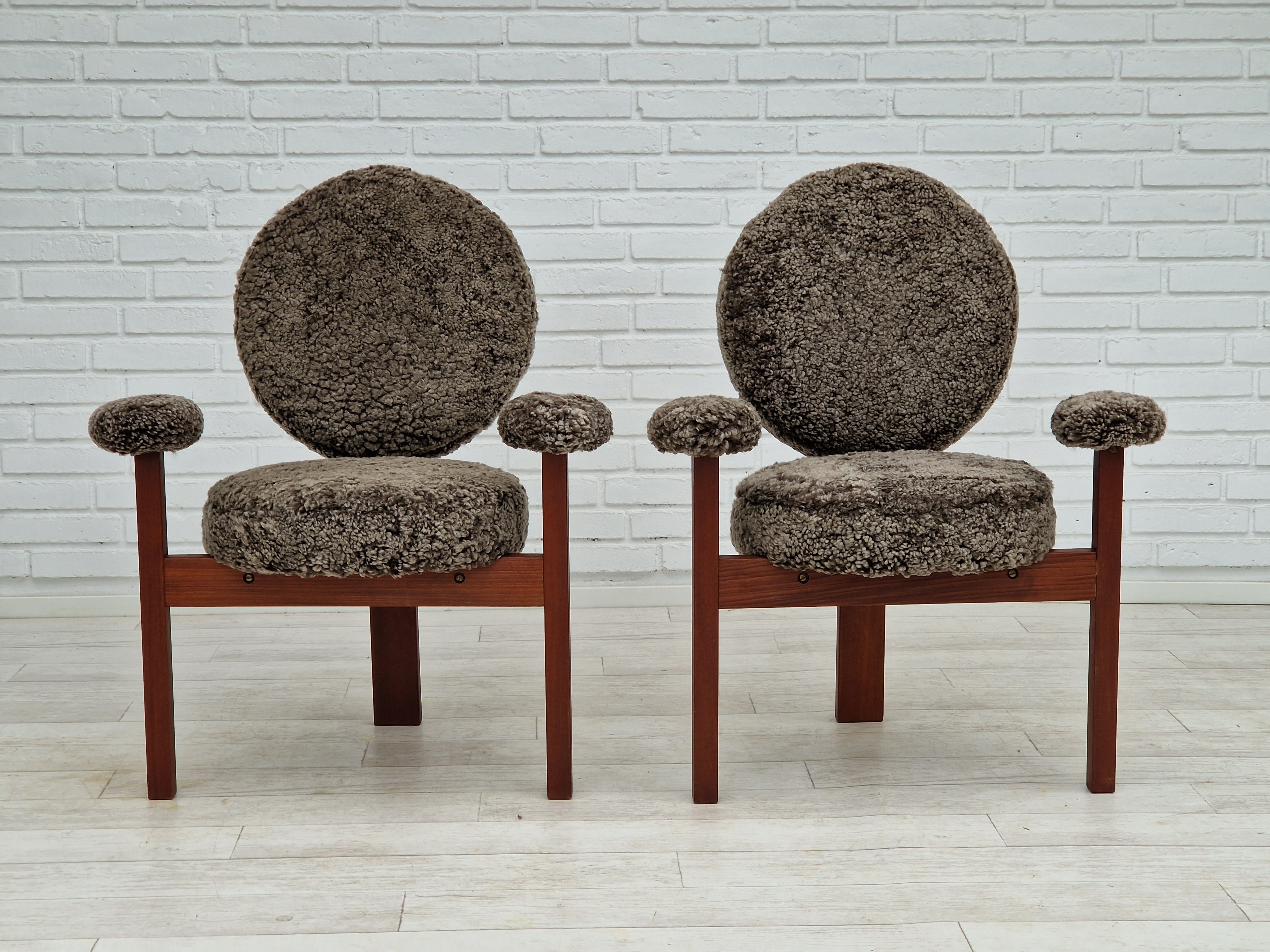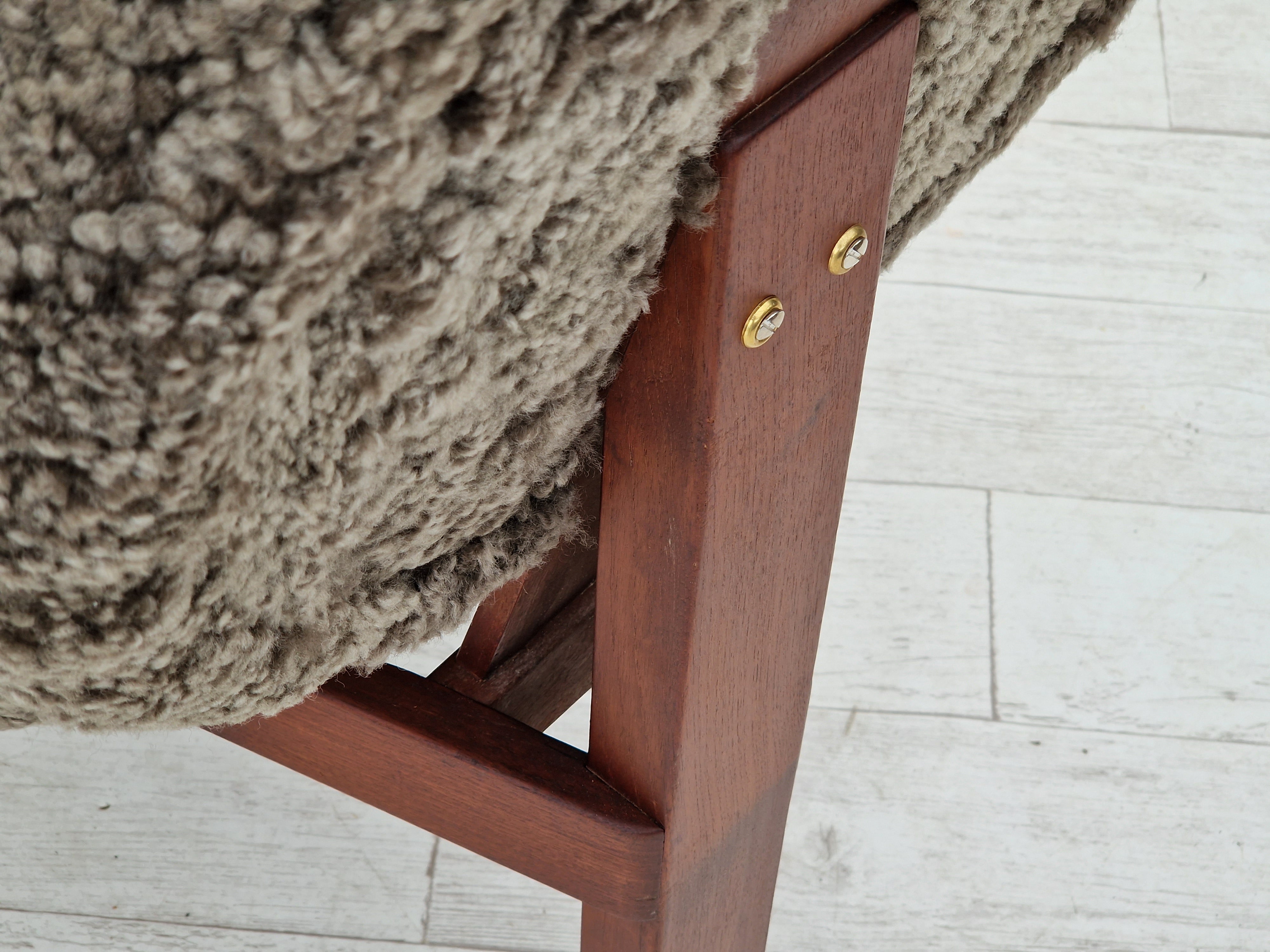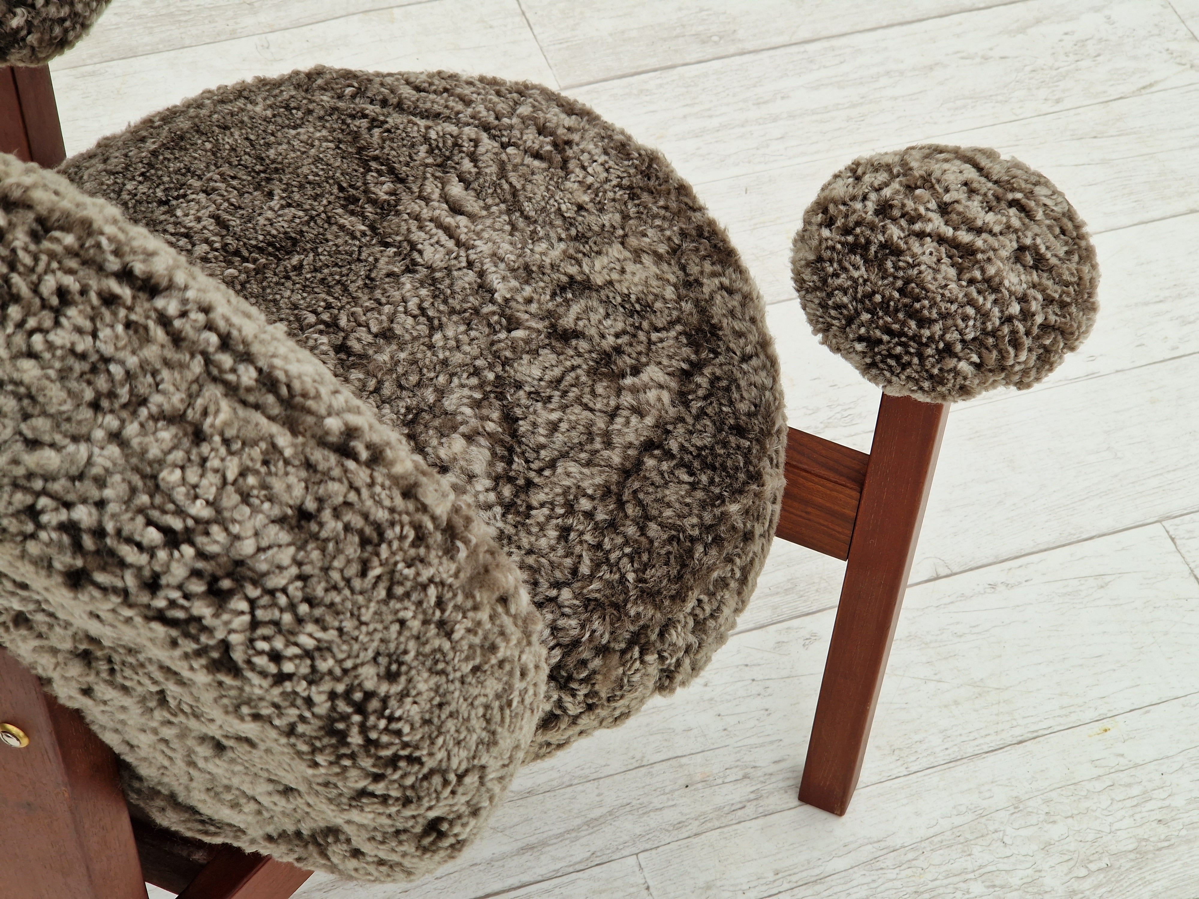 1960erne, Dansk design af Bent Møller Jepsen. Total renoveret armstole model "Medalie". Stel af massivt teaktræ, runde hynder samt armlæn betrukket med kvalitets ægte fåreskind Wellington. Charocal farvet. Fremstillet hos Sitamo Møbler. Formgivet 1961. Helt ny polstring med naturlig kokos måtte. Renoveret hos Retro Møbler Galleri af professionel møbelpolstrer, håndværker.