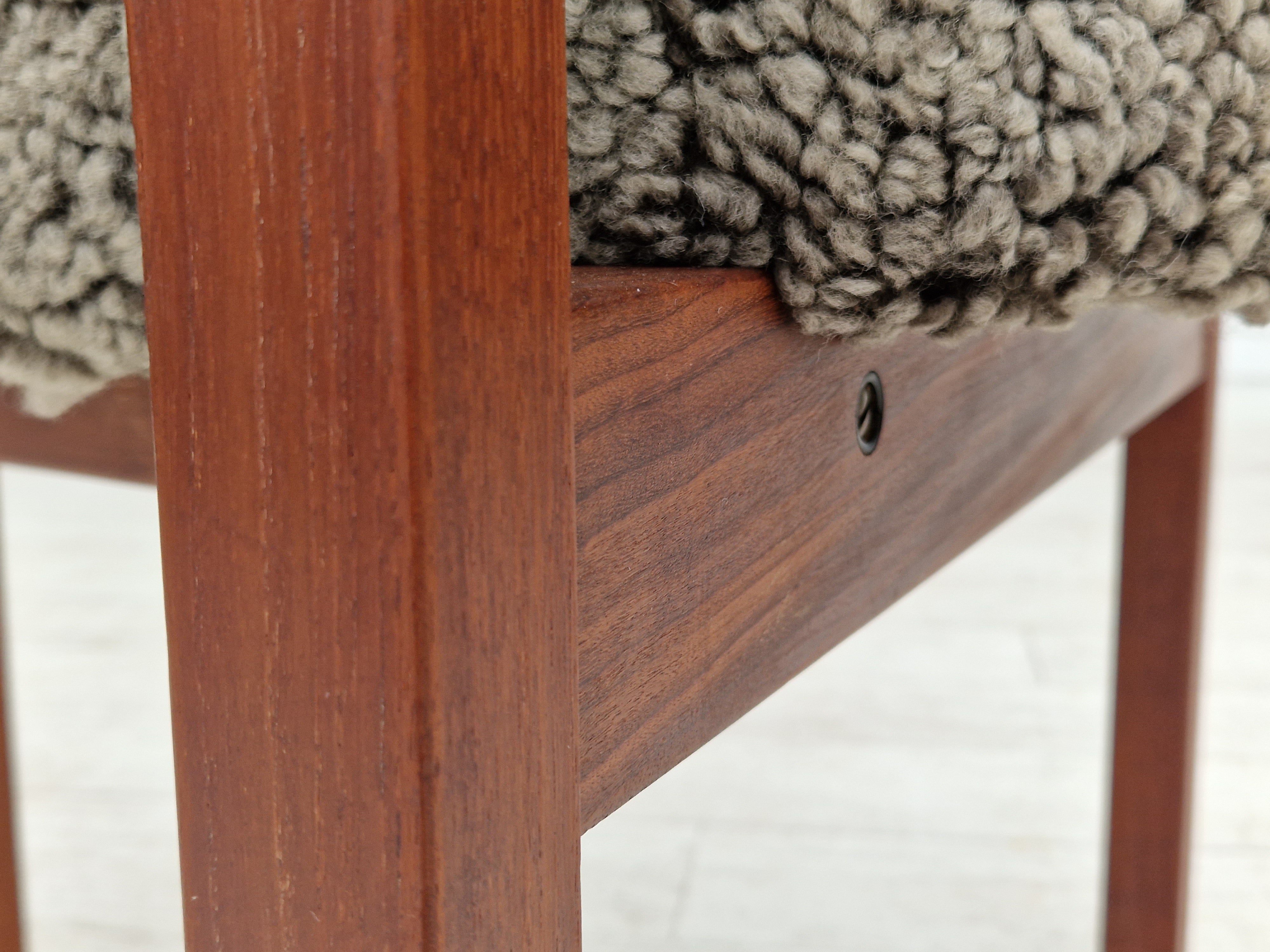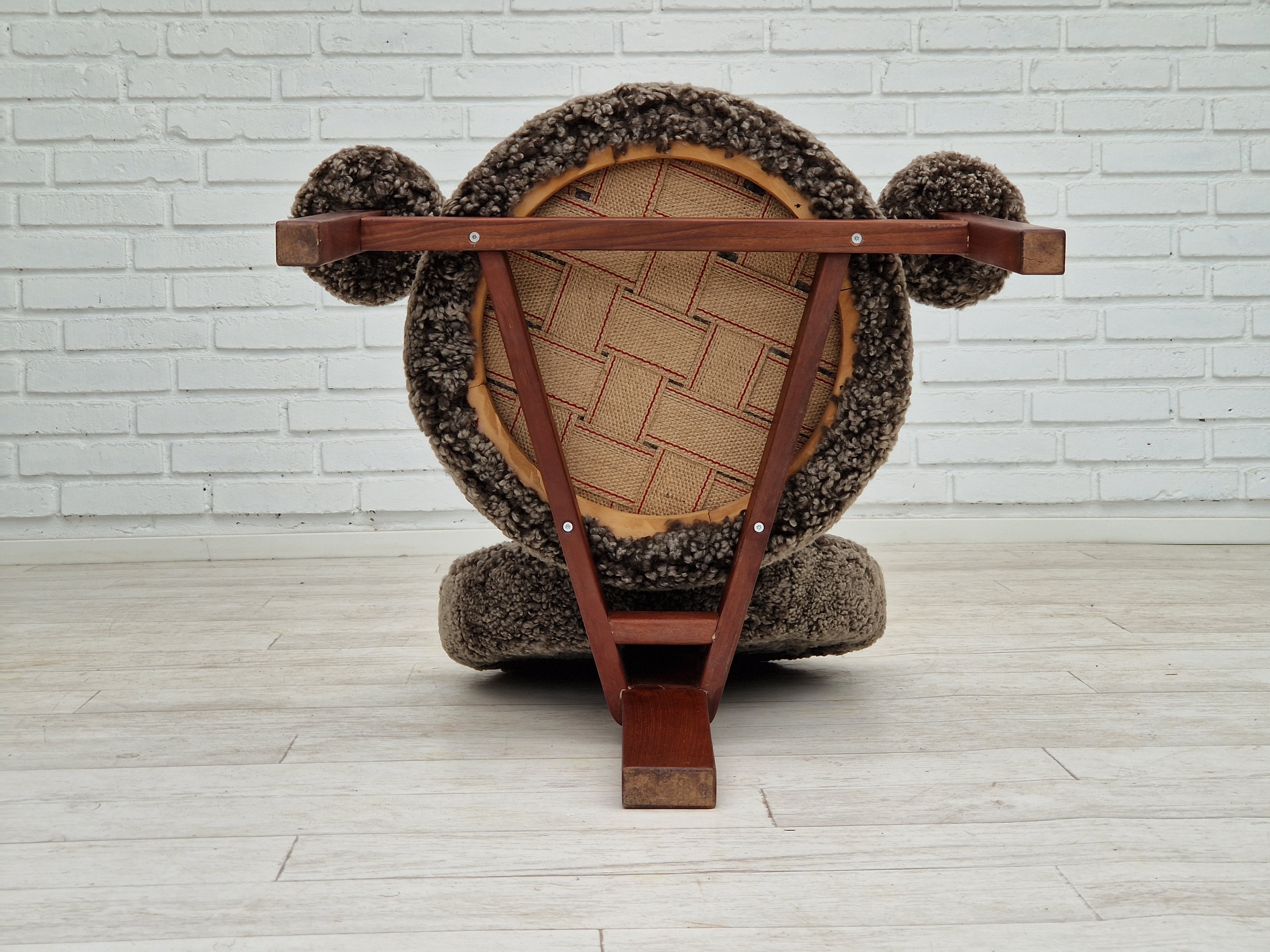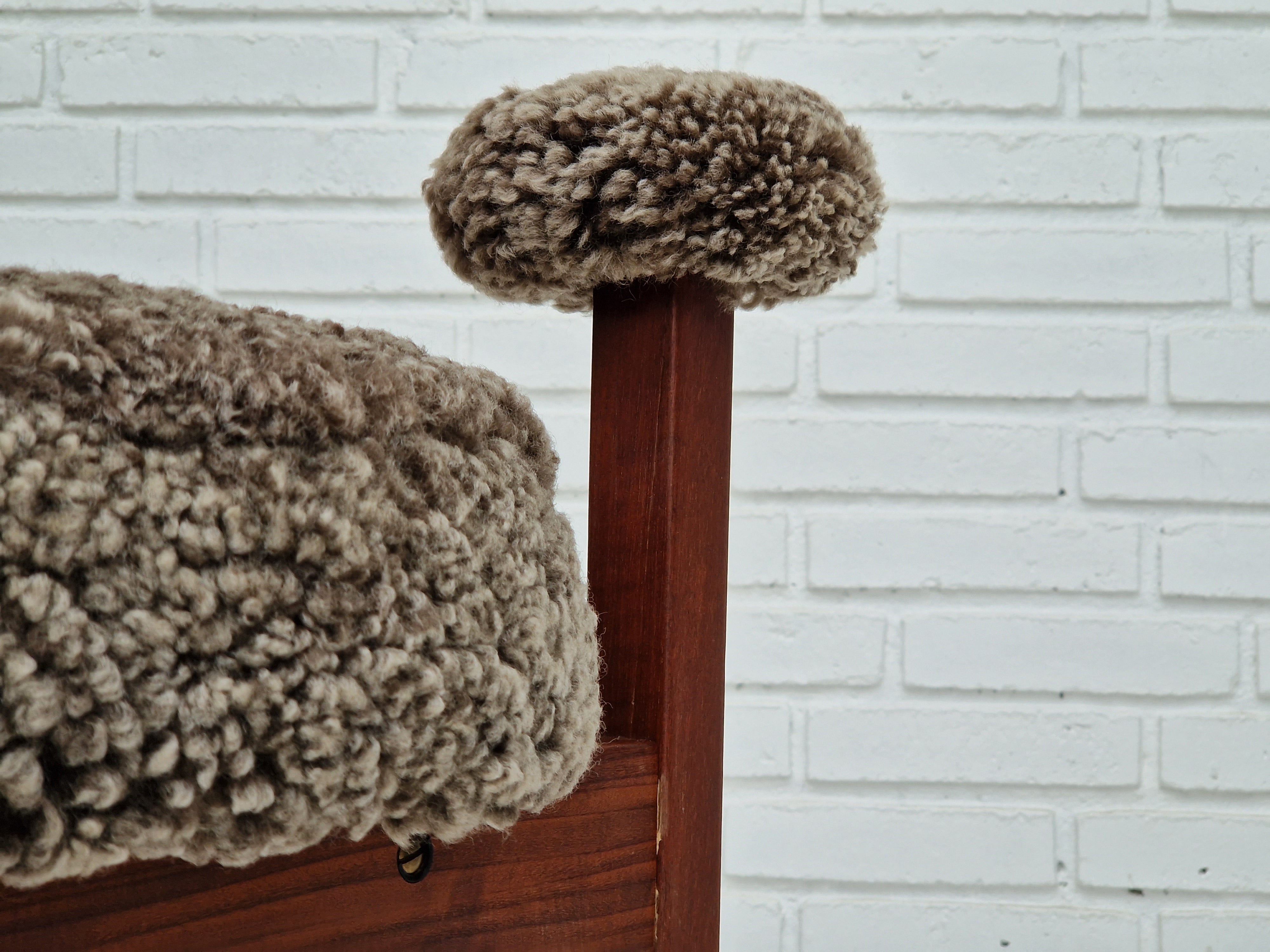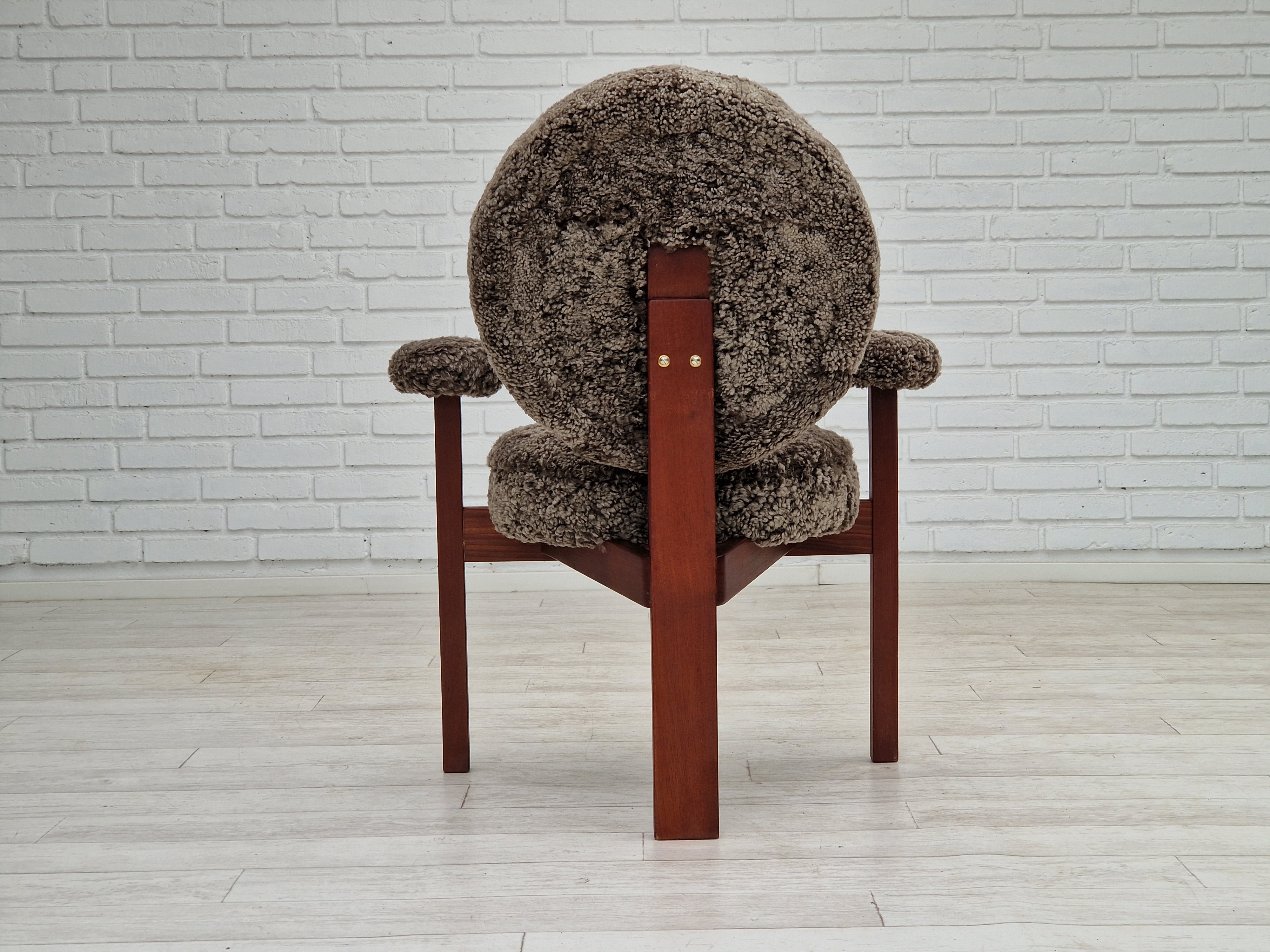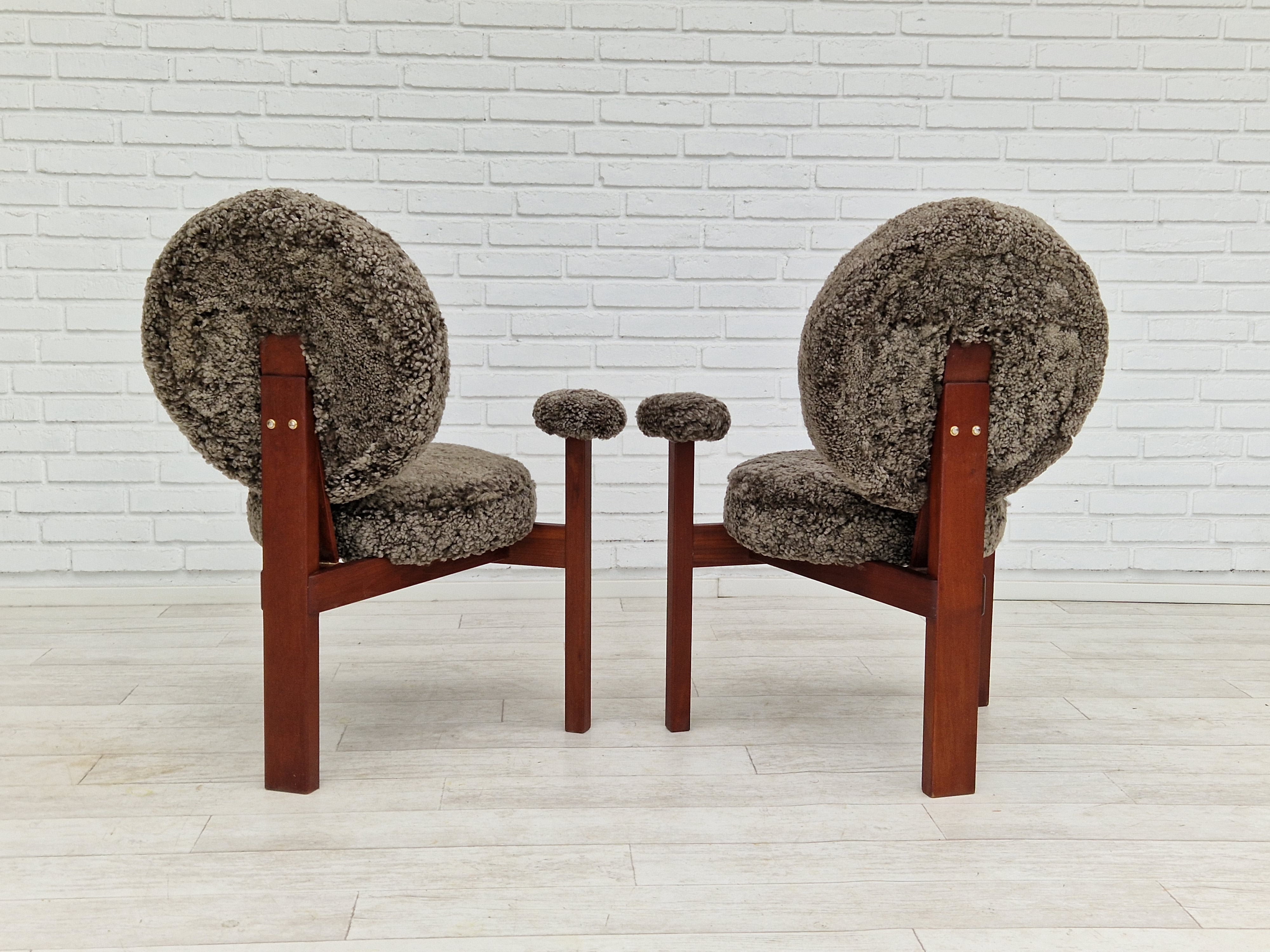1960erne, Dansk design af Bent Møller Jepsen. Total renoveret armstole model "Medalie". Stel af massivt teaktræ, runde hynder samt armlæn betrukket med kvalitets ægte fåreskind Wellington. Charocal farvet. Fremstillet hos Sitamo Møbler. Formgivet 1961. Helt ny polstring med naturlig kokos måtte. Renoveret hos Retro Møbler Galleri af professionel møbelpolstrer, håndværker.