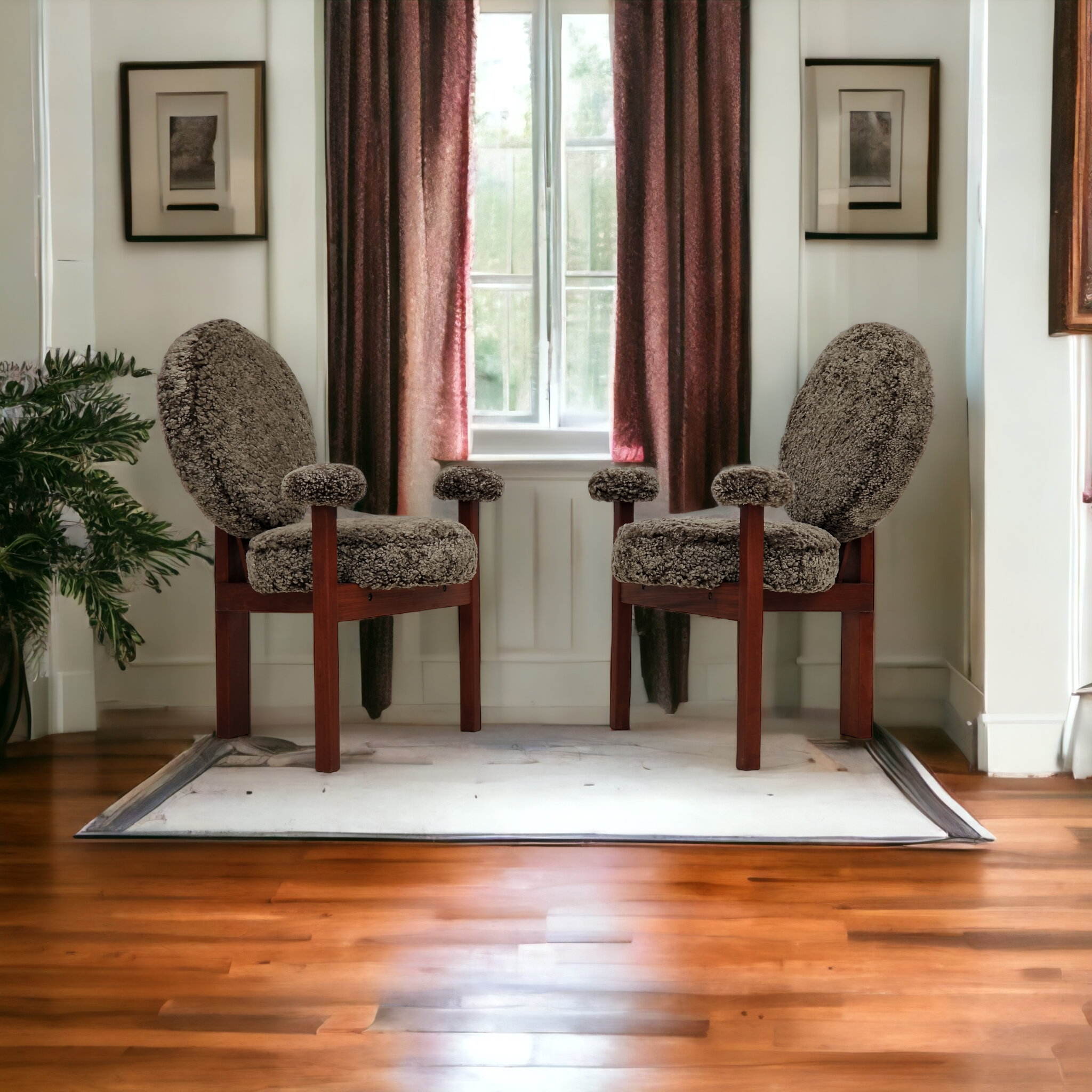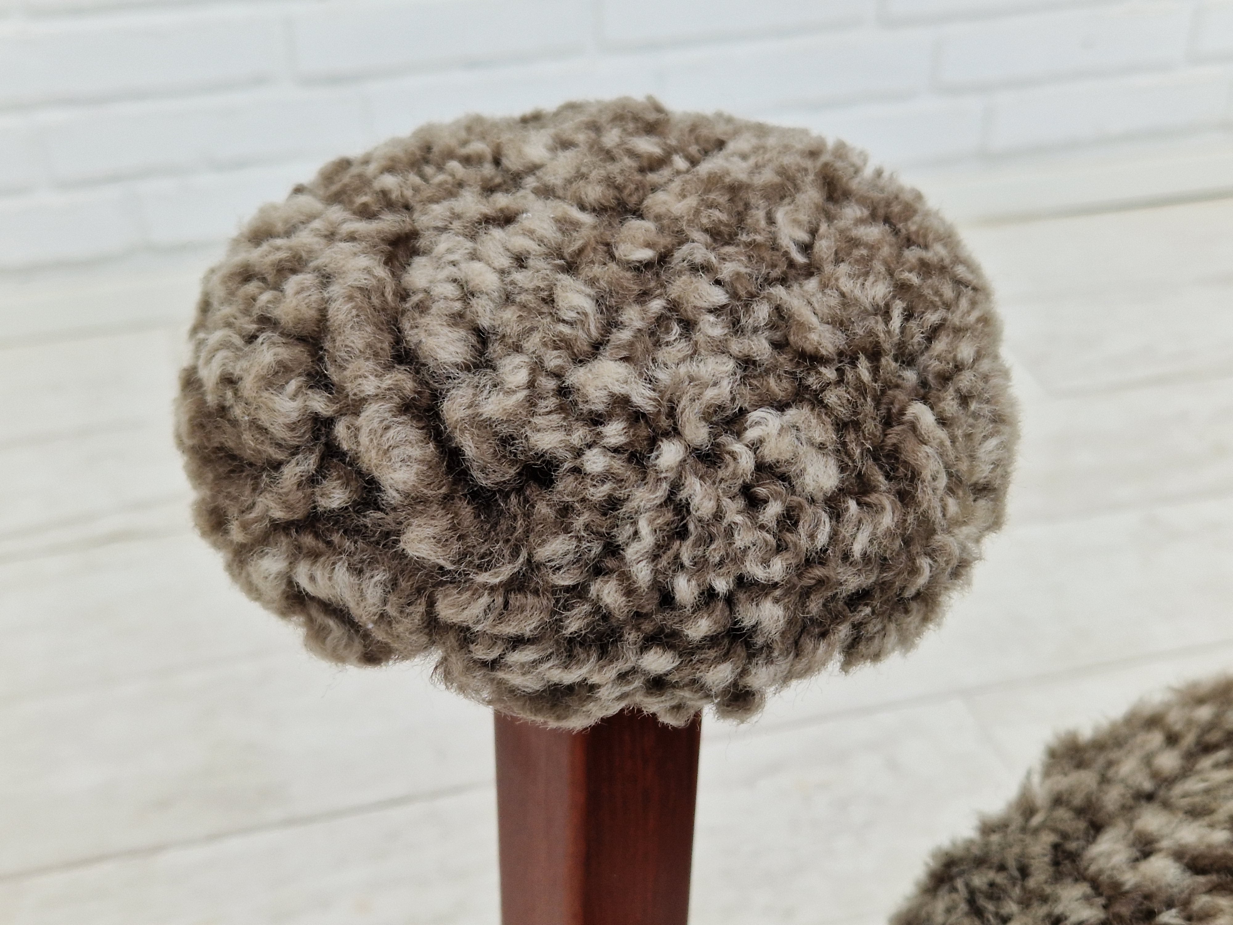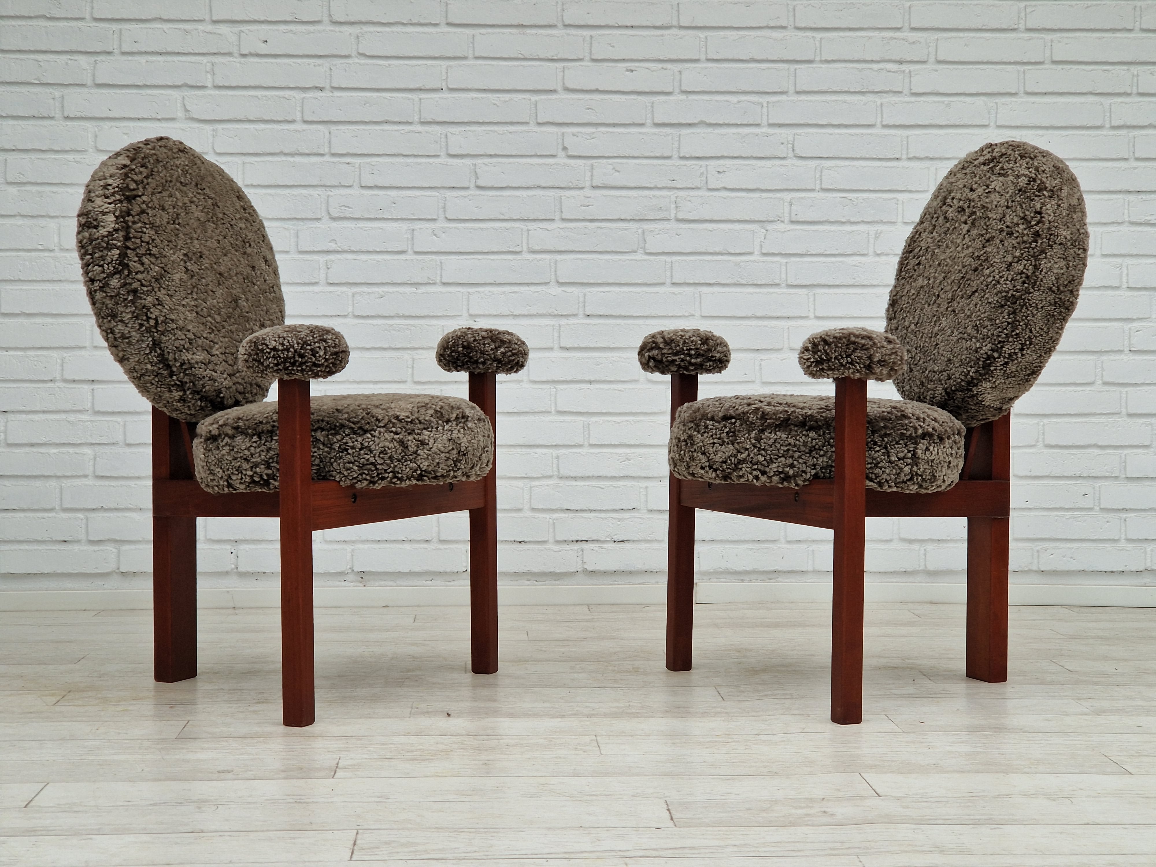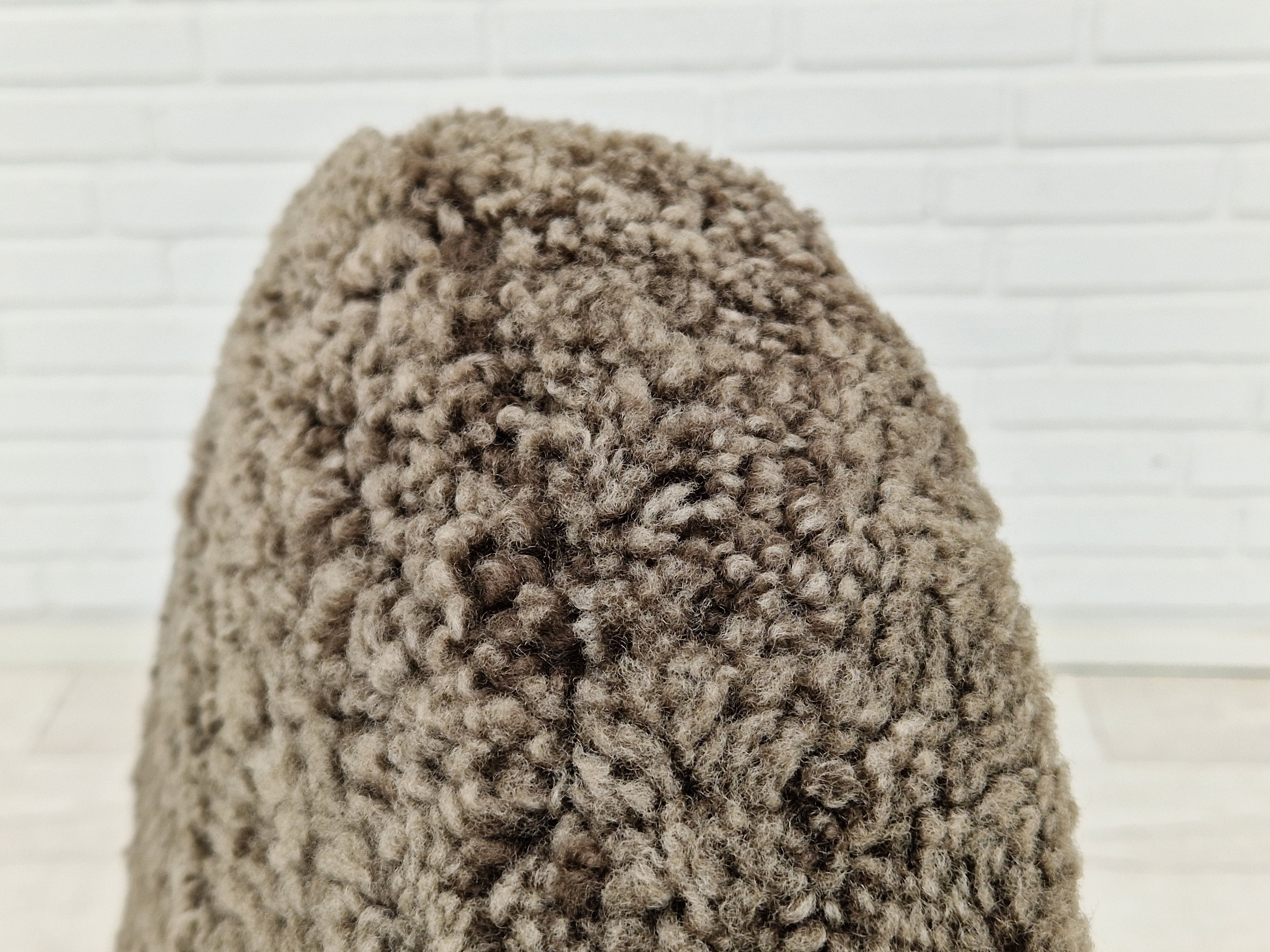 1960erne, Dansk design af Bent Møller Jepsen. Total renoveret armstole model "Medalie". Stel af massivt teaktræ, runde hynder samt armlæn betrukket med kvalitets ægte fåreskind Wellington. Charocal farvet. Fremstillet hos Sitamo Møbler. Formgivet 1961. Helt ny polstring med naturlig kokos måtte. Renoveret hos Retro Møbler Galleri af professionel møbelpolstrer, håndværker.
