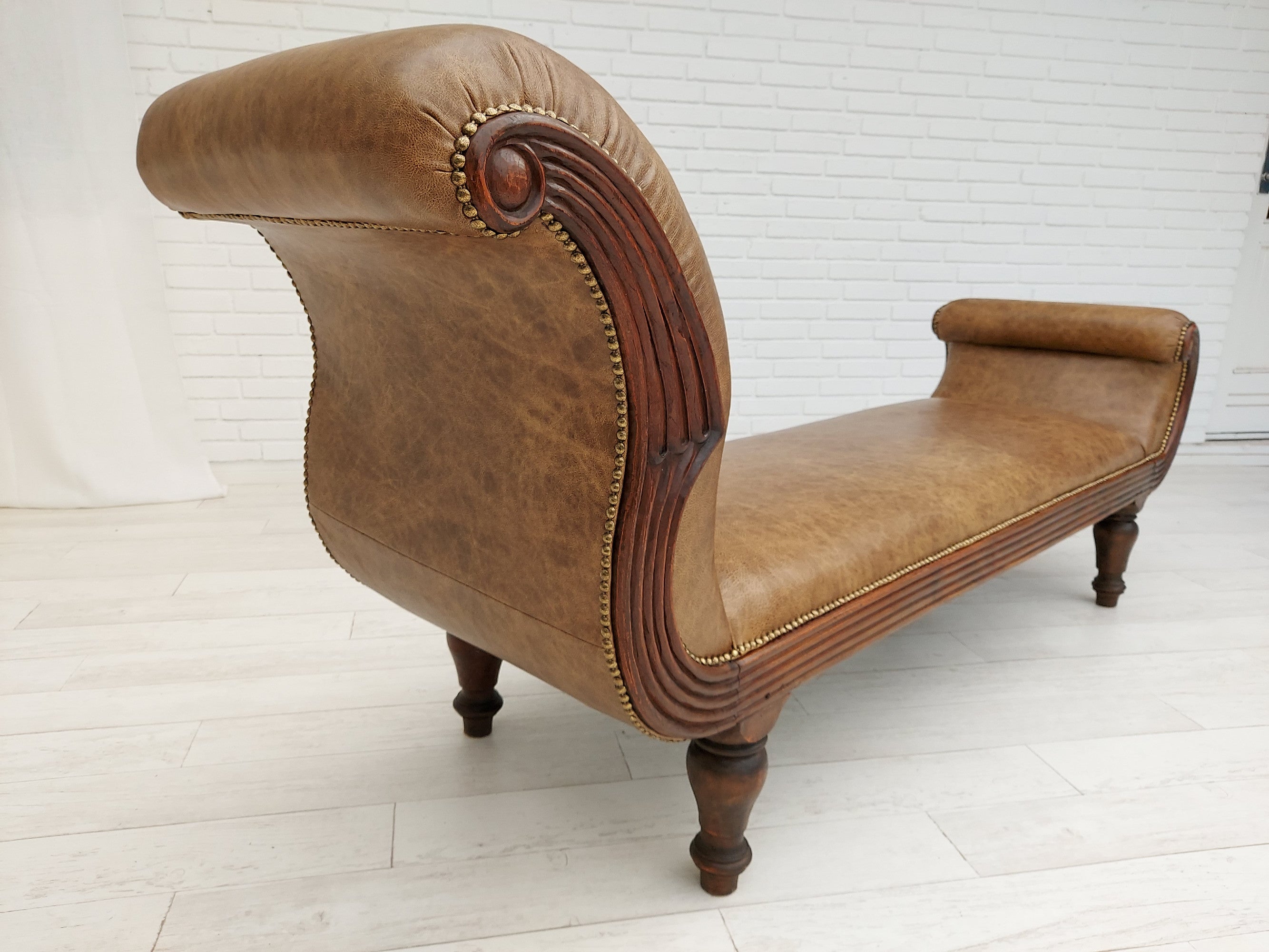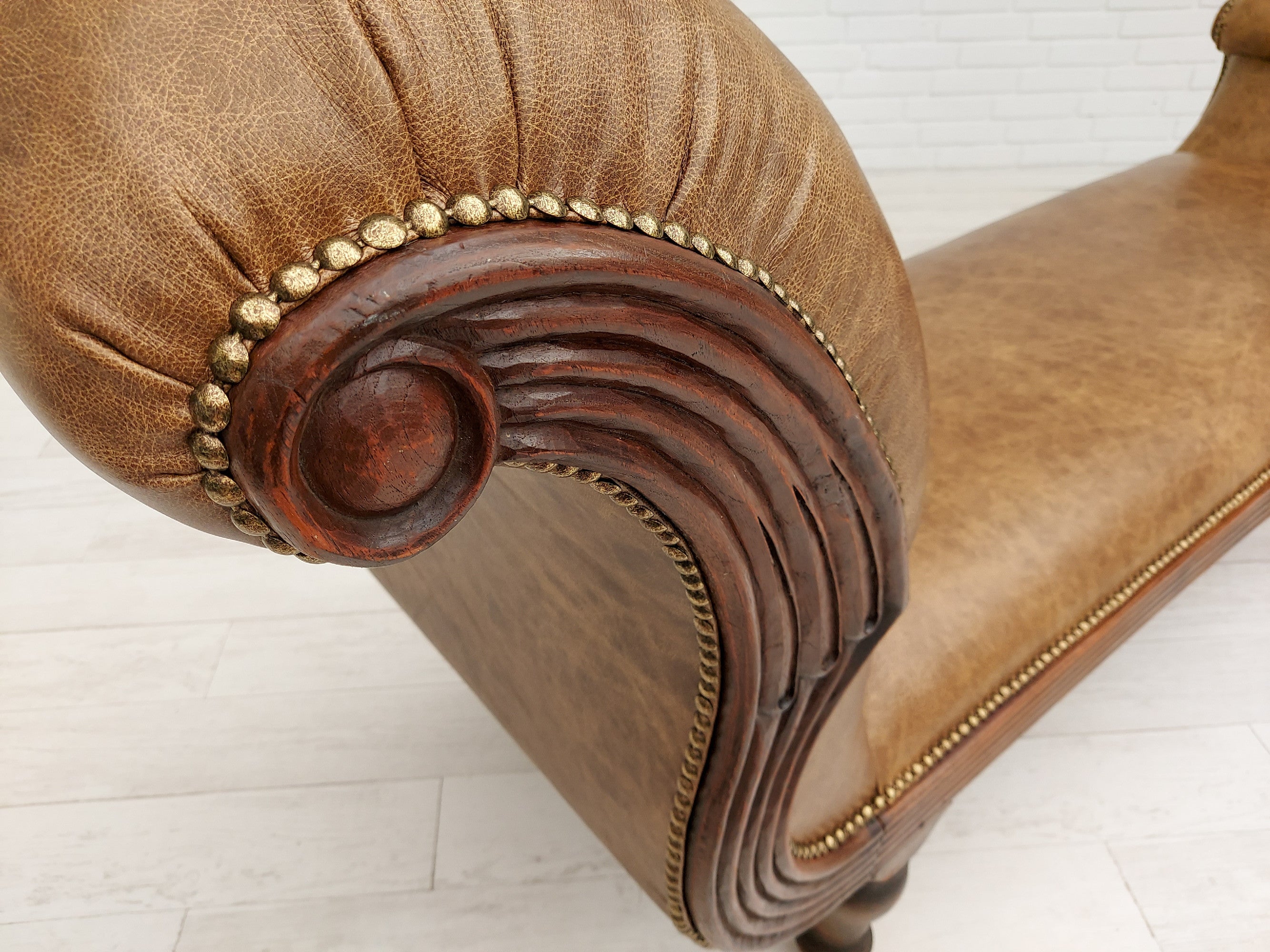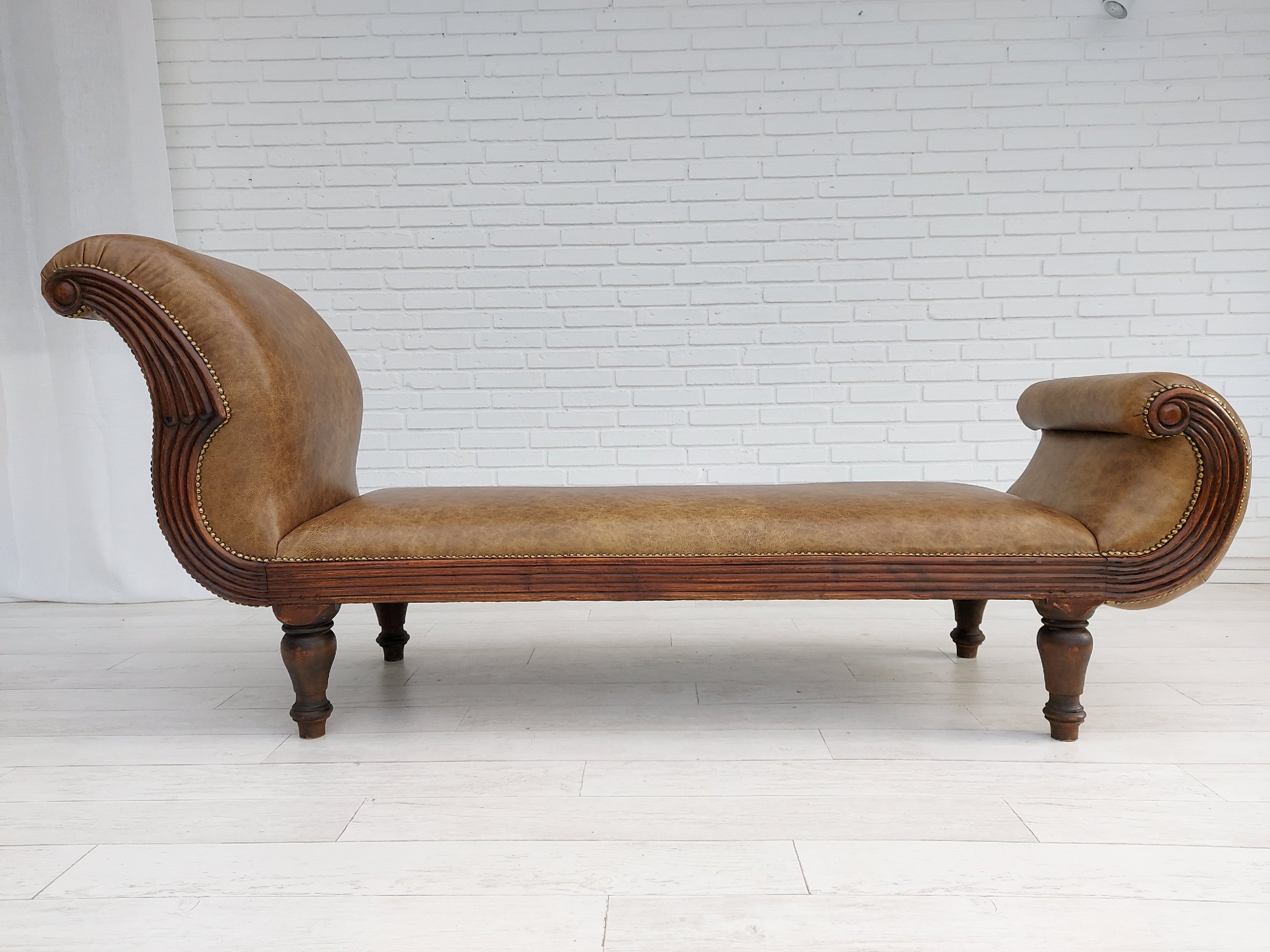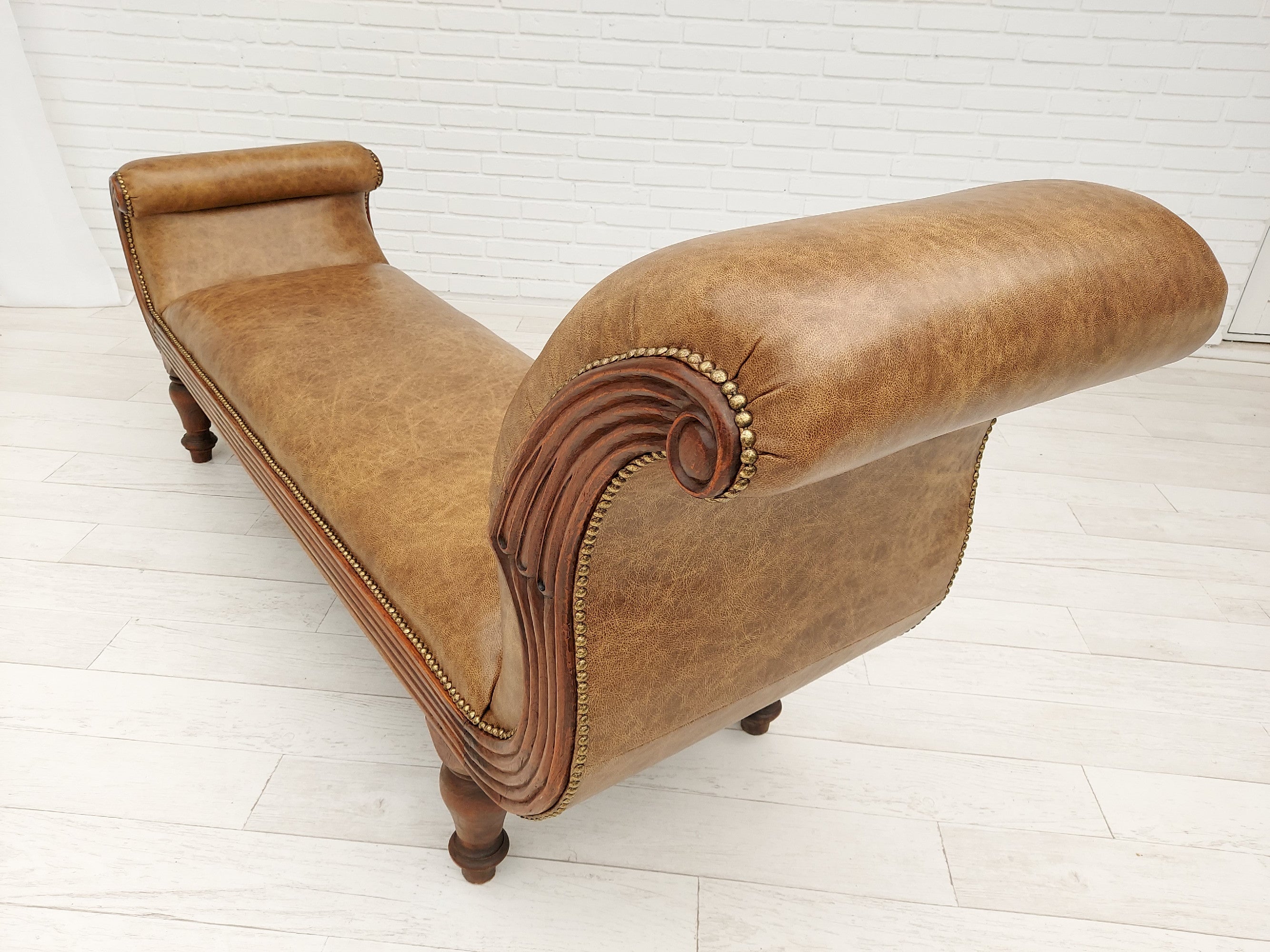 Antik chaiselong/daybed. Renoveret i top kvalitets Italiensk, patineret cognac læder. Retro guld pynte sum. Fremstillet i ca. 1900-1920. Teaktræ og asketræ. Træstel konserveret med Shellak. Restaureret hos Retro Møbler Galleri af håndværker.