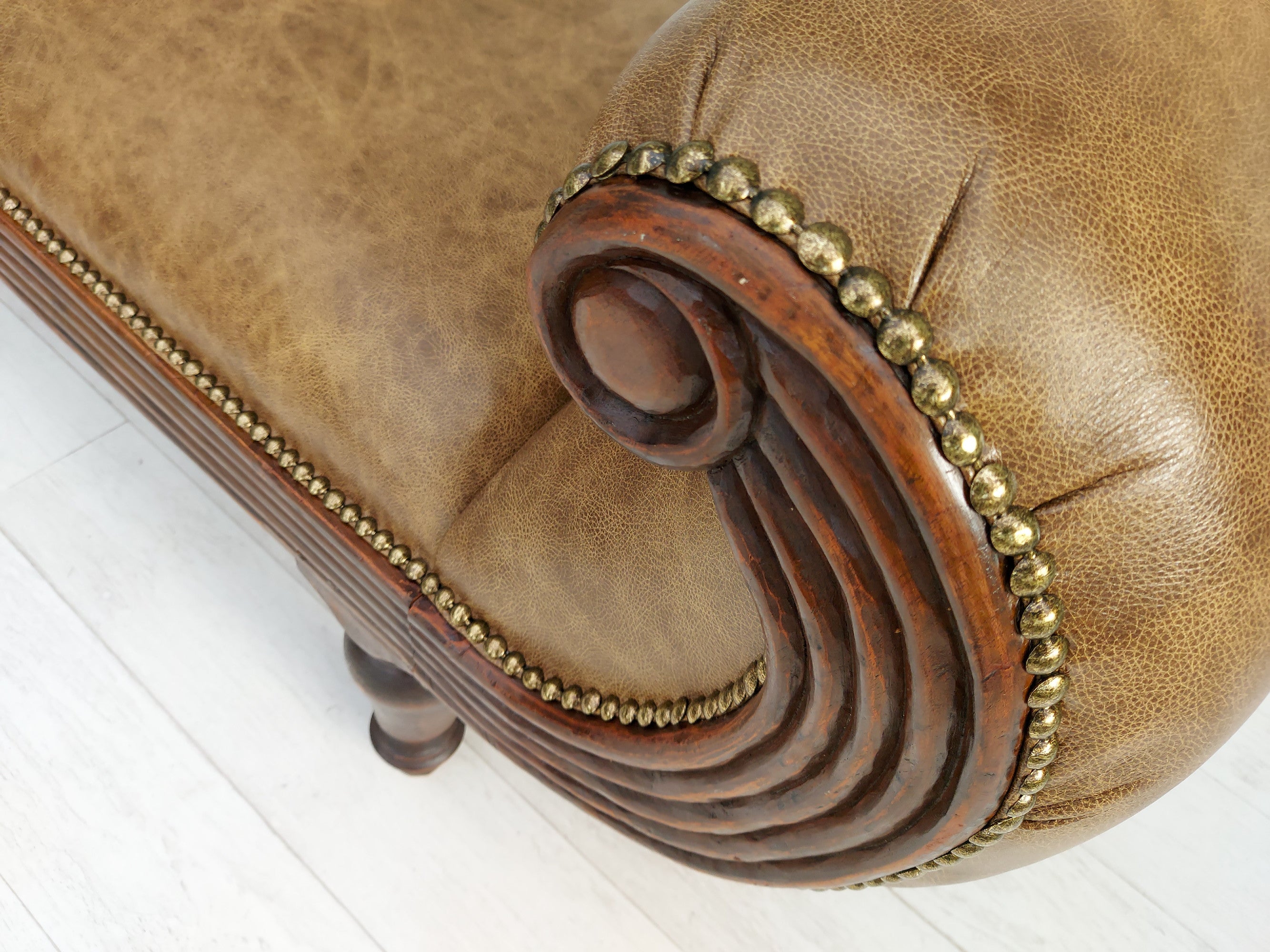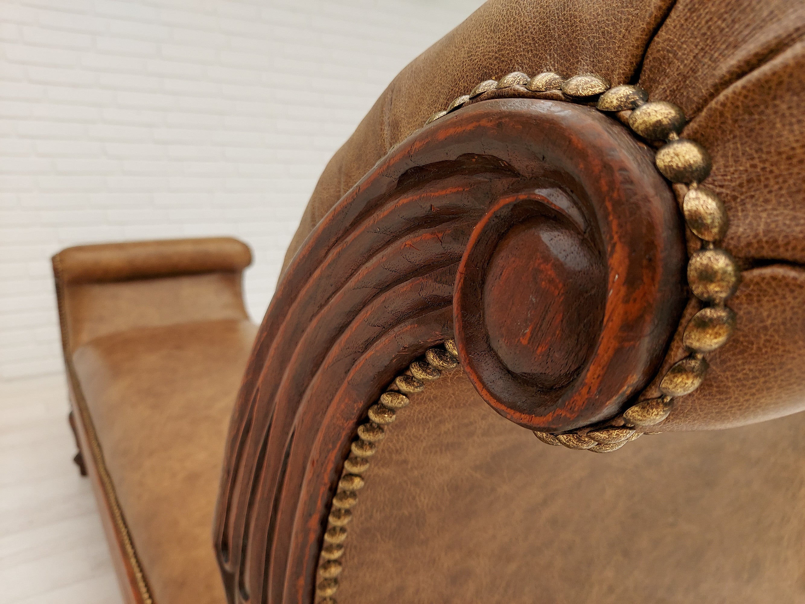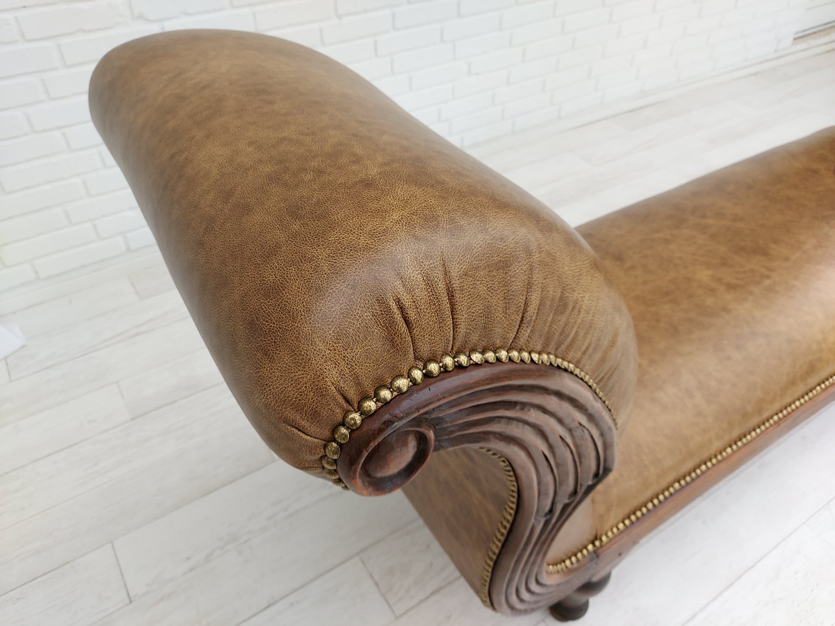 Antik chaiselong/daybed. Renoveret i top kvalitets Italiensk, patineret cognac læder. Retro guld pynte sum. Fremstillet i ca. 1900-1920. Teaktræ og asketræ. Træstel konserveret med Shellak. Restaureret hos Retro Møbler Galleri af håndværker.