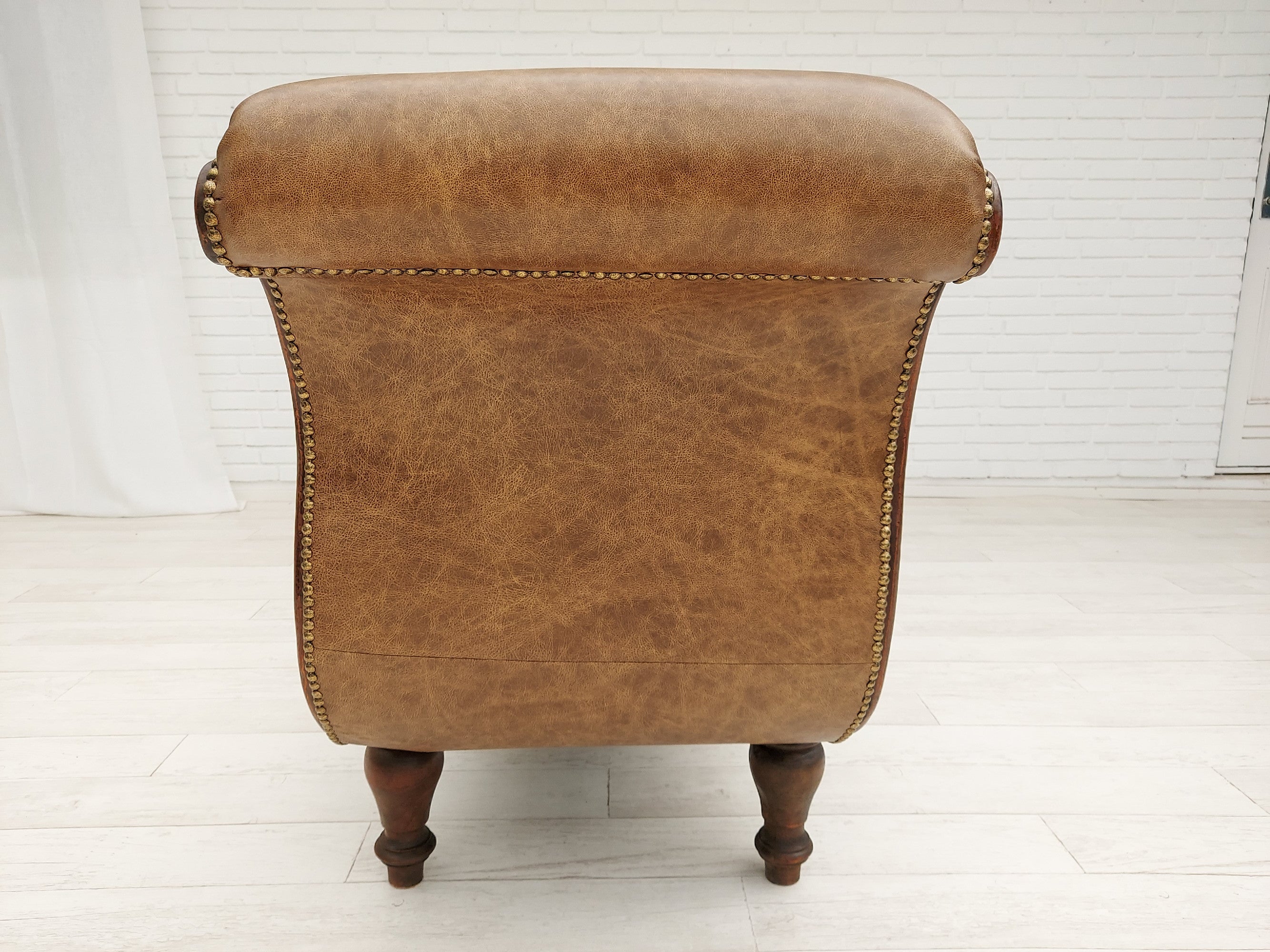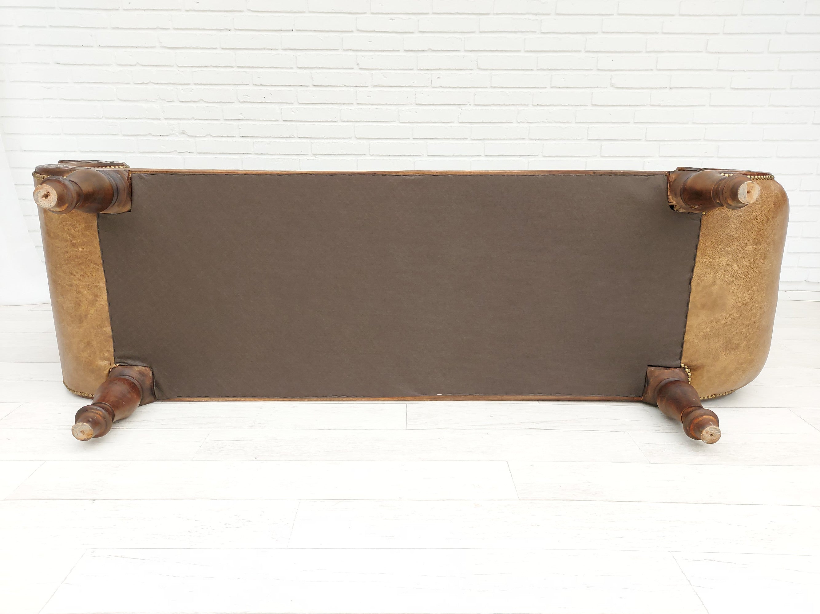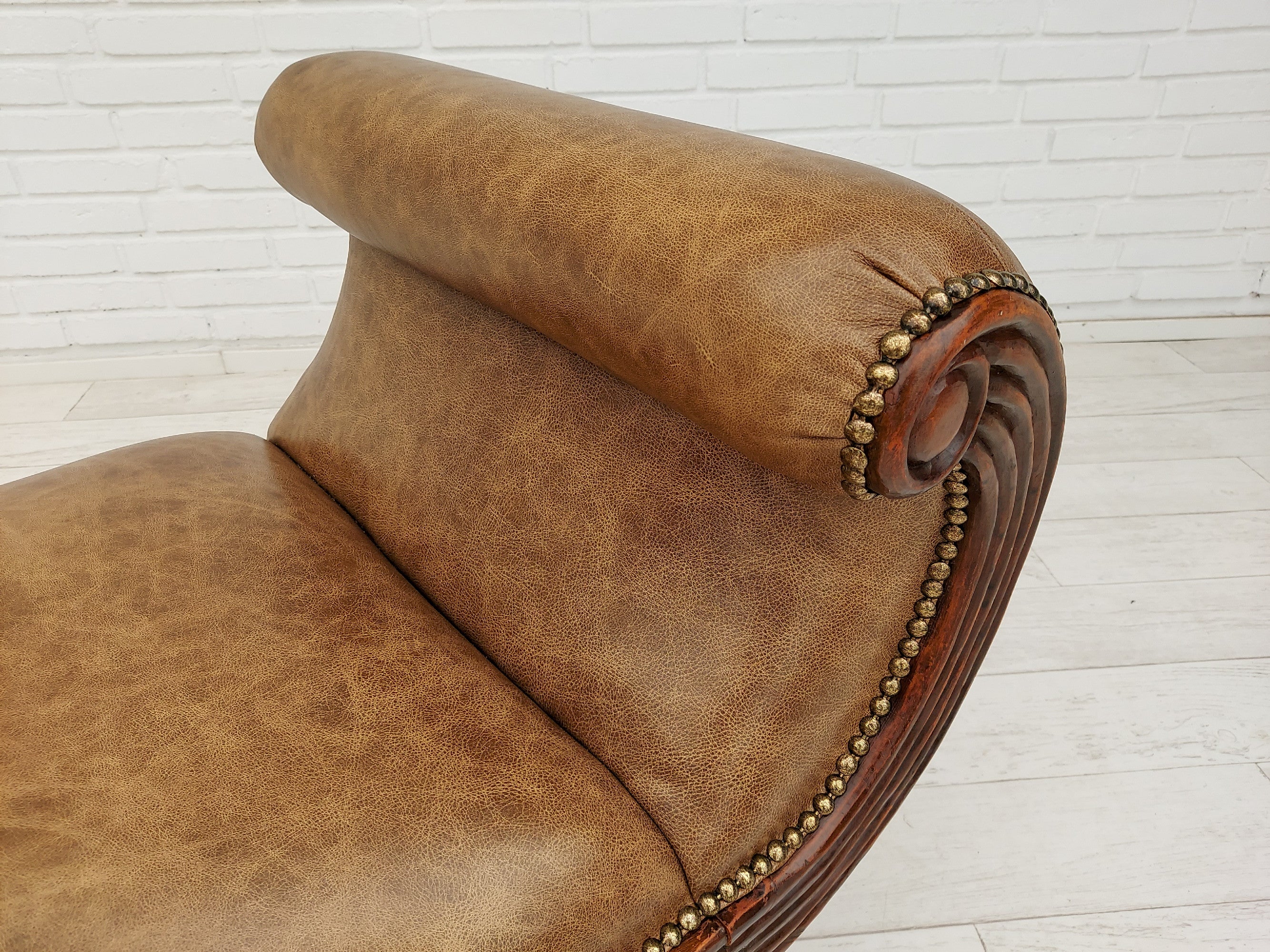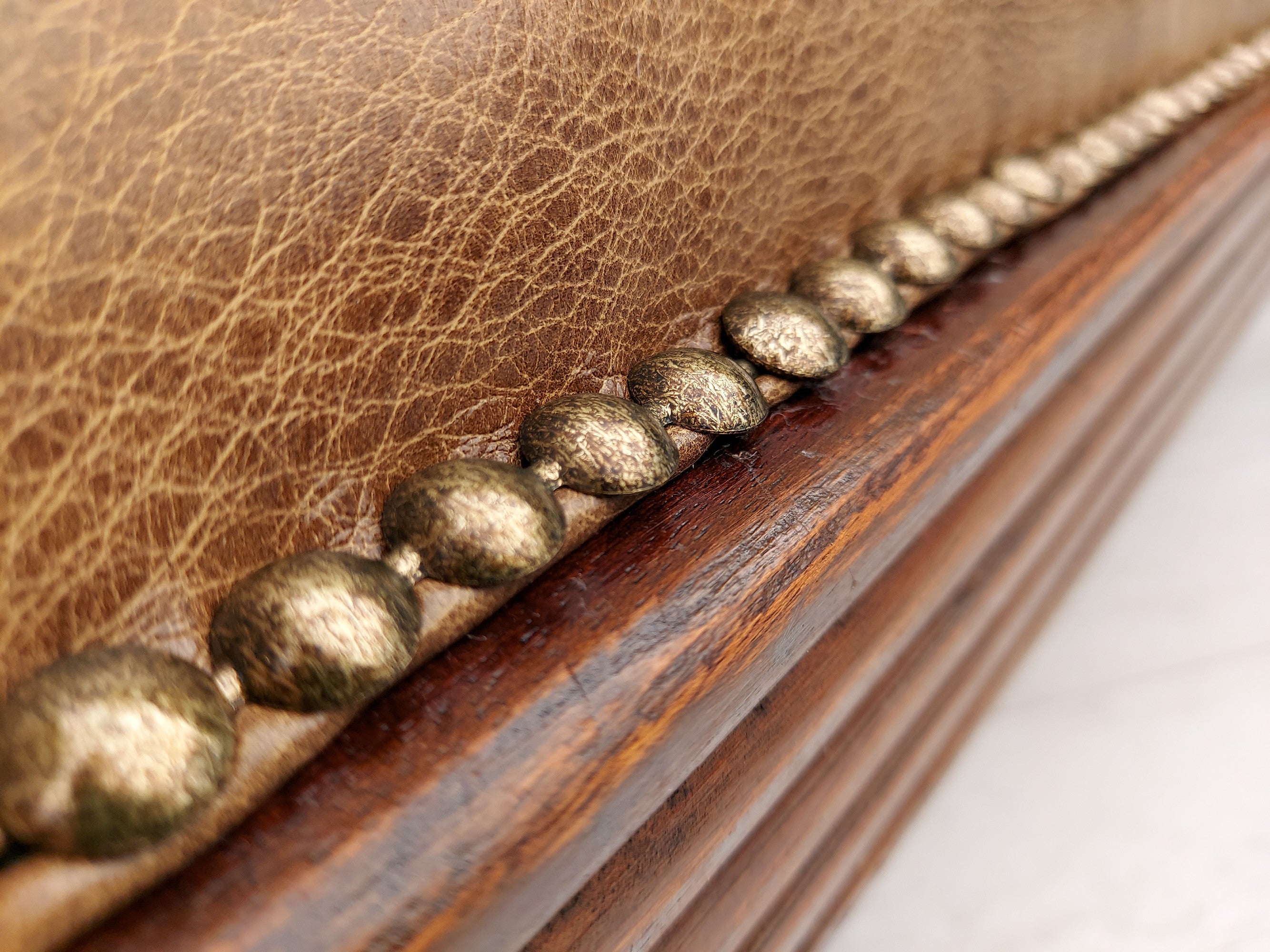 Antik chaiselong/daybed. Renoveret i top kvalitets Italiensk, patineret cognac læder. Retro guld pynte sum. Fremstillet i ca. 1900-1920. Teaktræ og asketræ. Træstel konserveret med Shellak. Restaureret hos Retro Møbler Galleri af håndværker.