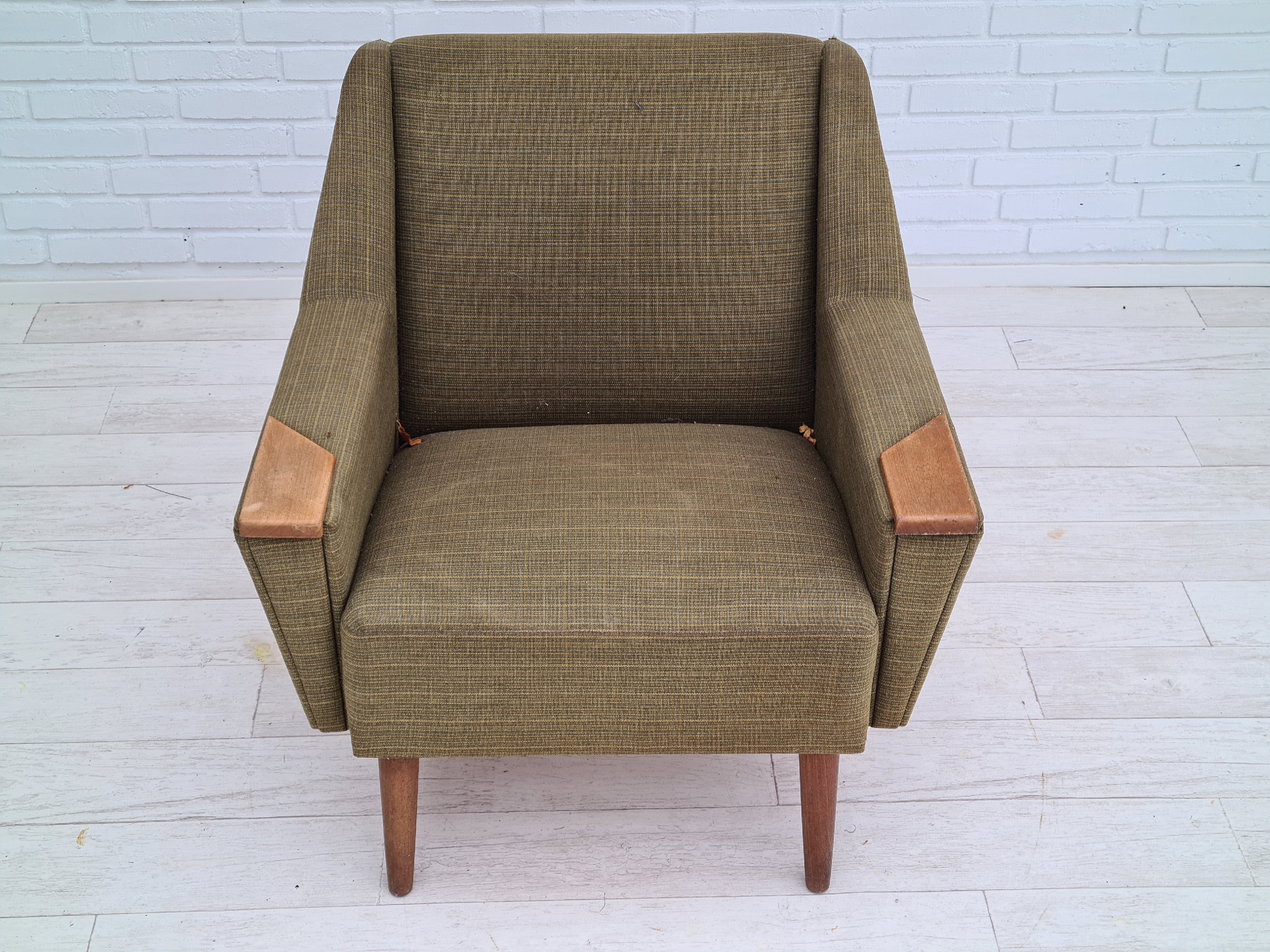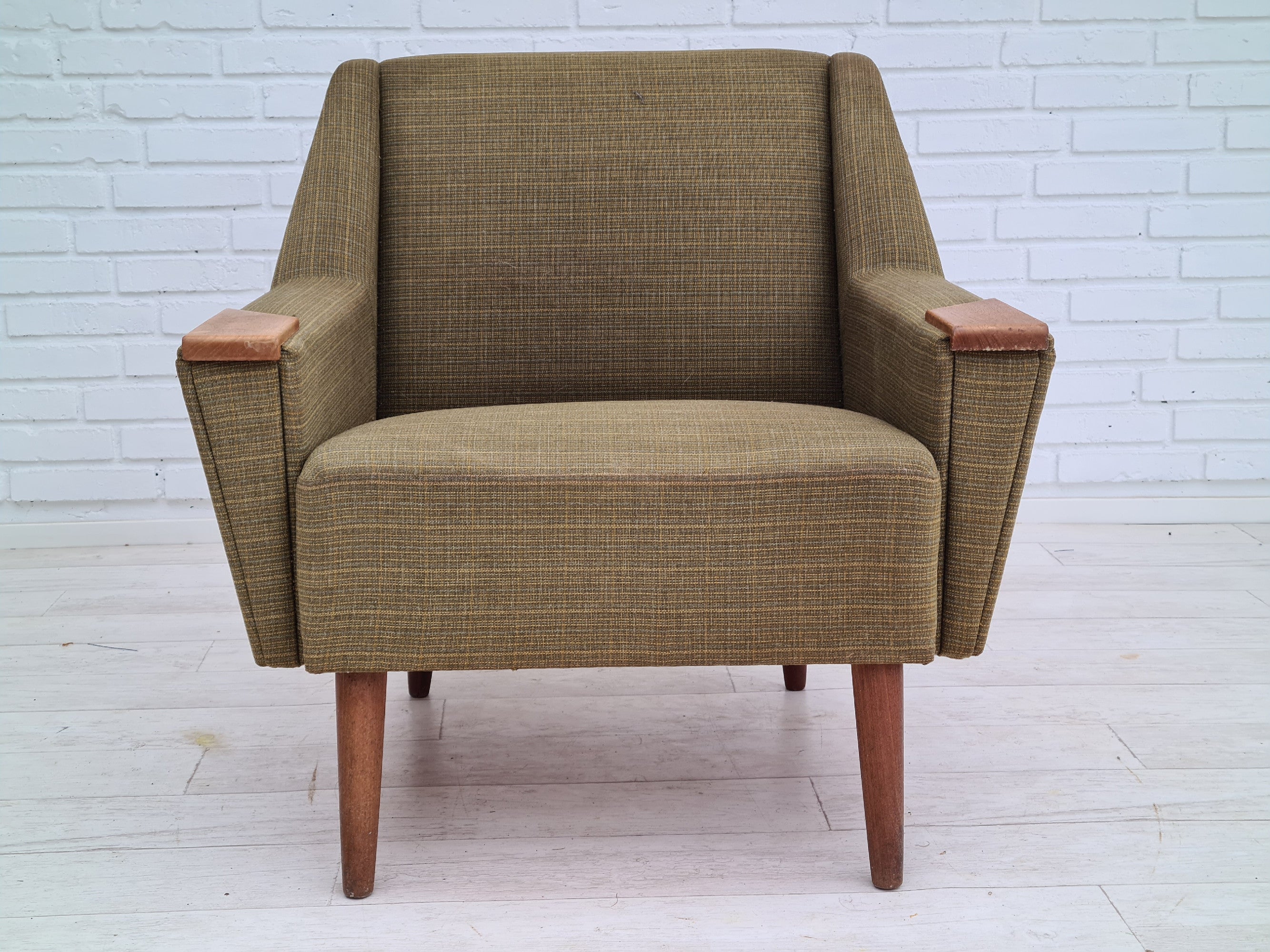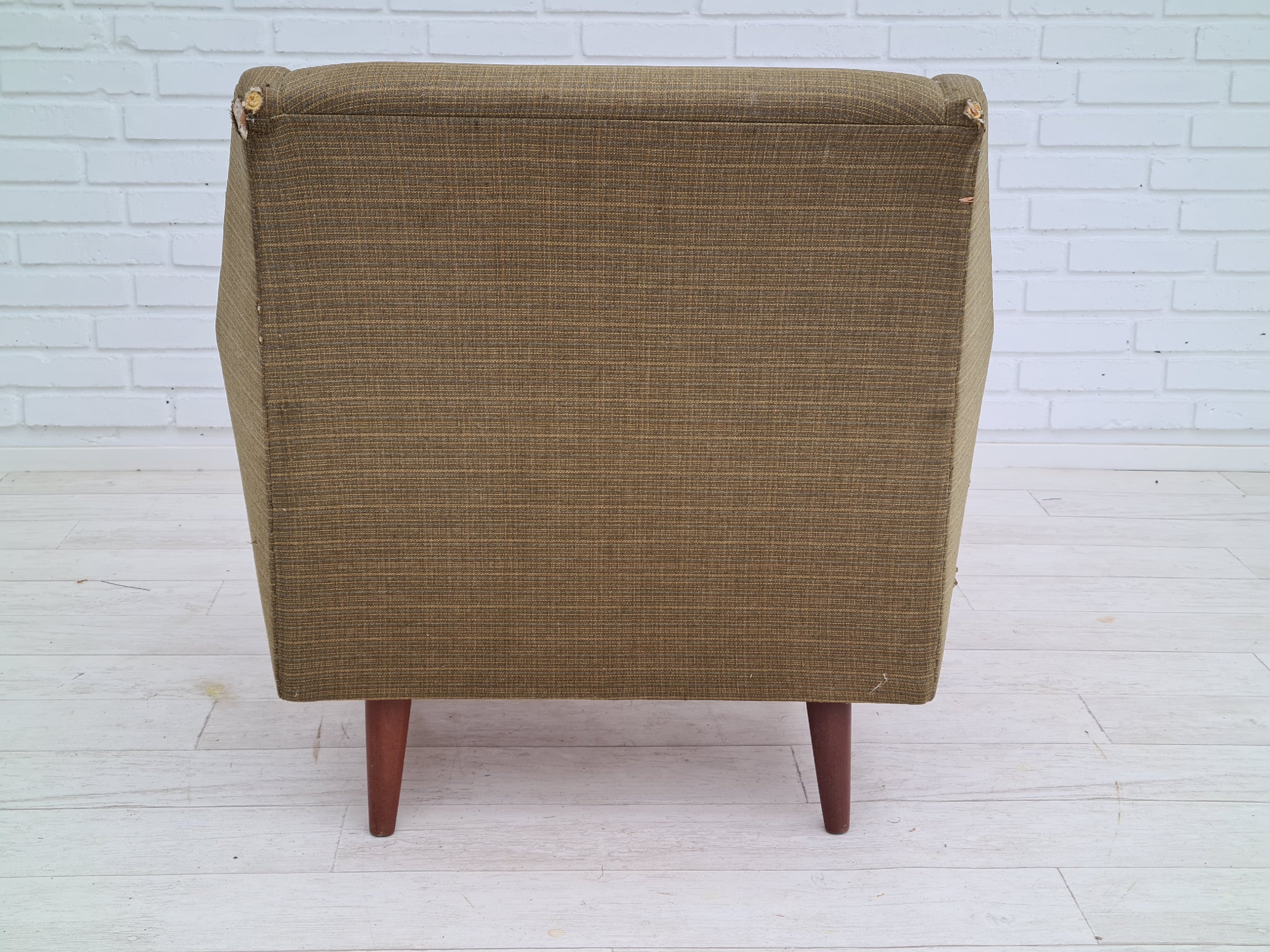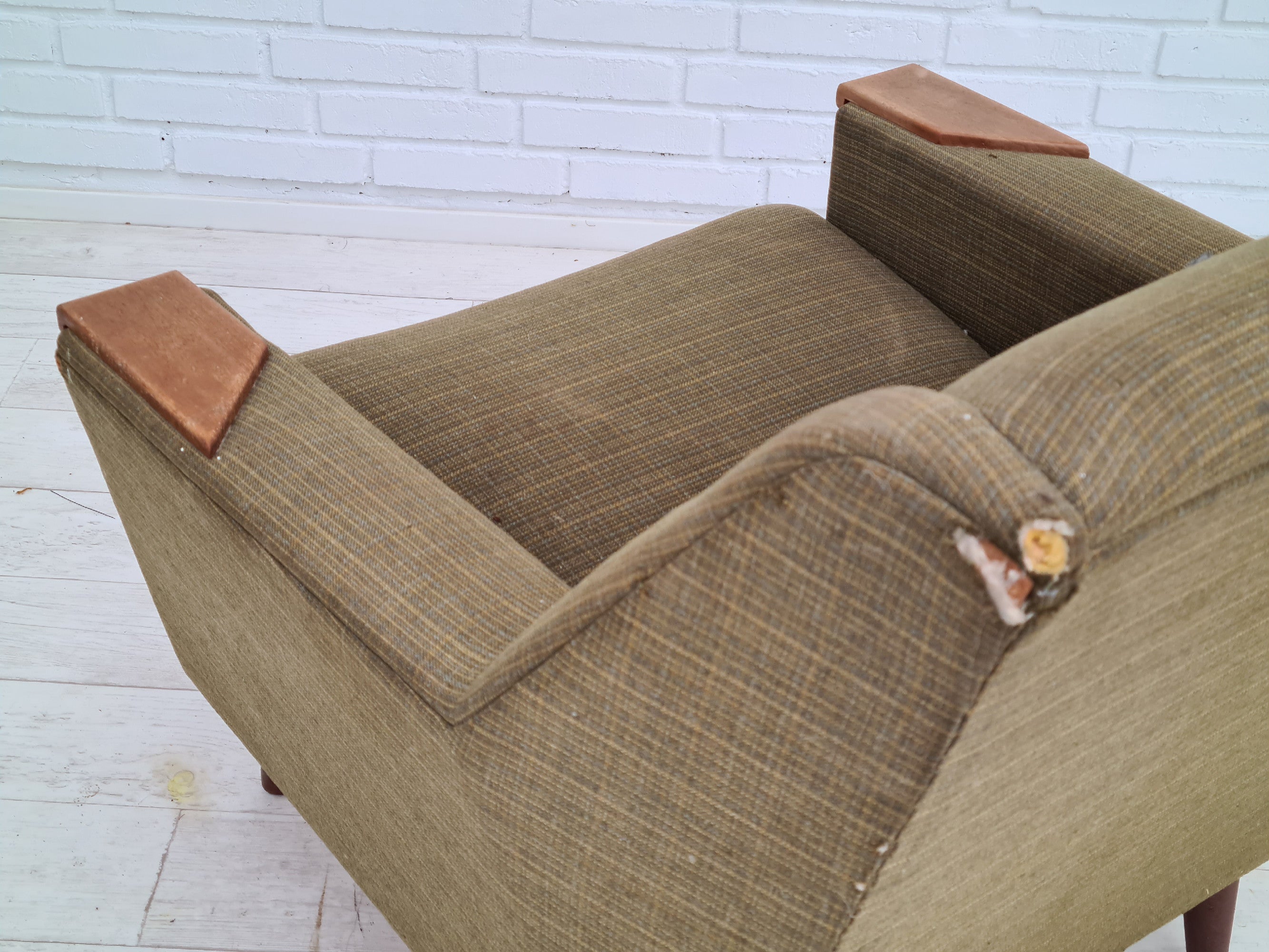 Dansk lænestol. Fremstillet af Dansk møbelproducent i ca. 1970. Ben og negle af teaktræ. Lænestol er til salg efter total renovering.