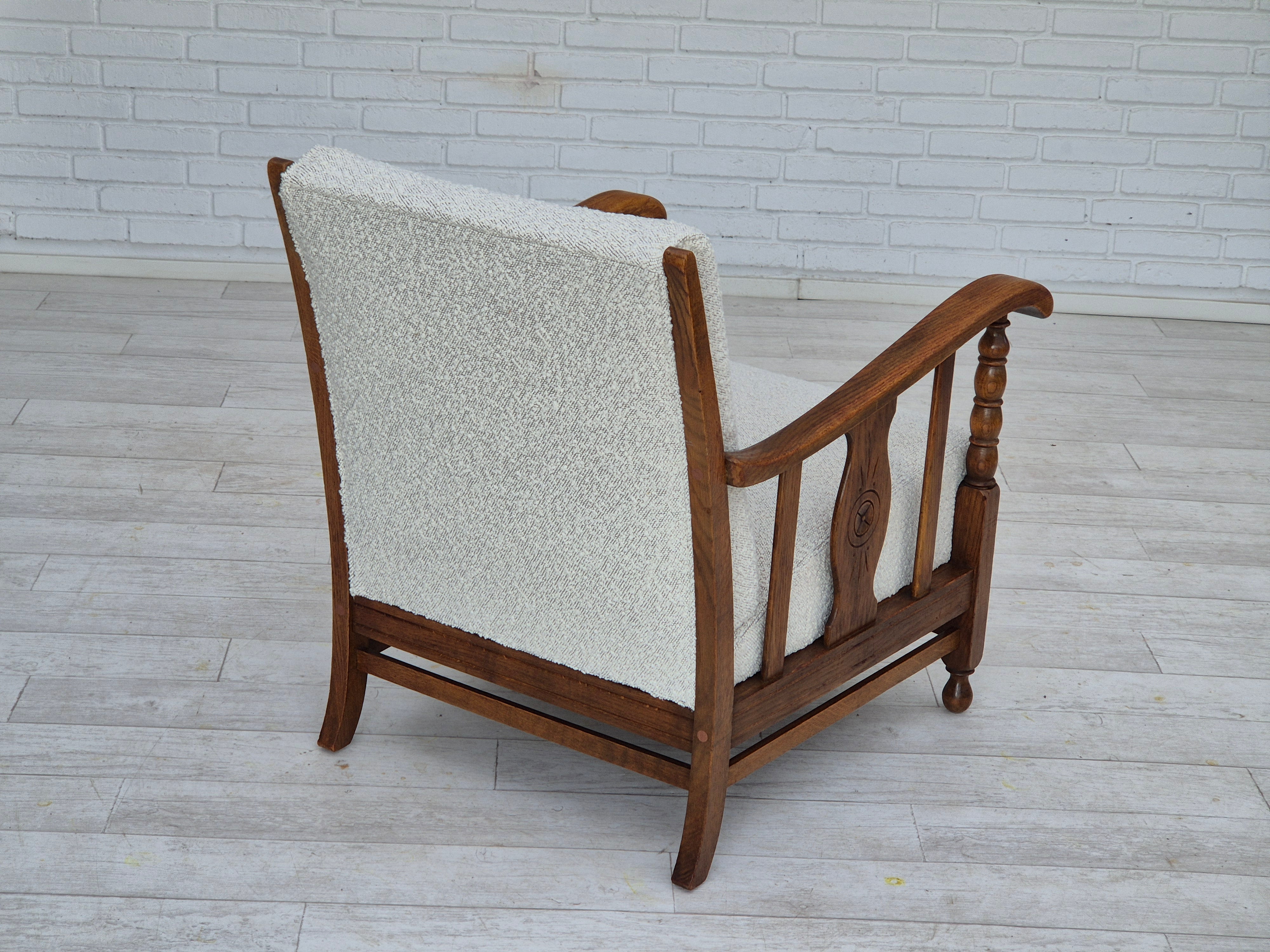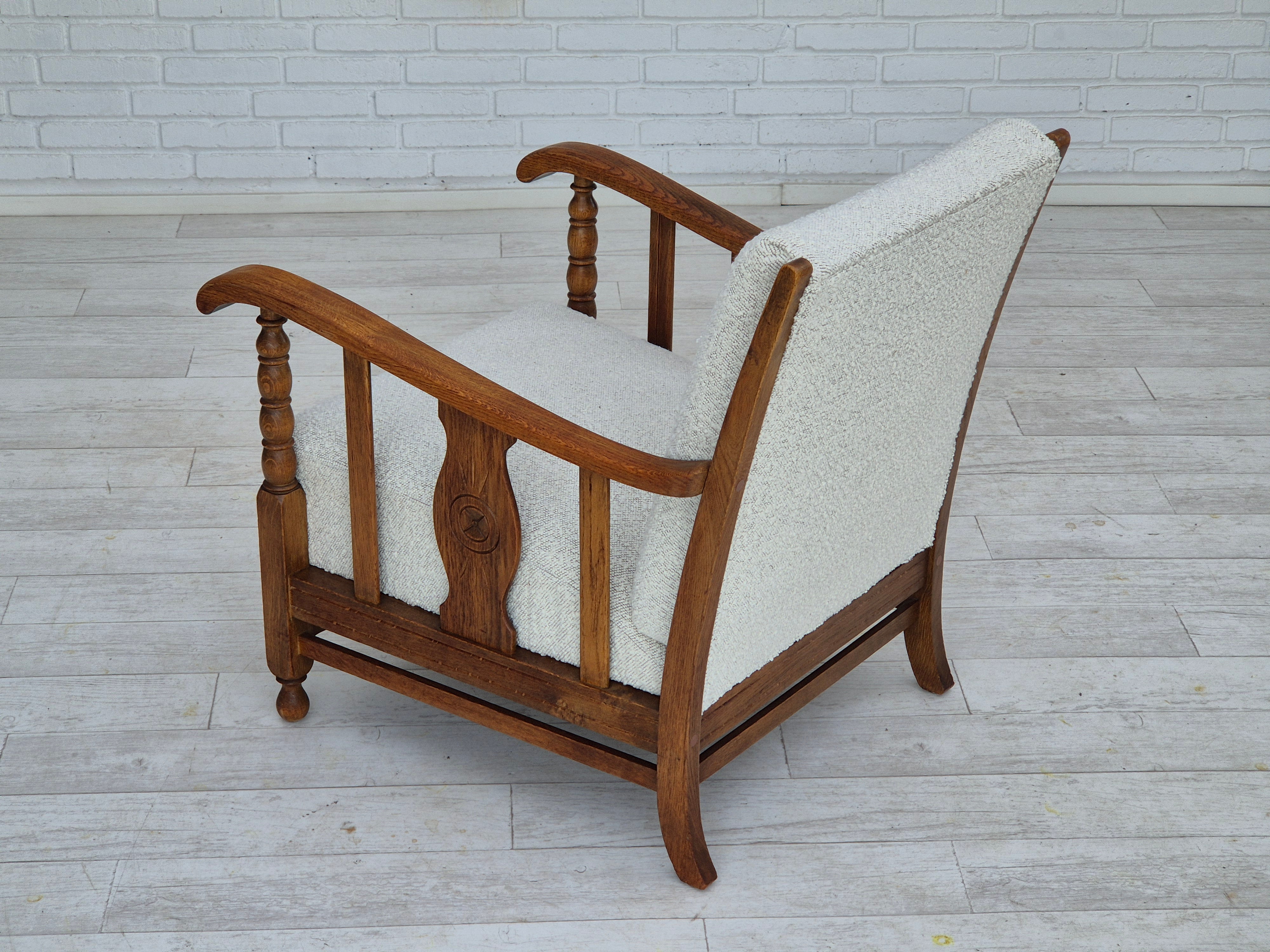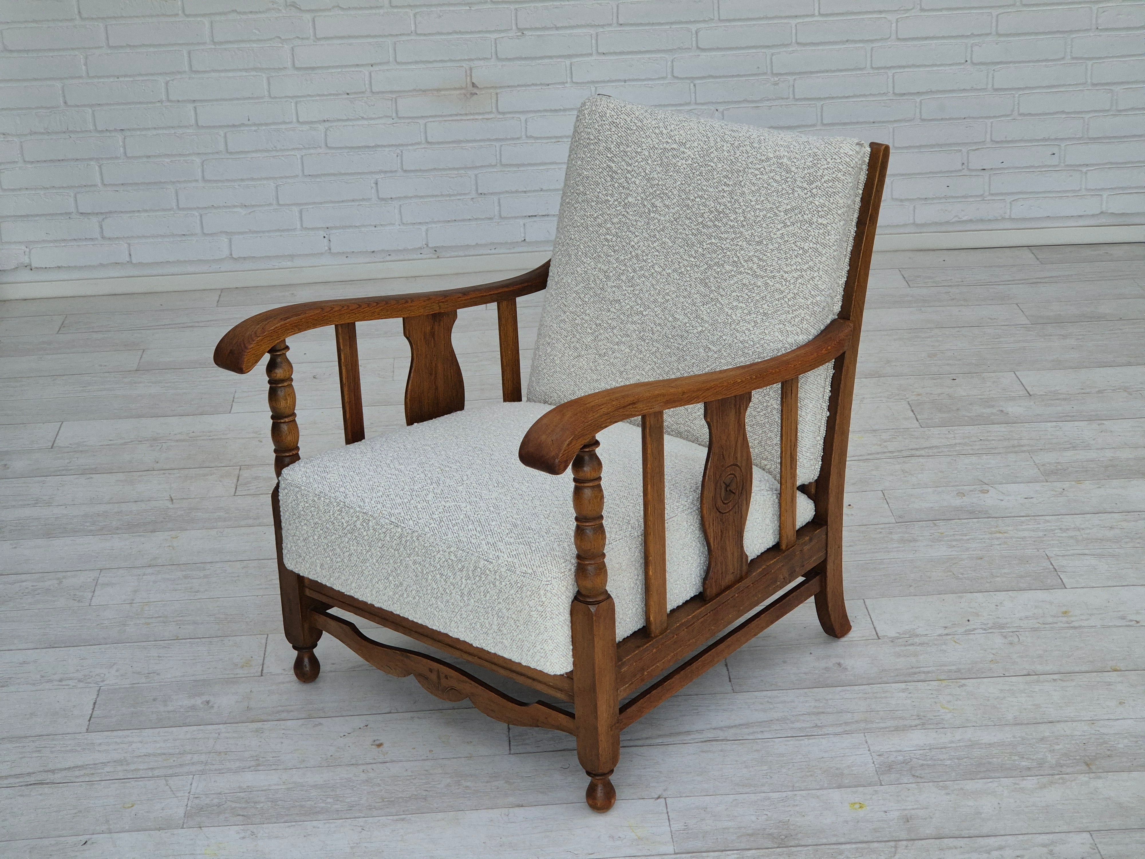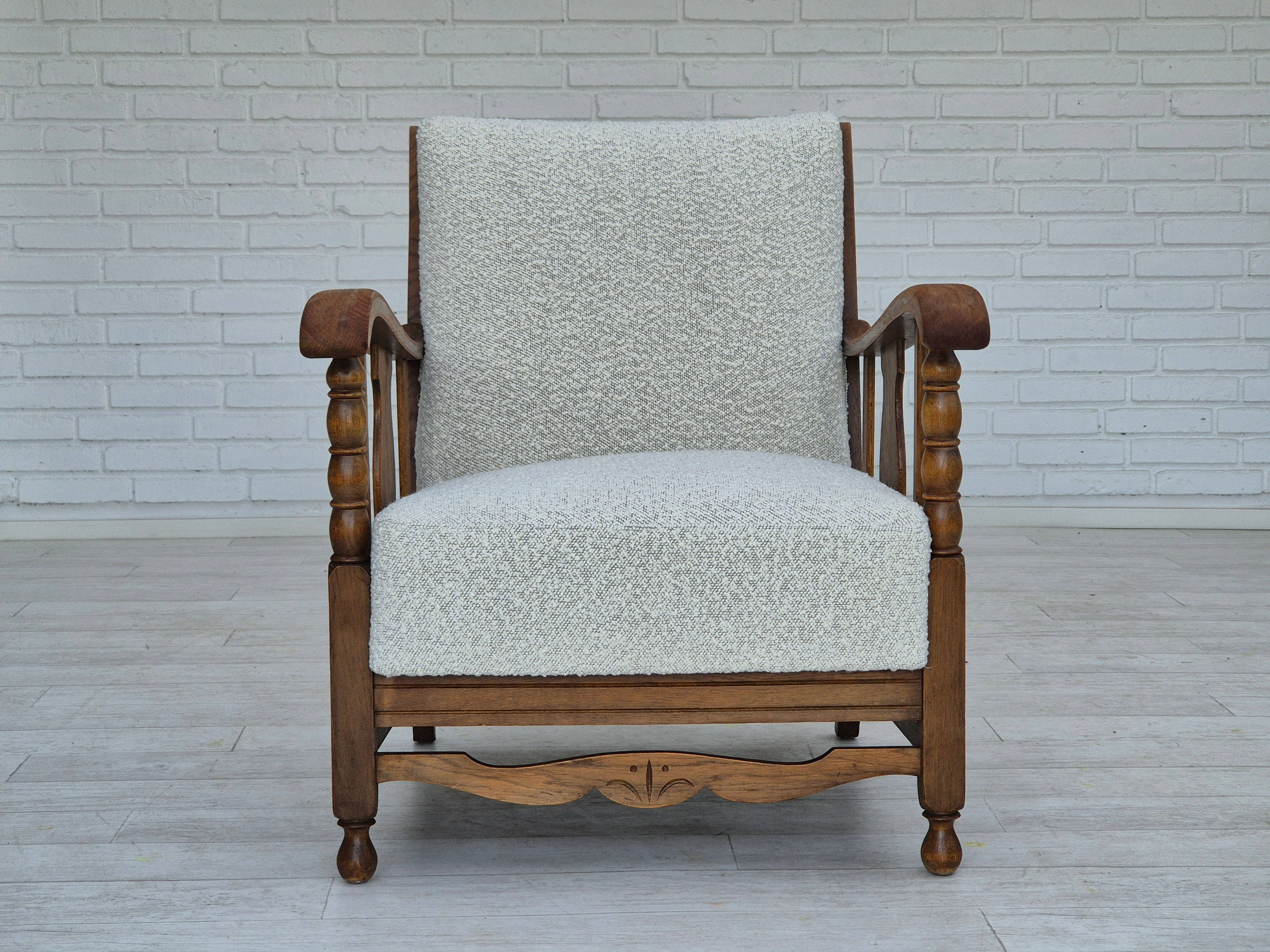 1950s, Scandinavian design - Danish or Swedish. Renovated armchair in quality upholstery fabric - white/light grey colour. Renewed oak, brass springs in the seat retained. Manufactured by Danish or Swedish furniture manufacturer in approx. 1950-55. Renovated at Retro Møbler Galleri by professional upholsterer, craftsman.