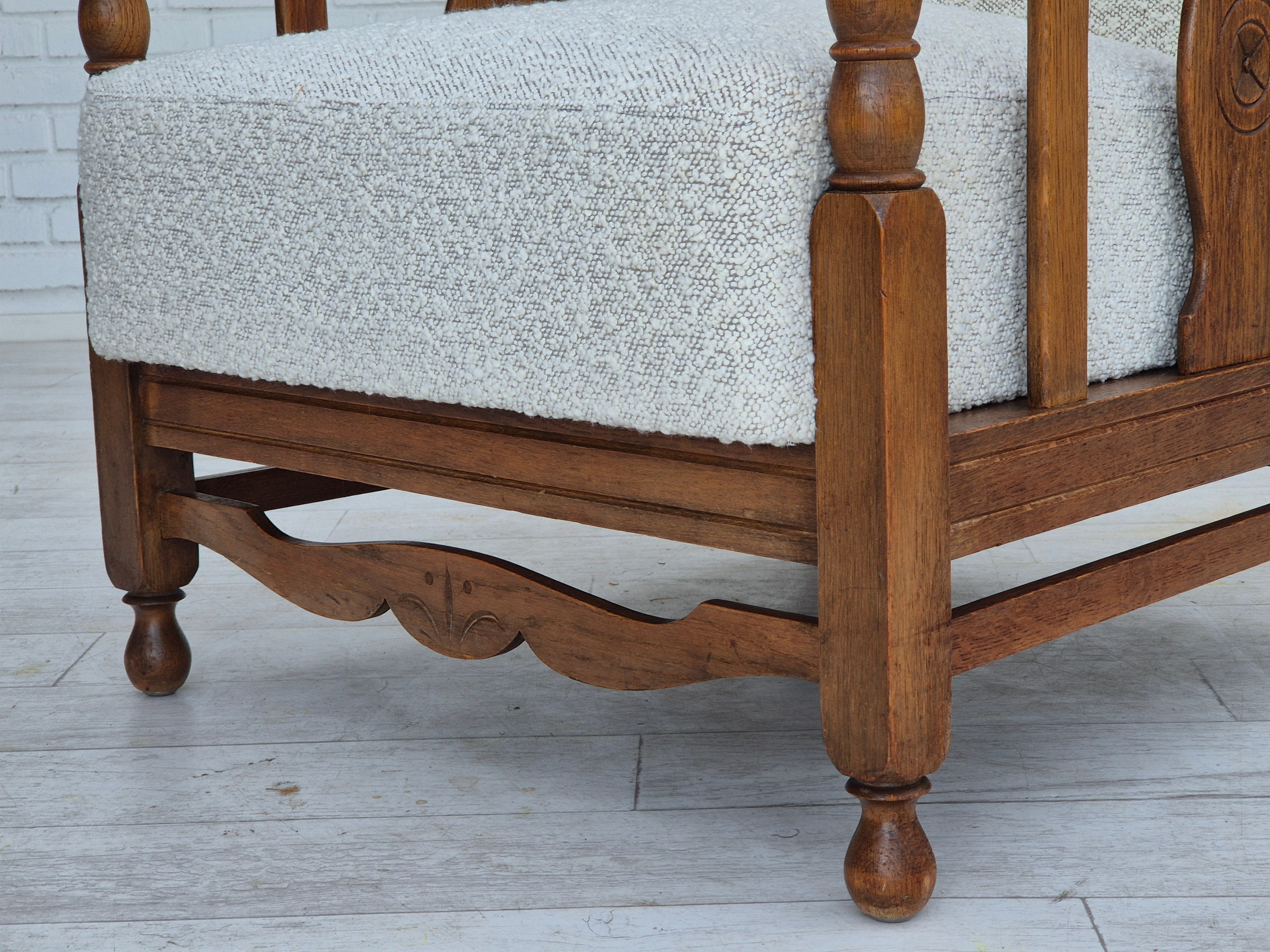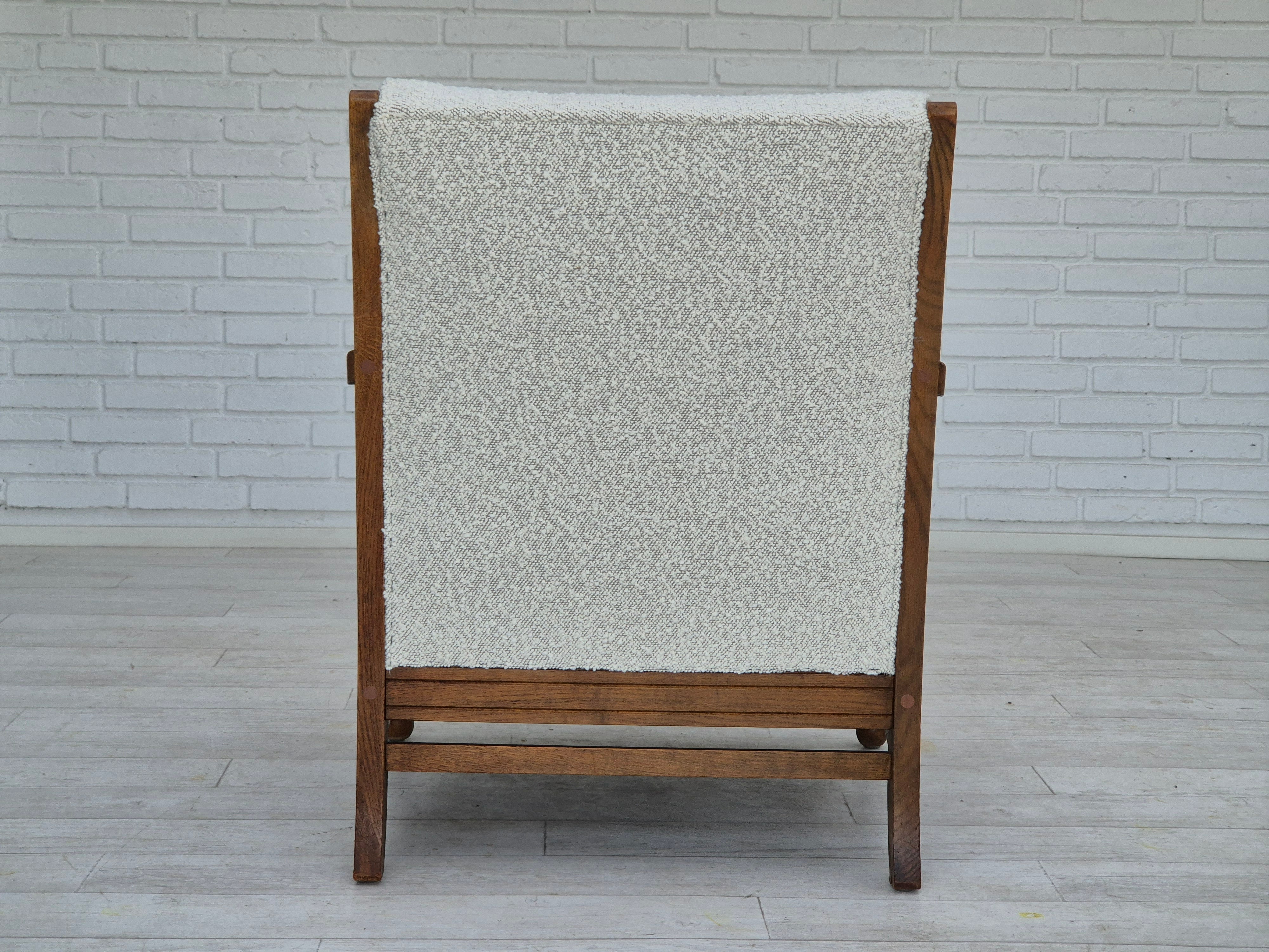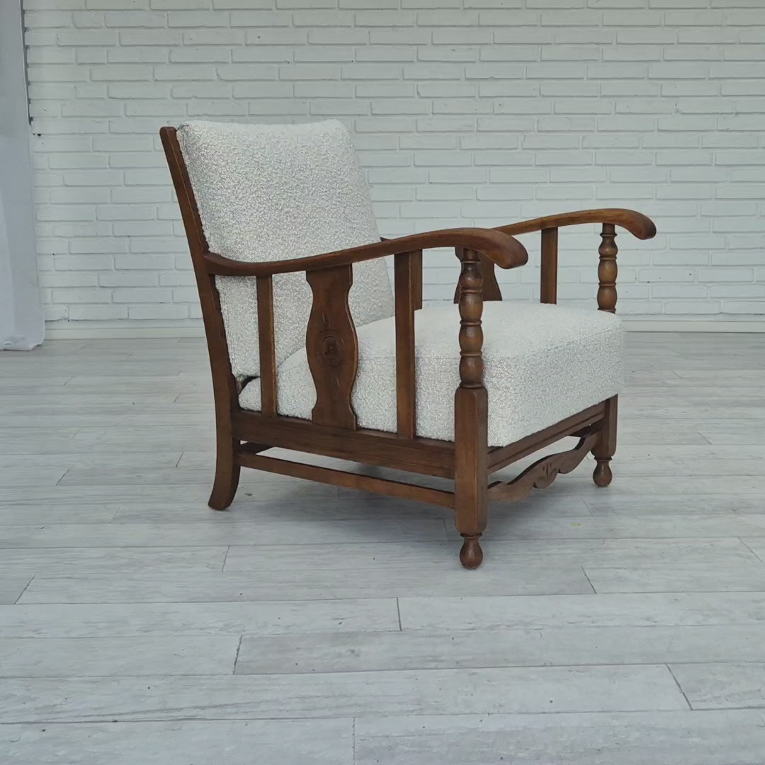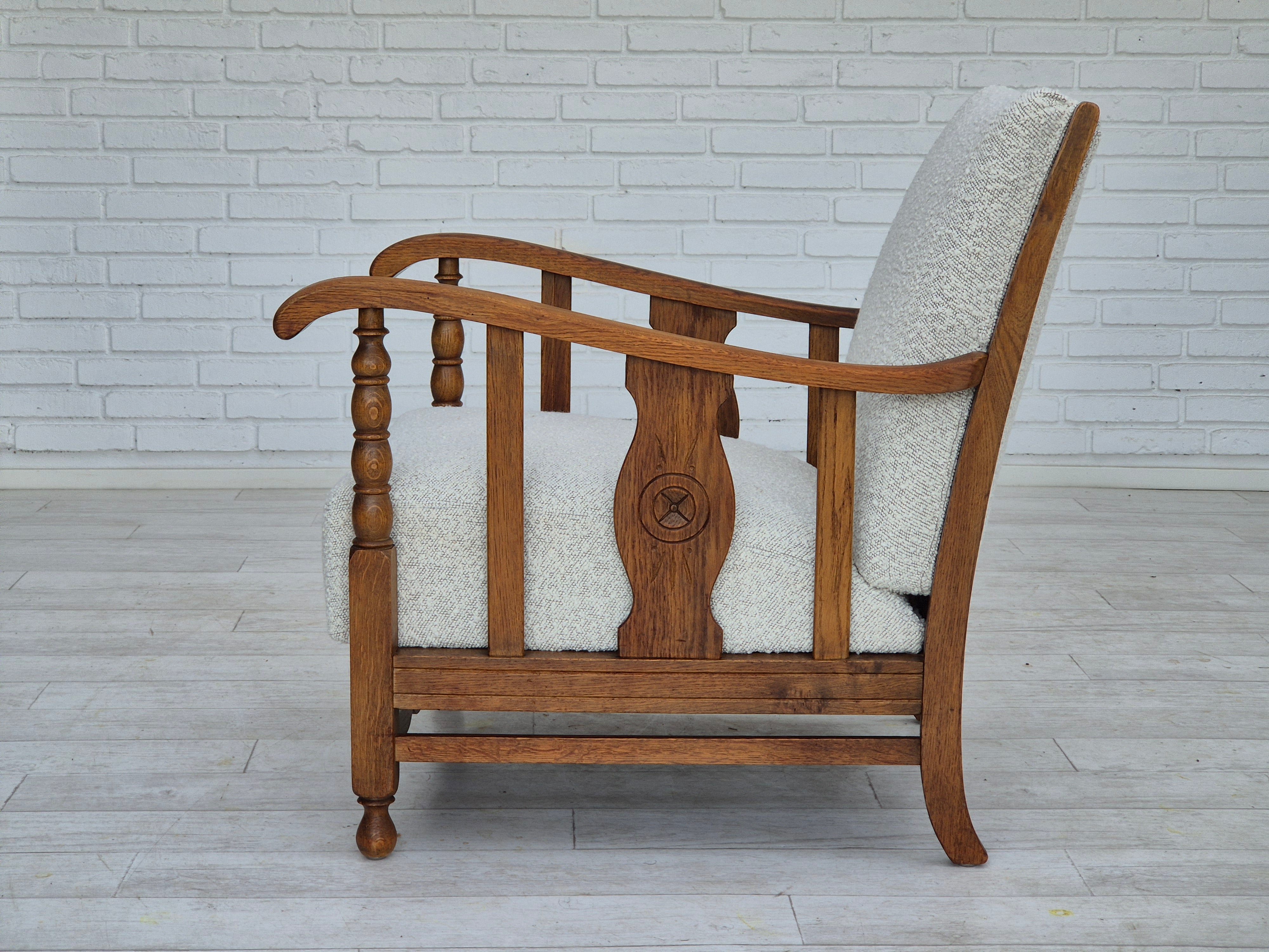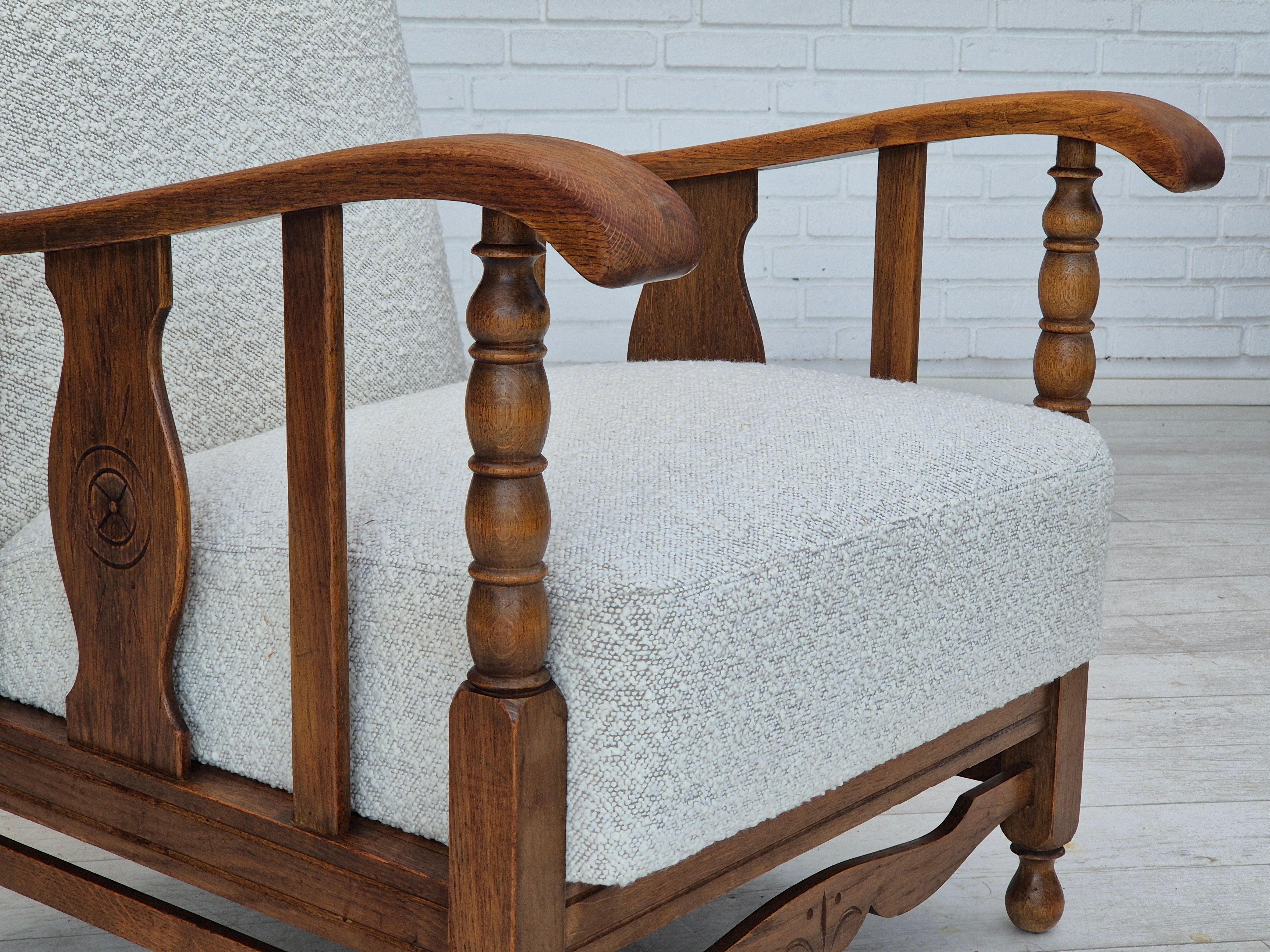 1950s, Scandinavian design - Danish or Swedish. Renovated armchair in quality upholstery fabric - white/light grey colour. Renewed oak, brass springs in the seat retained. Manufactured by Danish or Swedish furniture manufacturer in approx. 1950-55. Renovated at Retro Møbler Galleri by professional upholsterer, craftsman.
