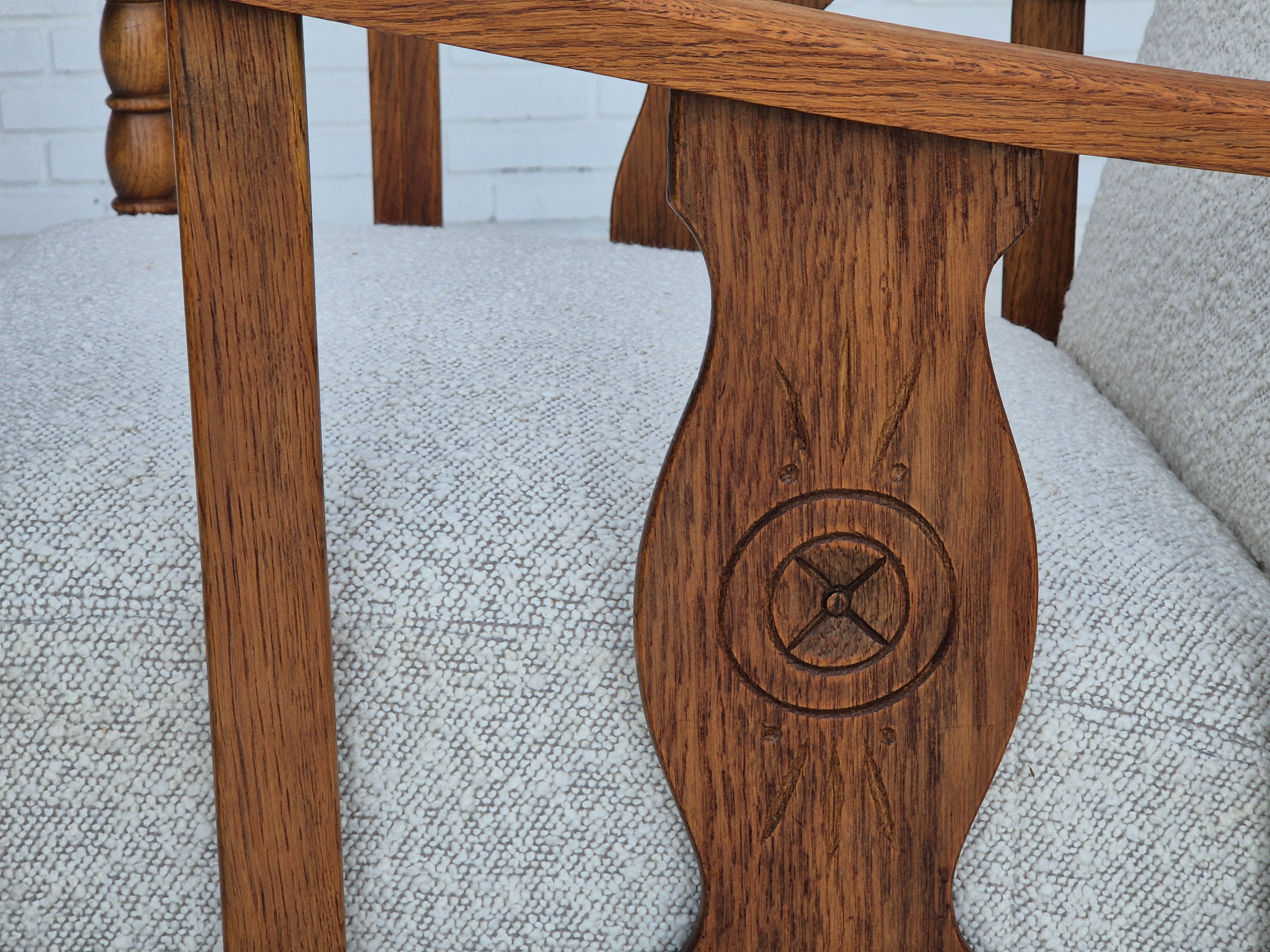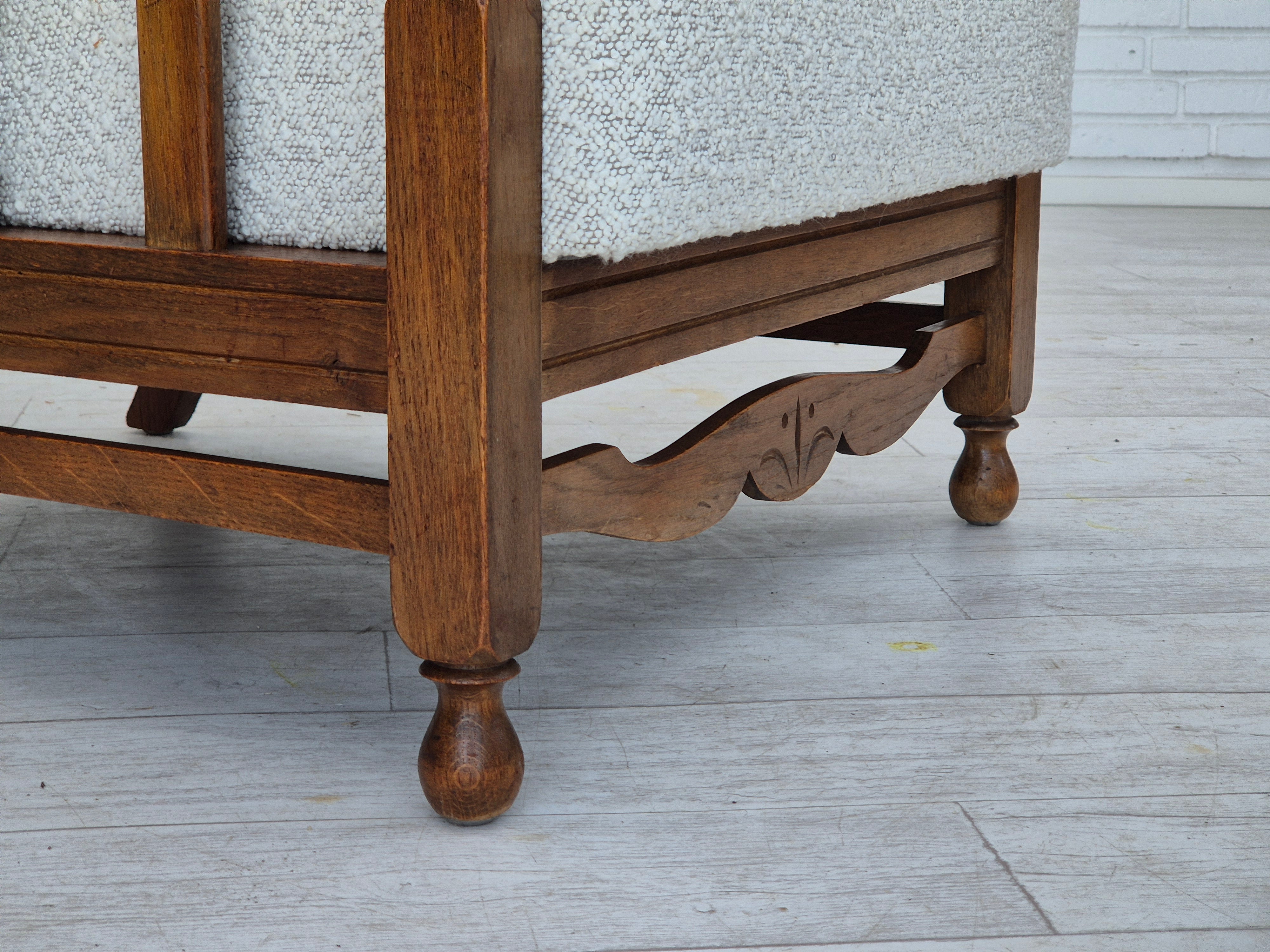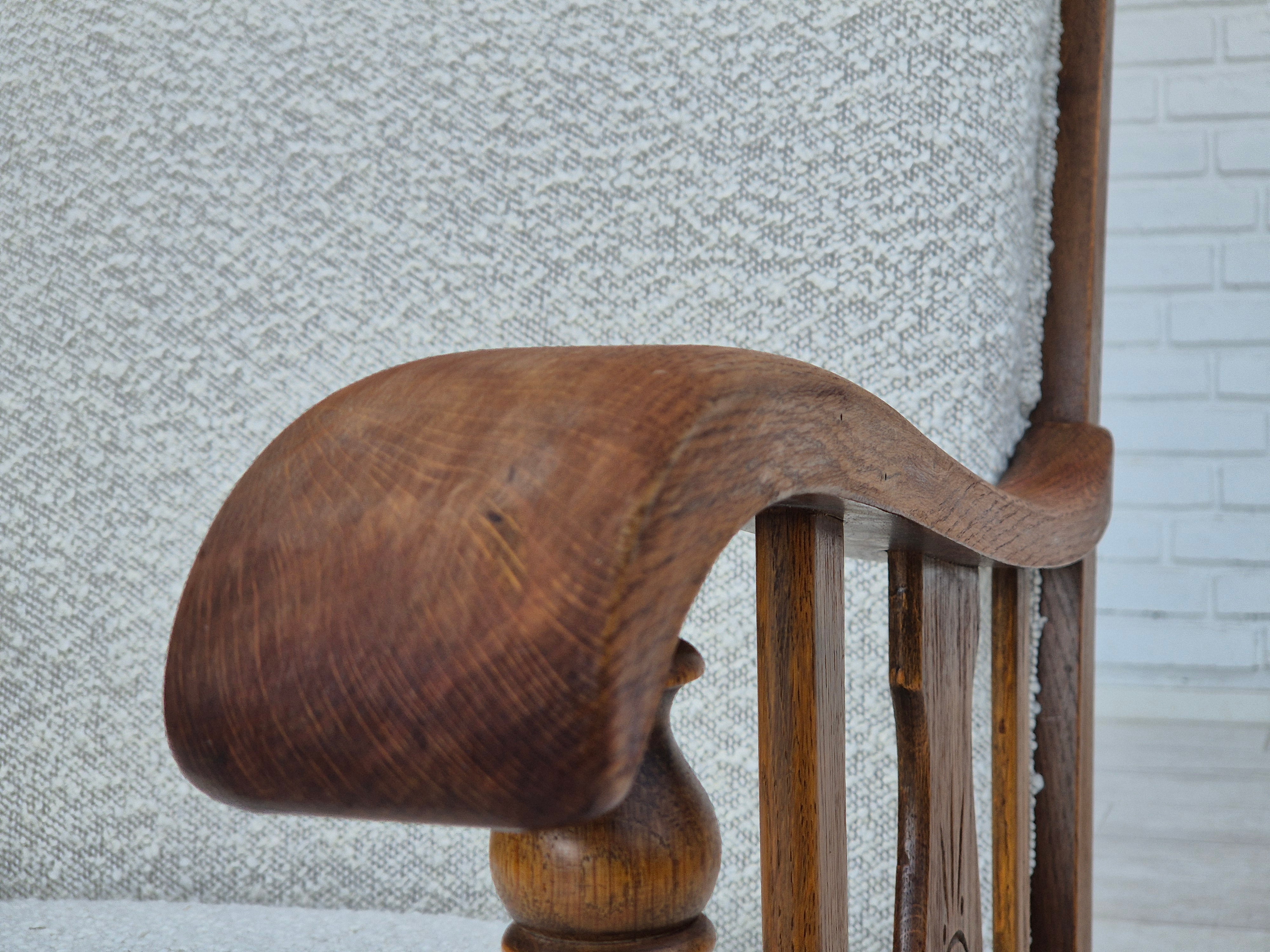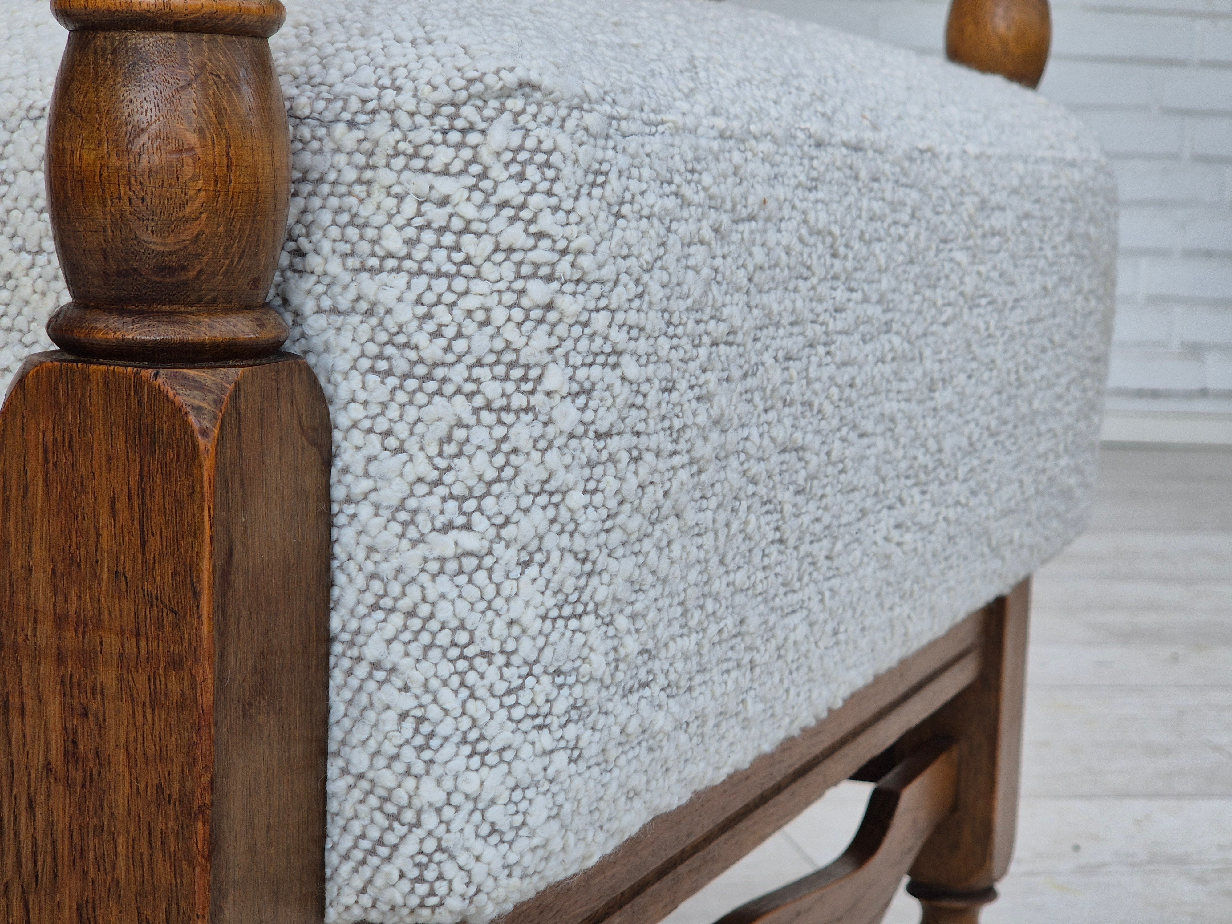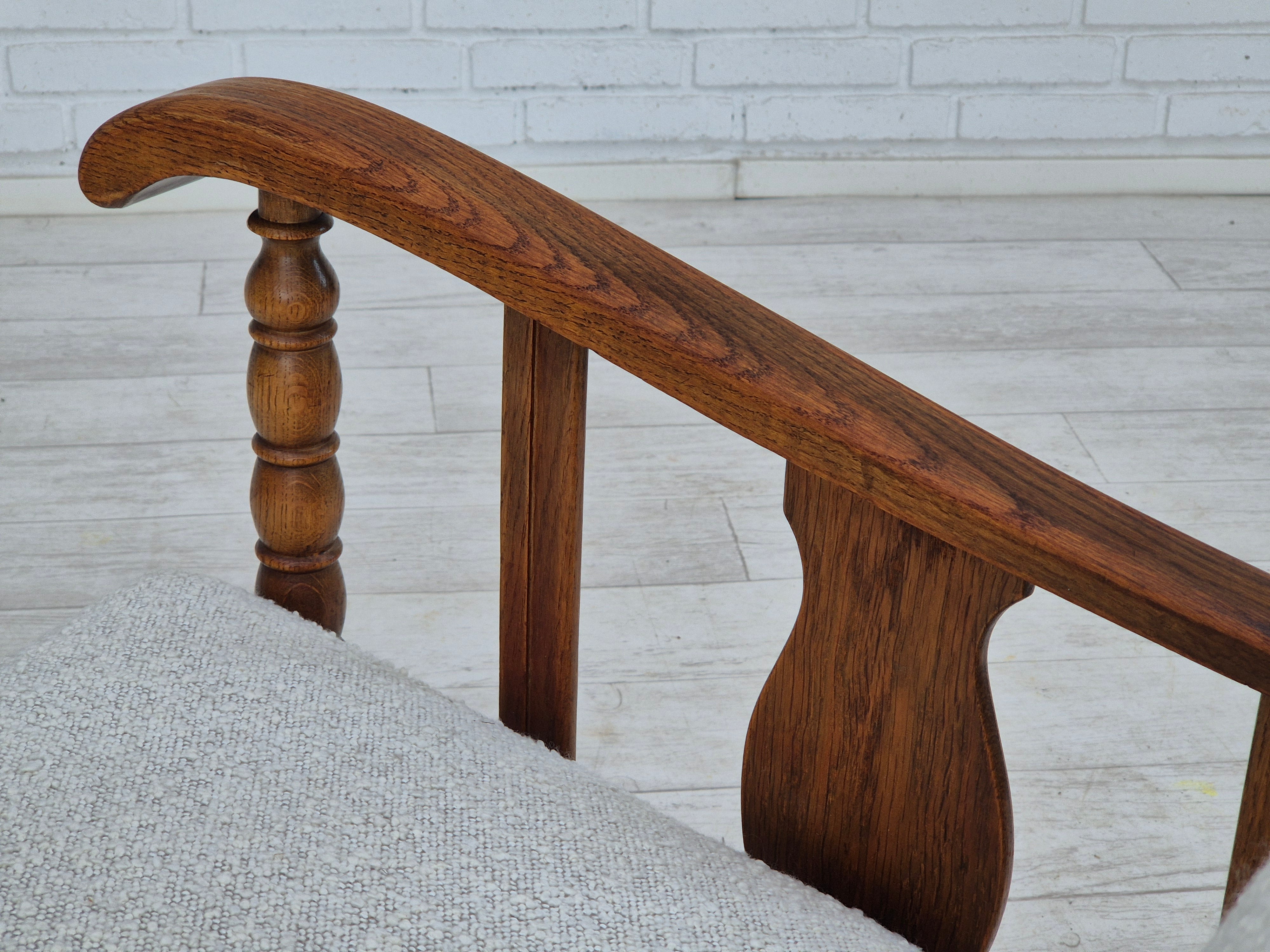 1950s, Scandinavian design - Danish or Swedish. Renovated armchair in quality upholstery fabric - white/light grey colour. Renewed oak, brass springs in the seat retained. Manufactured by Danish or Swedish furniture manufacturer in approx. 1950-55. Renovated at Retro Møbler Galleri by professional upholsterer, craftsman.