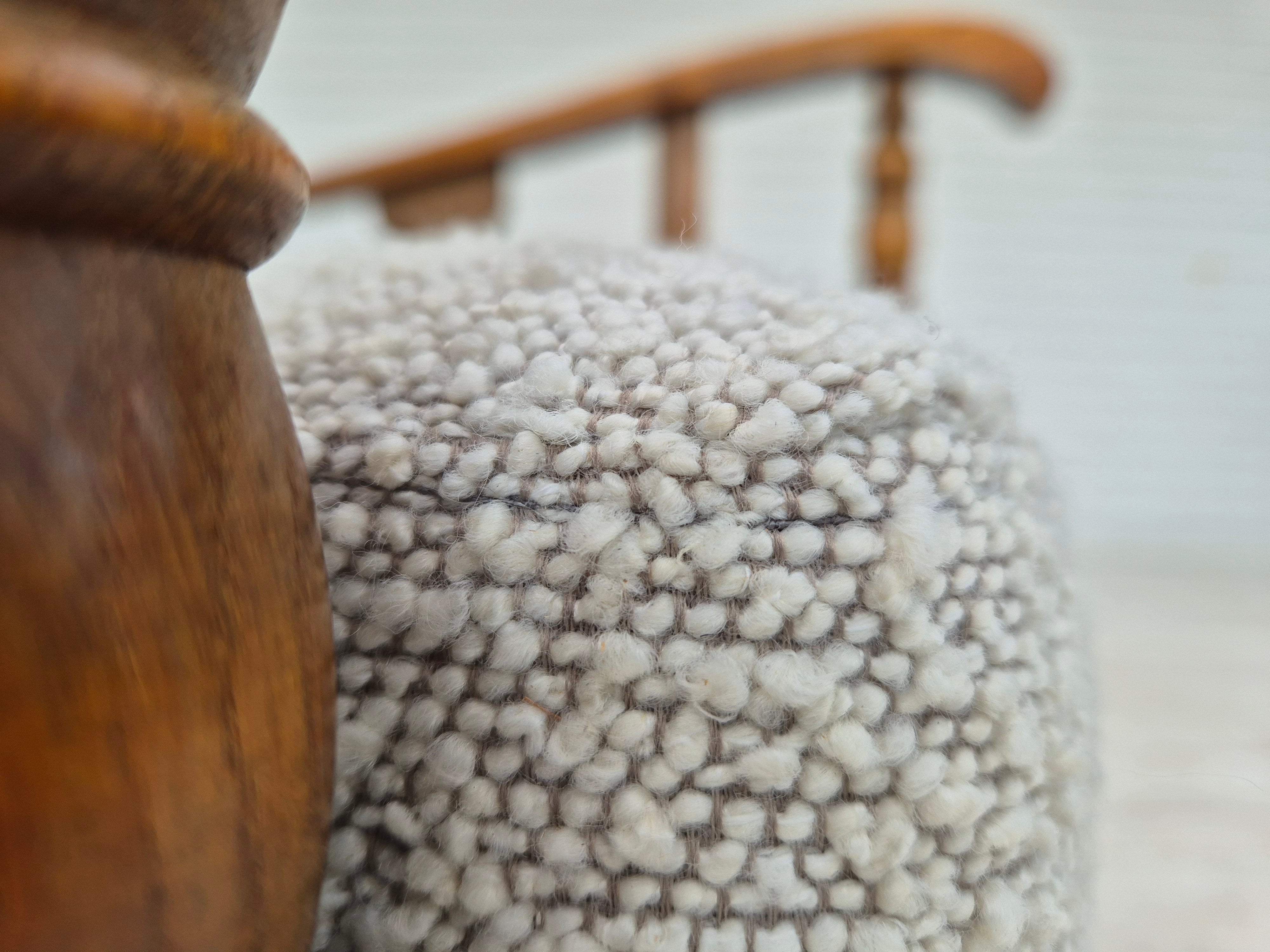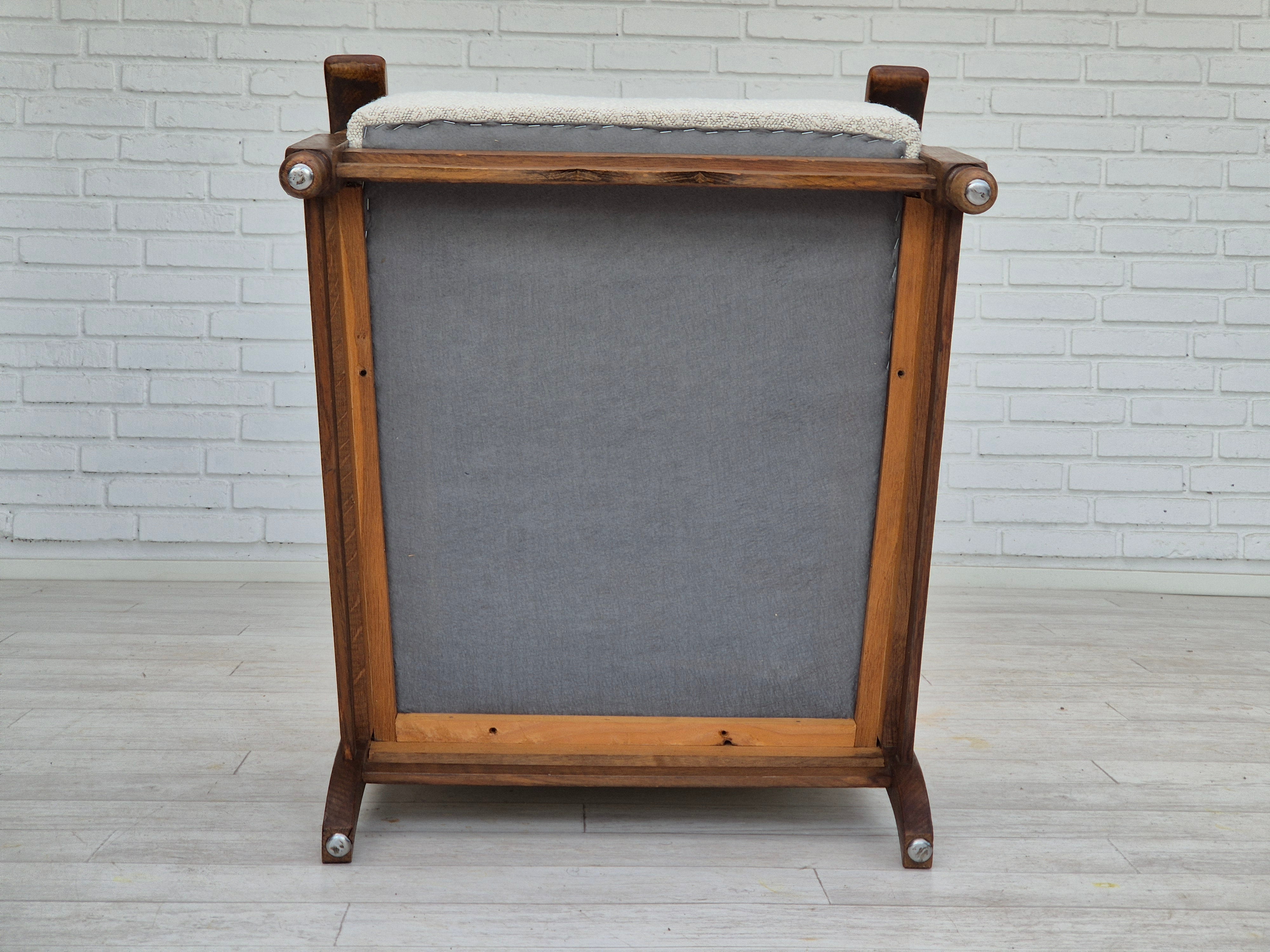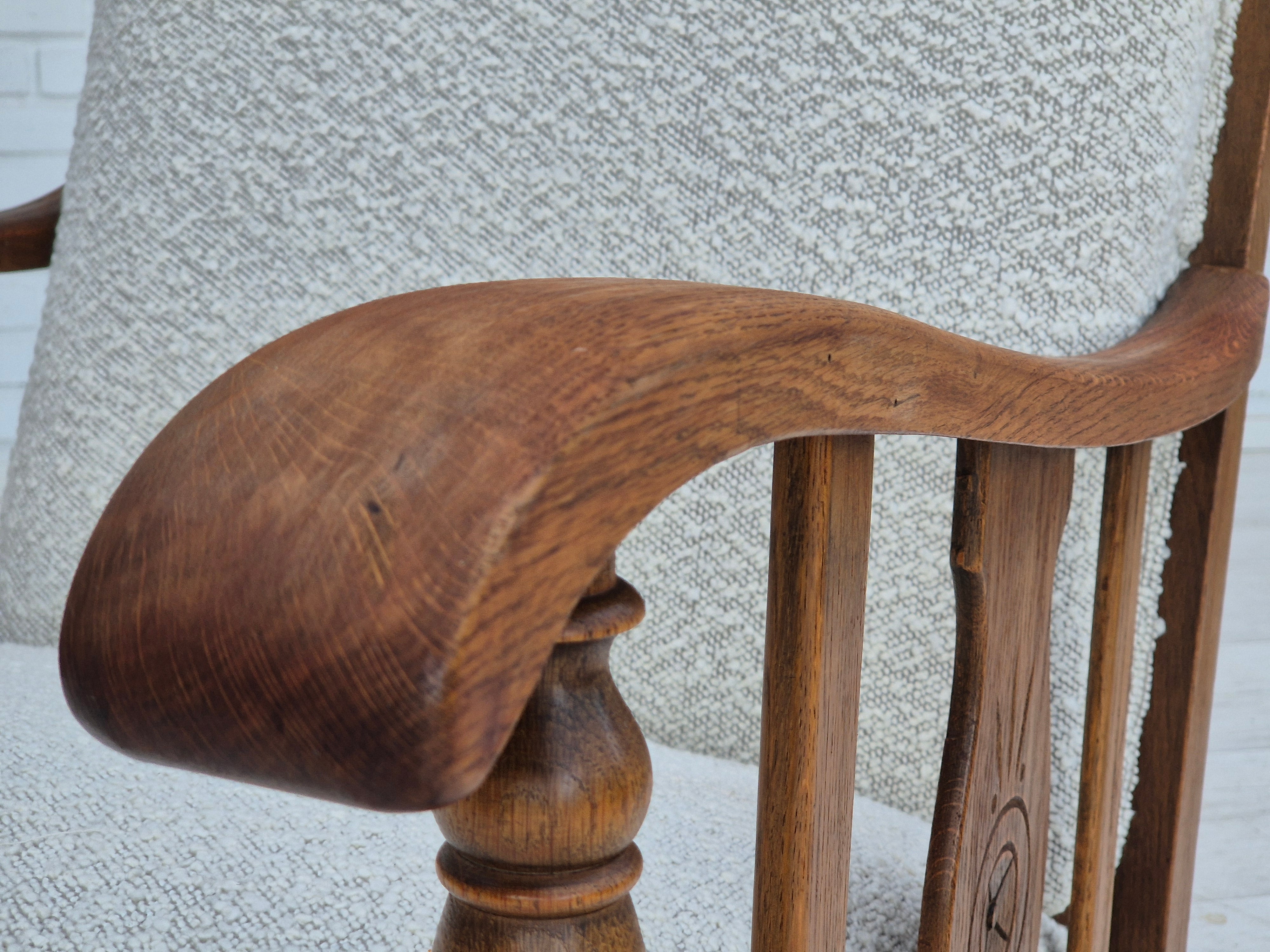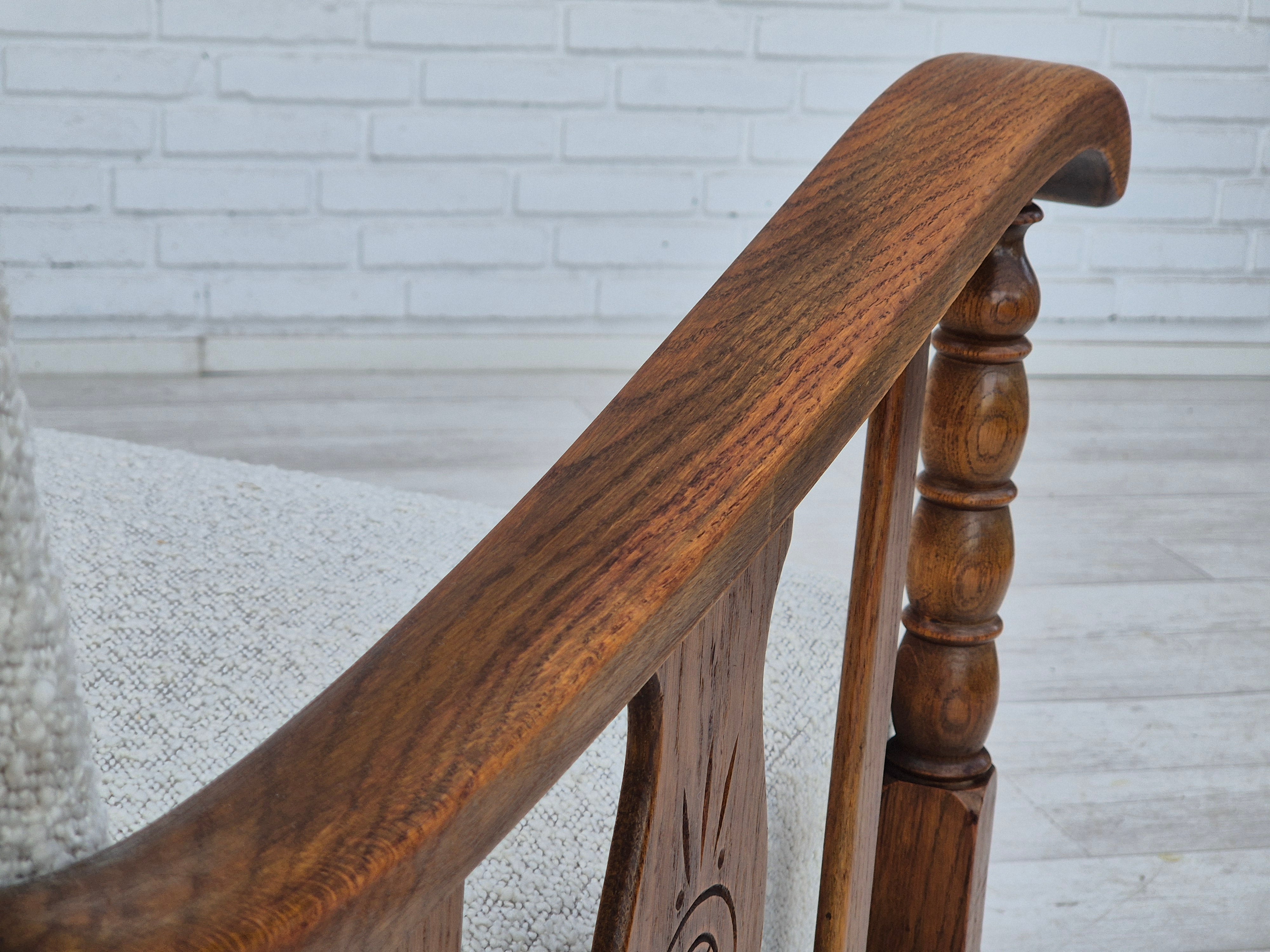 1950s, Scandinavian design - Danish or Swedish. Renovated armchair in quality upholstery fabric - white/light grey colour. Renewed oak, brass springs in the seat retained. Manufactured by Danish or Swedish furniture manufacturer in approx. 1950-55. Renovated at Retro Møbler Galleri by professional upholsterer, craftsman.