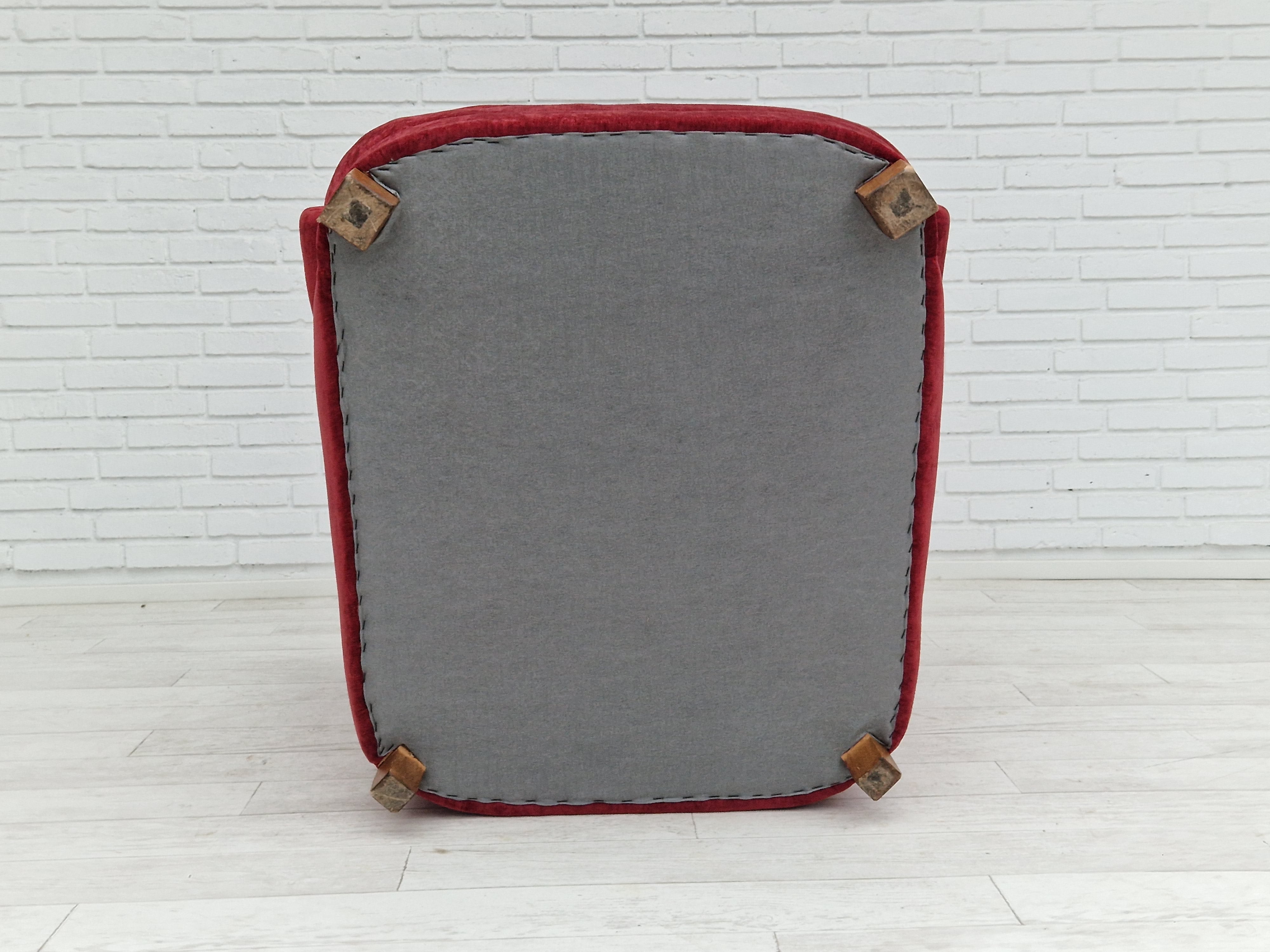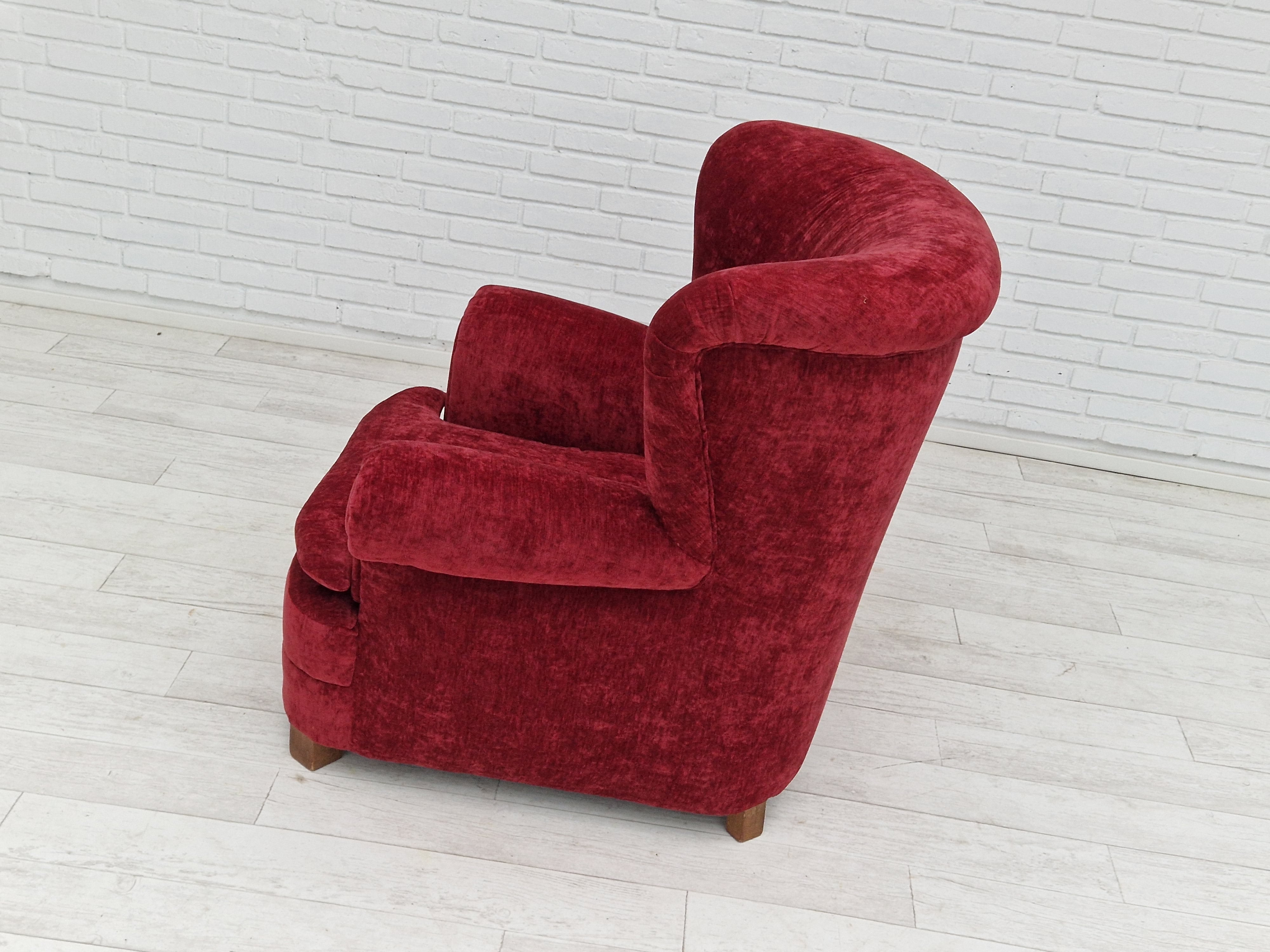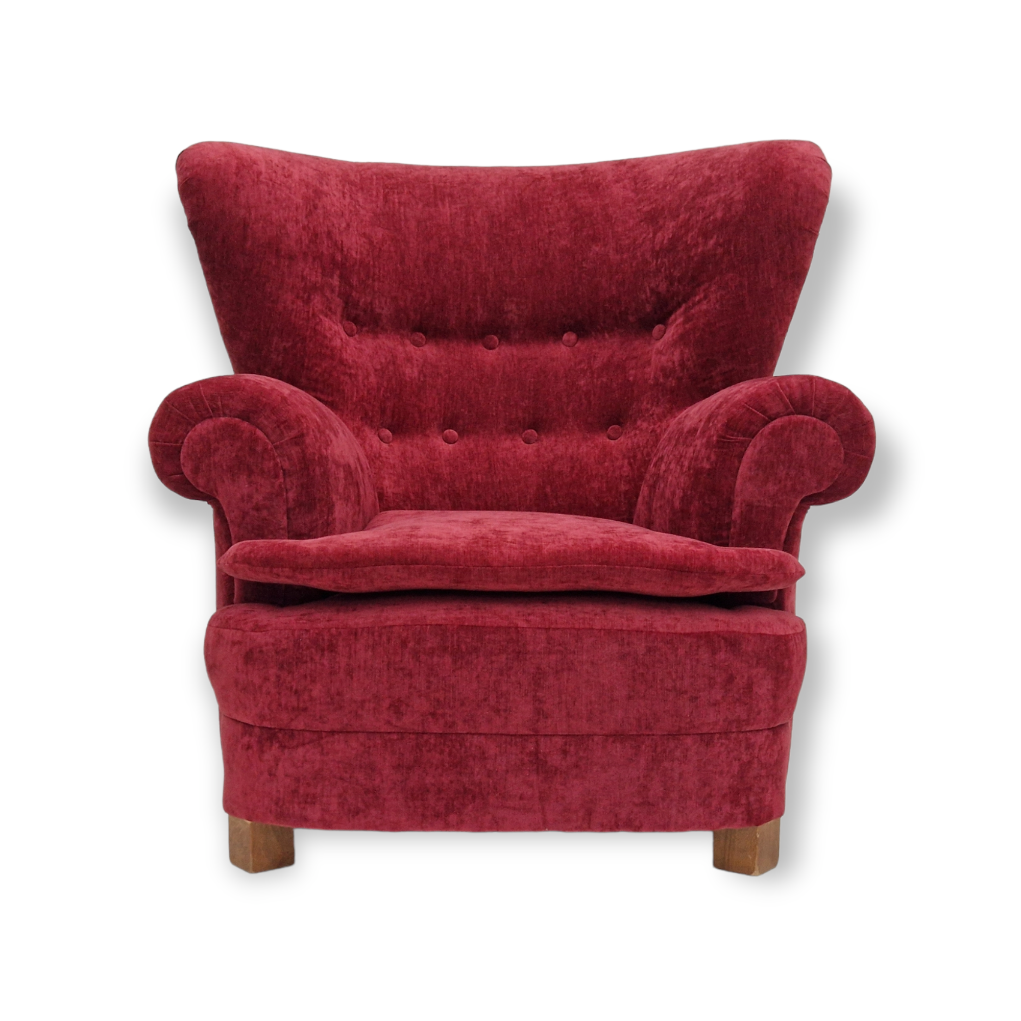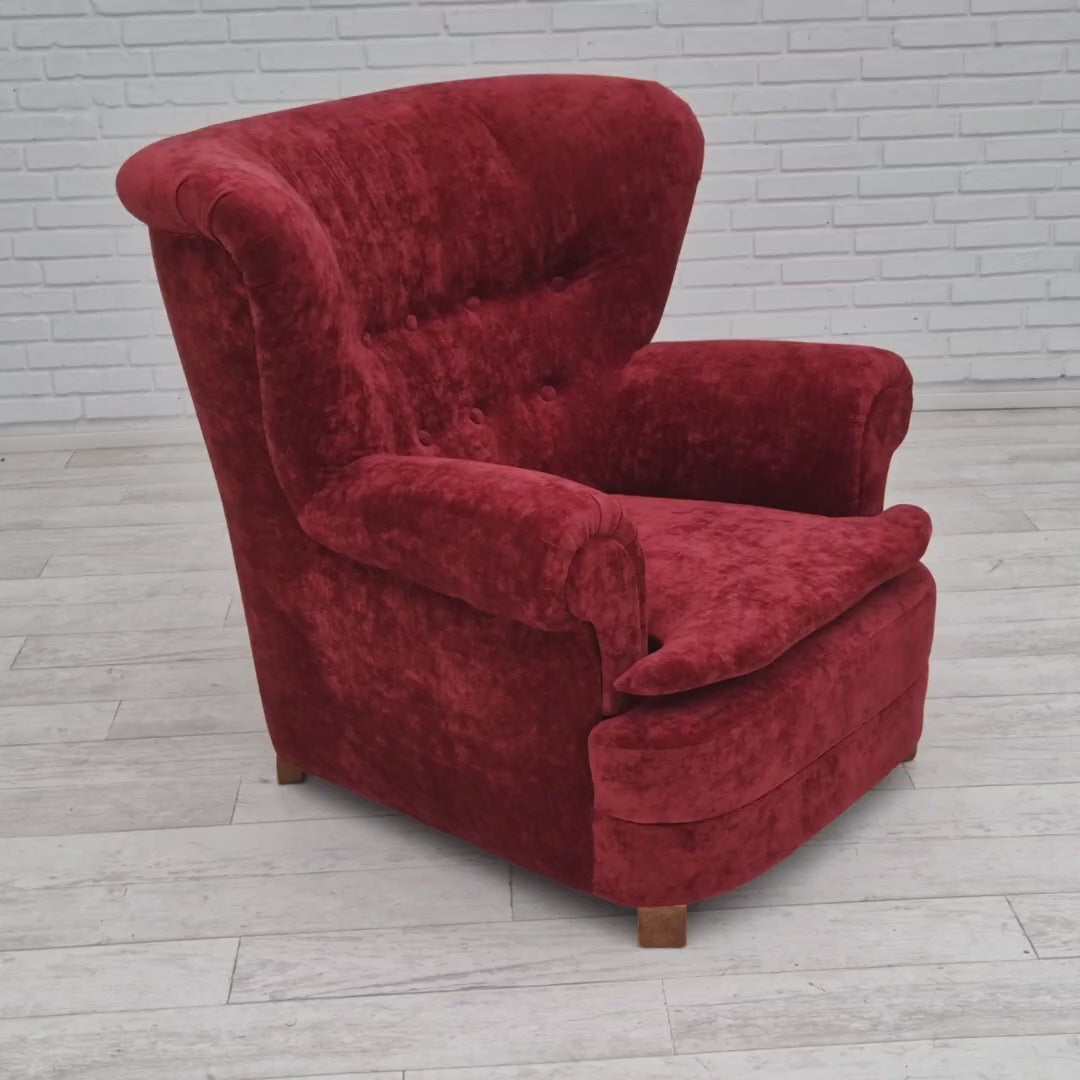 50s, renovated Danish armchair with buttons. Quality dark red vintage velvet. Original brass fourth in the seat and back retained. Brand new loose seat cushion. Beech wood legs. Manufactured by Danish furniture manufacturer in approx. 1950-55. Renovated at Retro Møbler Galleri by professional upholsterer, craftsman.