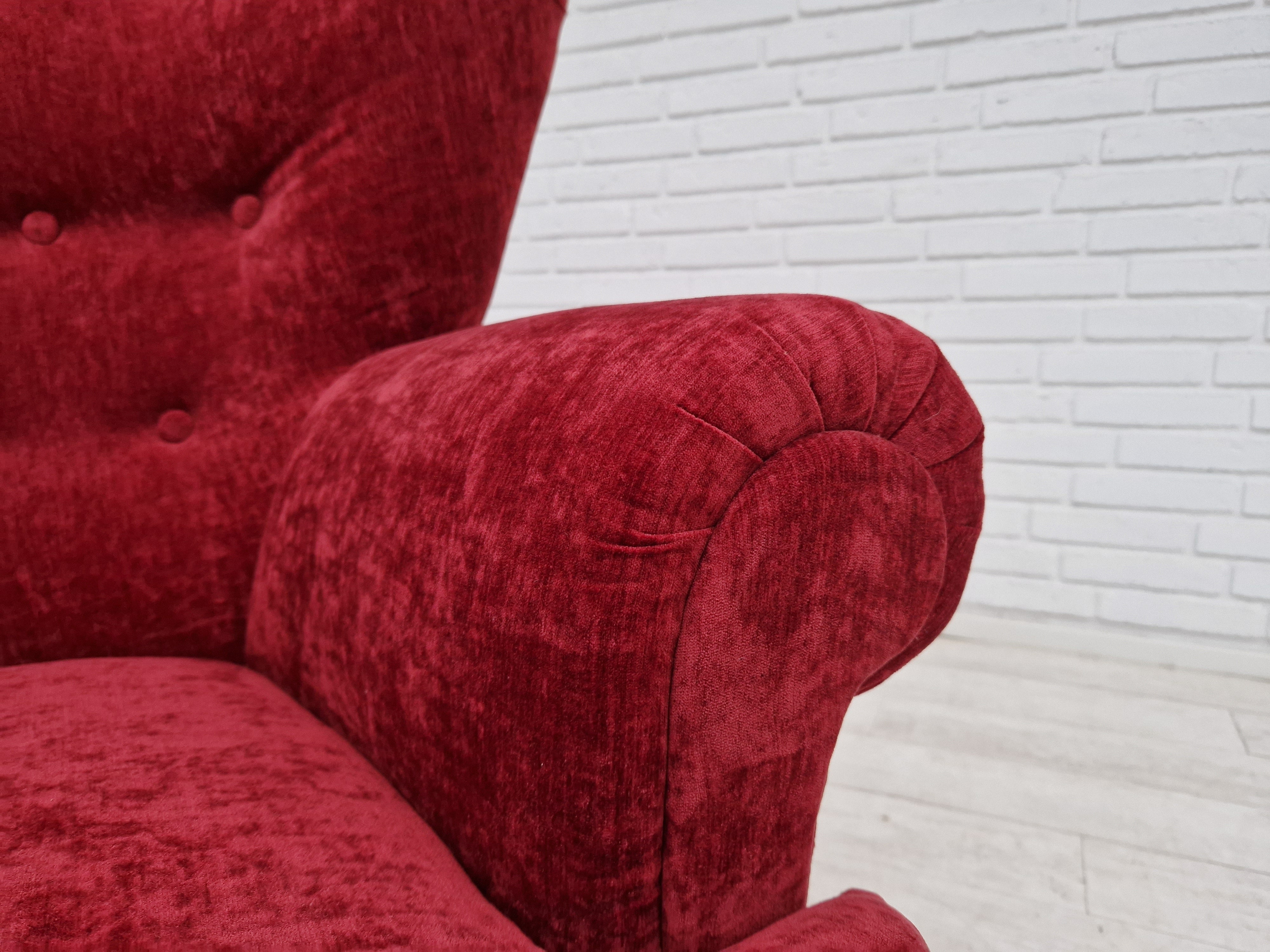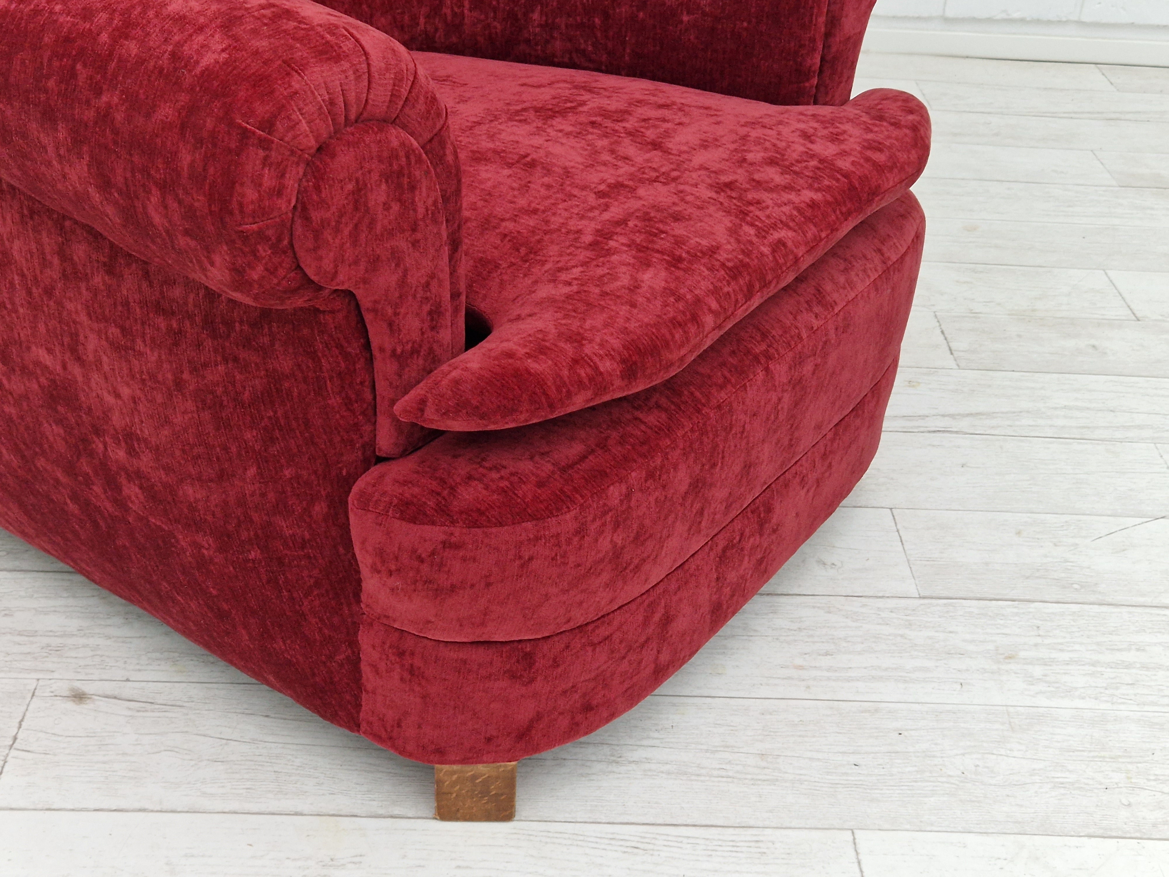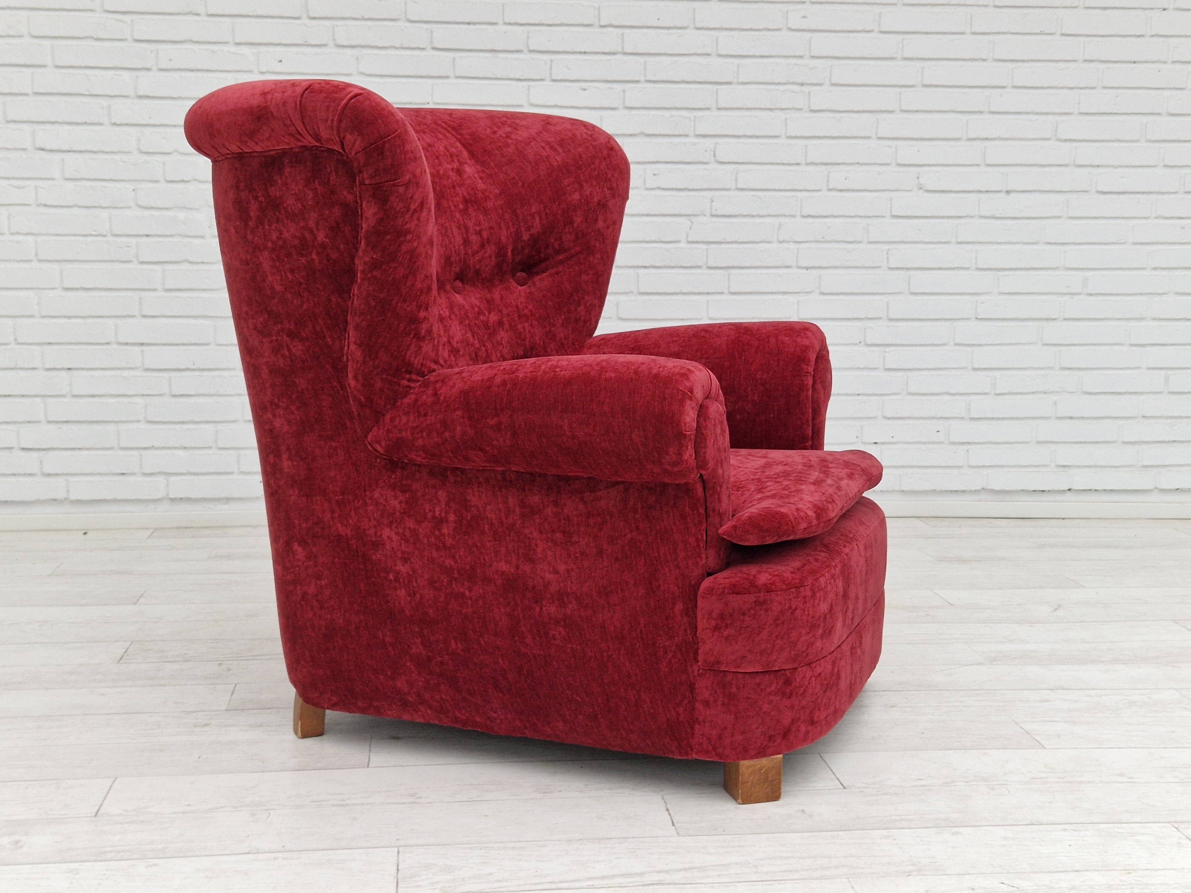 50s, renovated Danish armchair with buttons. Quality dark red vintage velvet. Original brass fourth in the seat and back retained. Brand new loose seat cushion. Beech wood legs. Manufactured by Danish furniture manufacturer in approx. 1950-55. Renovated at Retro Møbler Galleri by professional upholsterer, craftsman.