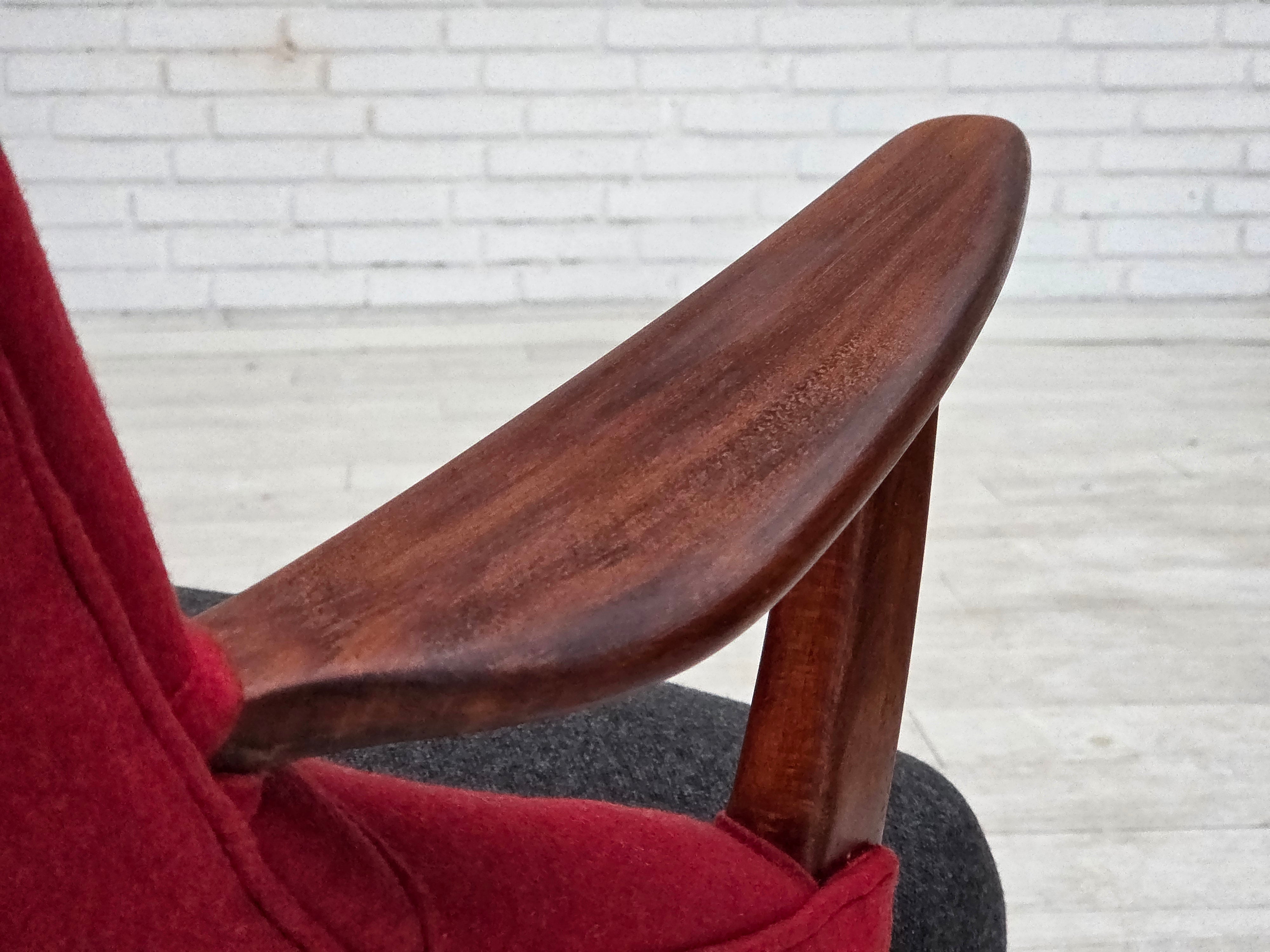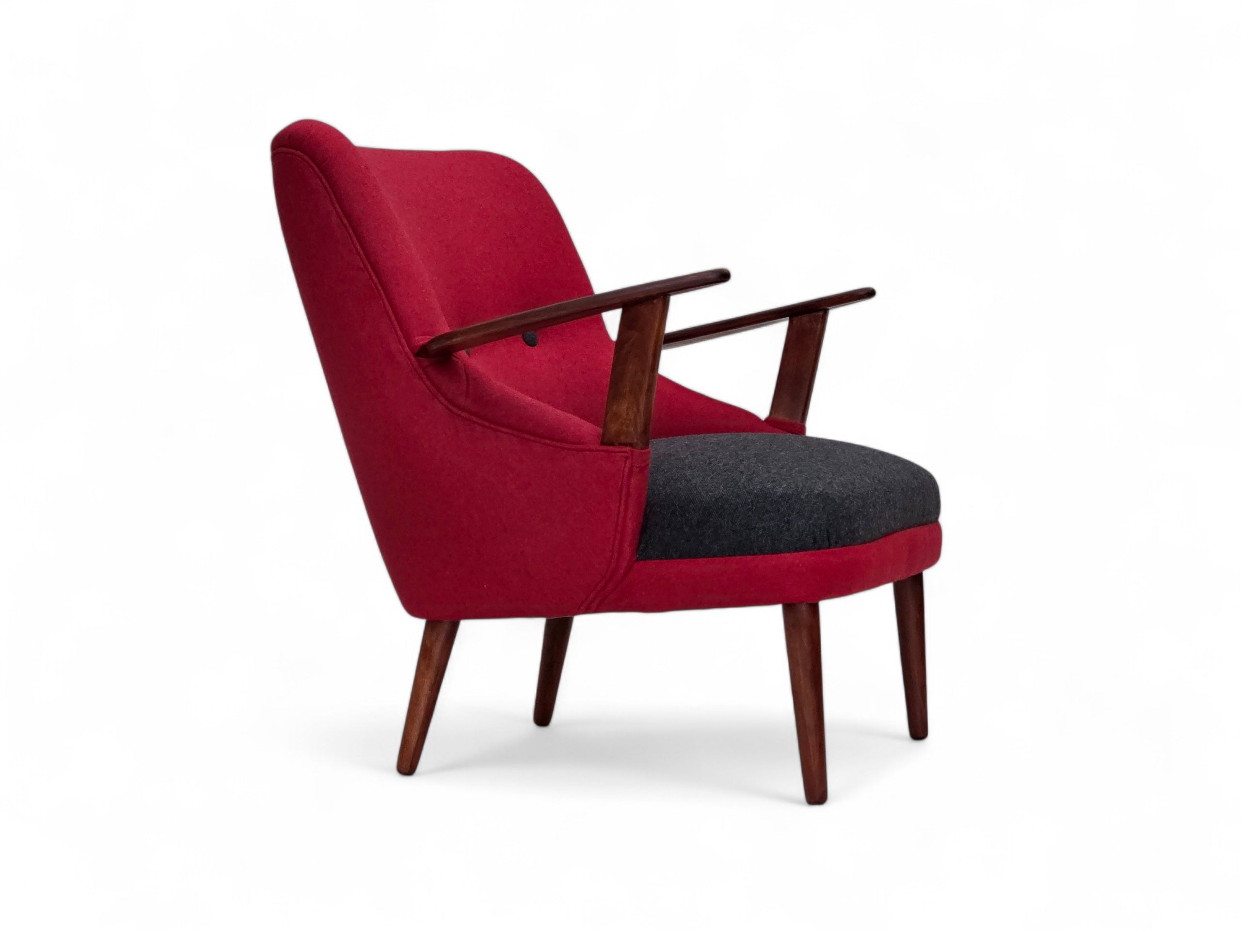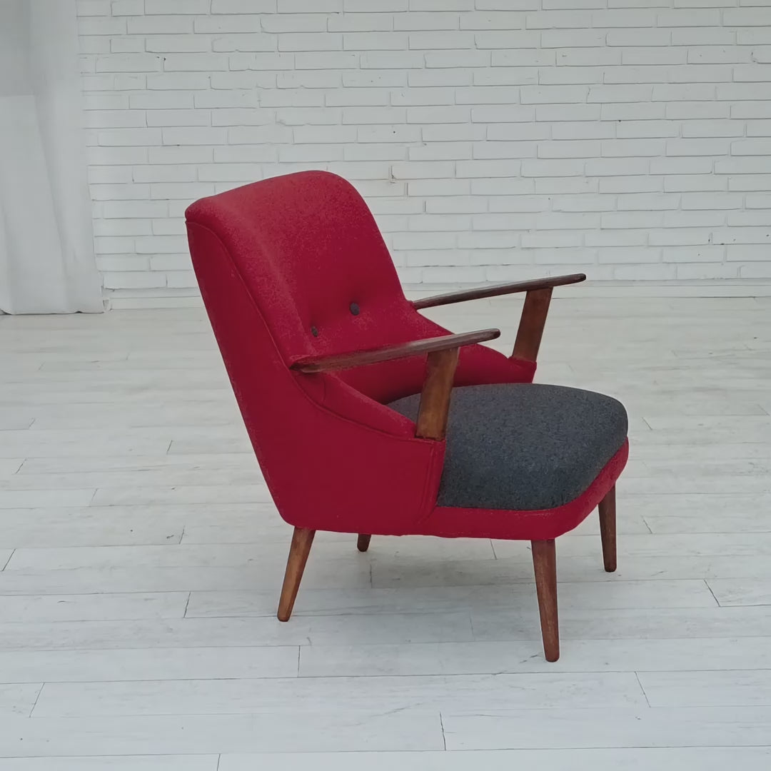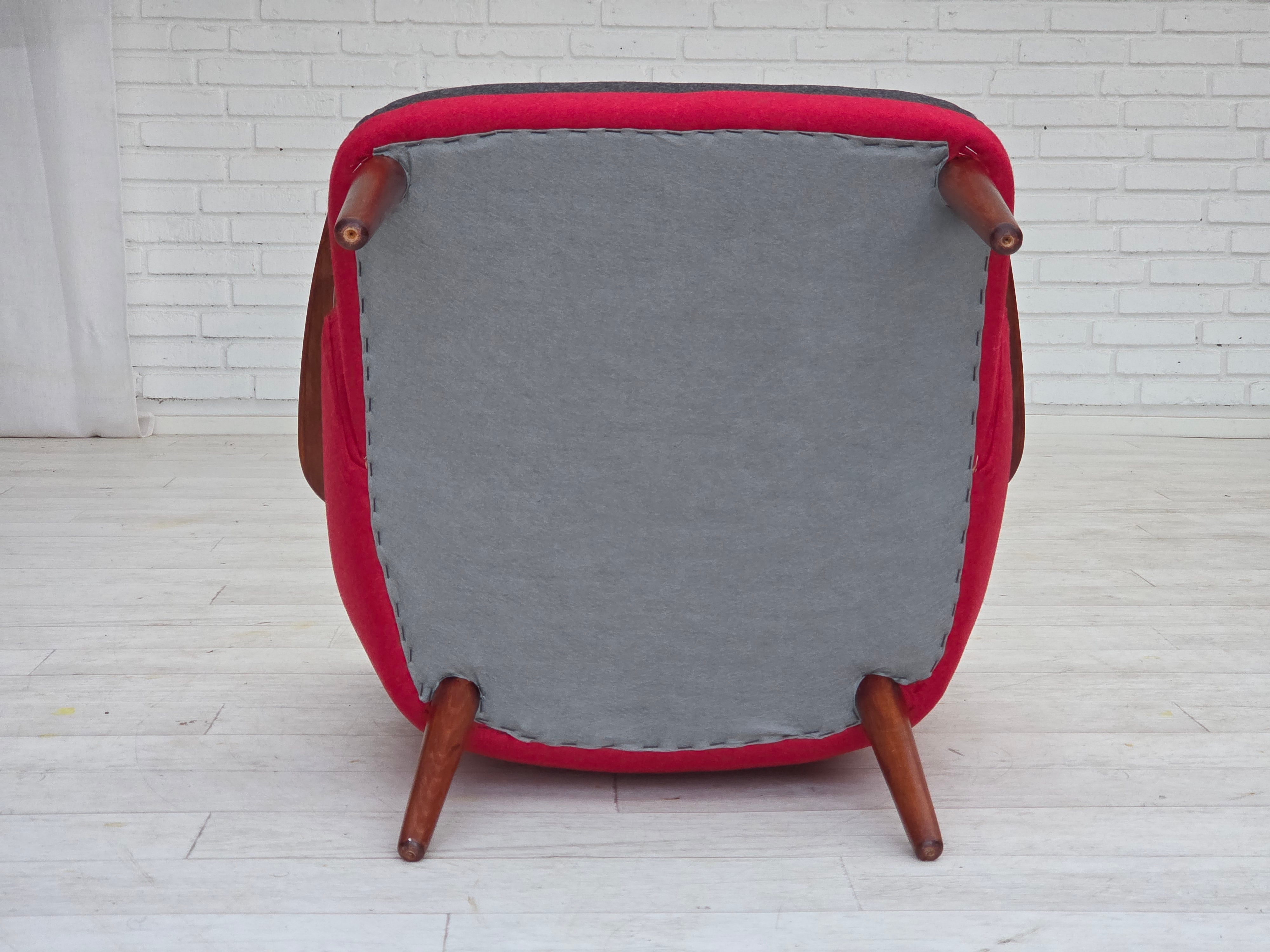 1960erne, Dansk designet lænestol. Total renoveret i kvalitets møbeluld i rød og grå farve. Forfrisket mørke bøgetræ og fjedre i sædet beholdes. Fremstillet af Dansk møbelproducent i ca. 1960-65erne. Reupholsteret hos Retro Møbler Galleri af professionel møbelpolstrer, håndværker.