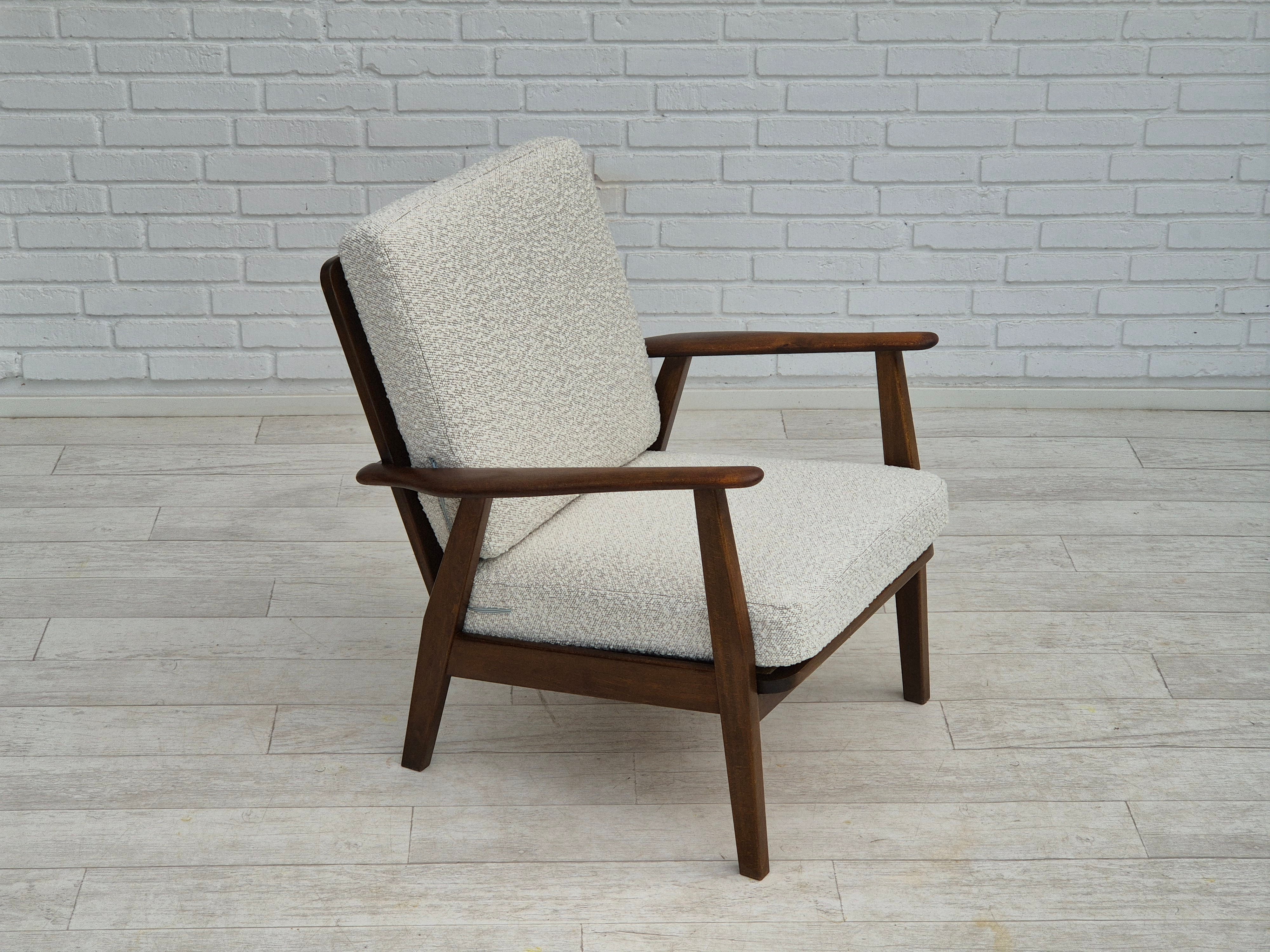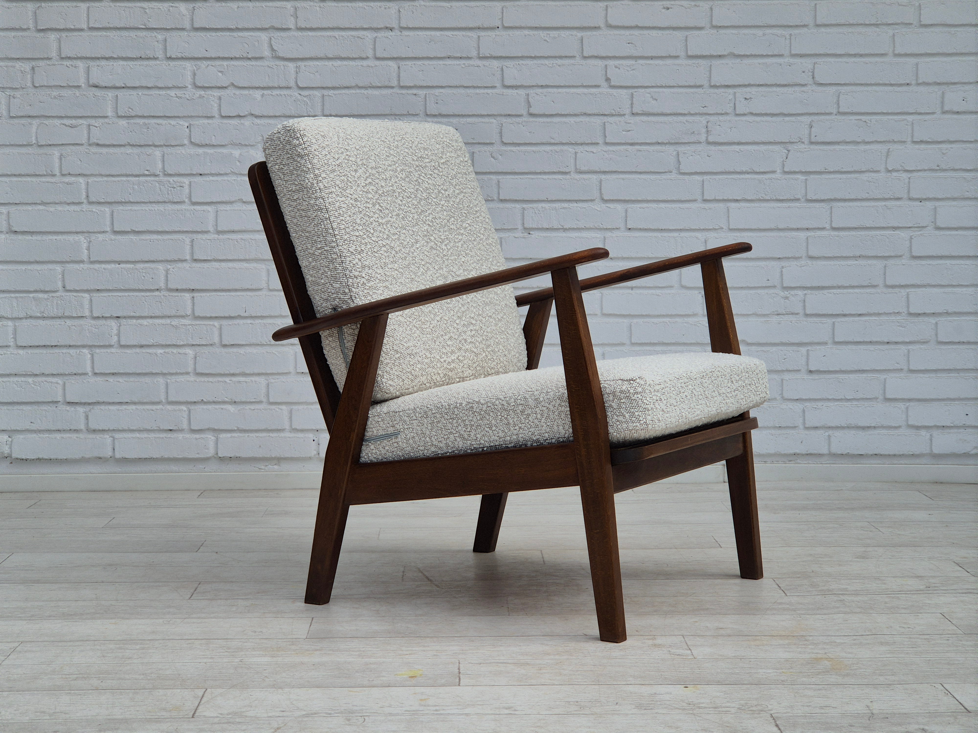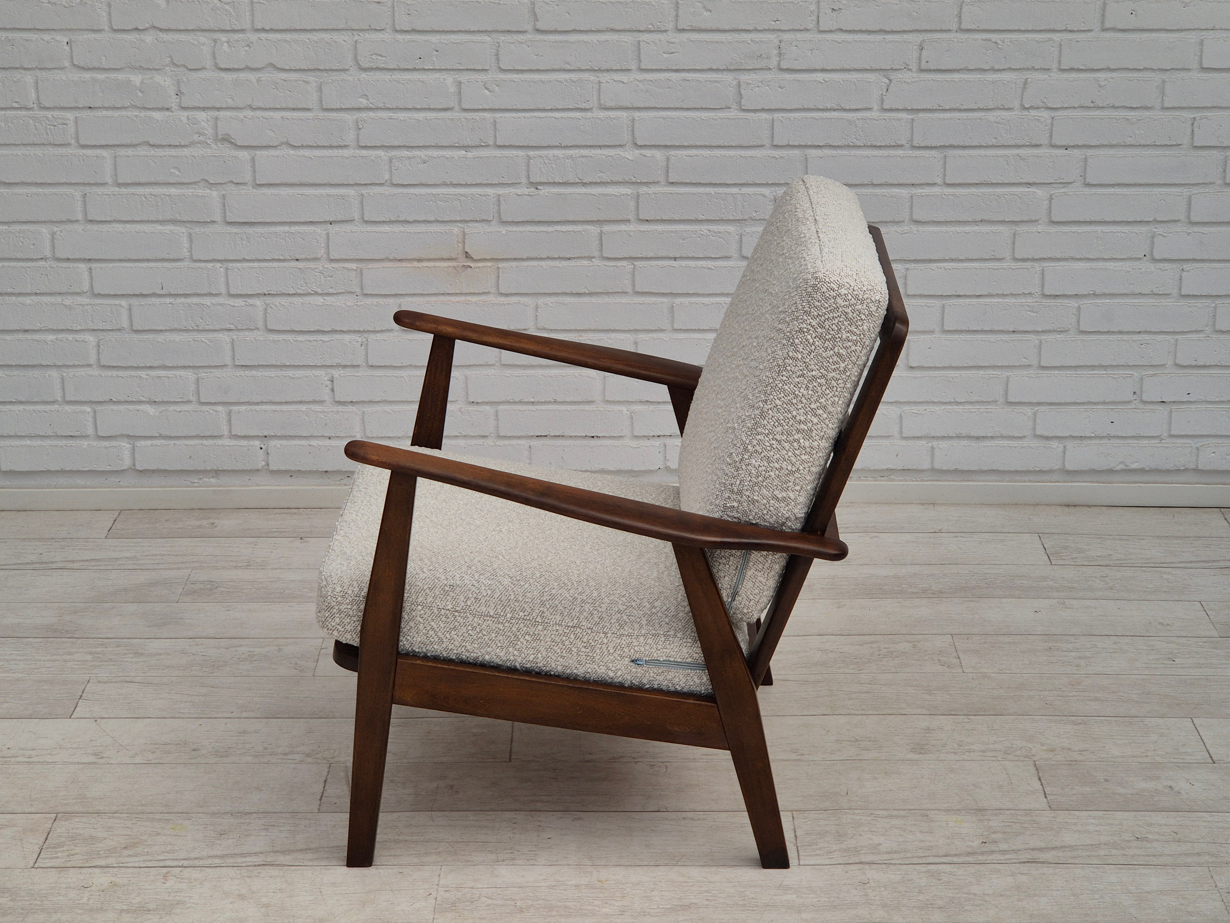 1960erne, Dansk lænestol. Renoveret i kvalitets hvid/ grå møbelstof. Helt ny ryghynde, fjedre i sædehynde. Fornyet bøgetræ. Fremstillet af Dansk møbelproducent i ca. 1960erne. Renoveret hos Retro Møbler Galleri af professionel møbelpolstrer, håndværker.