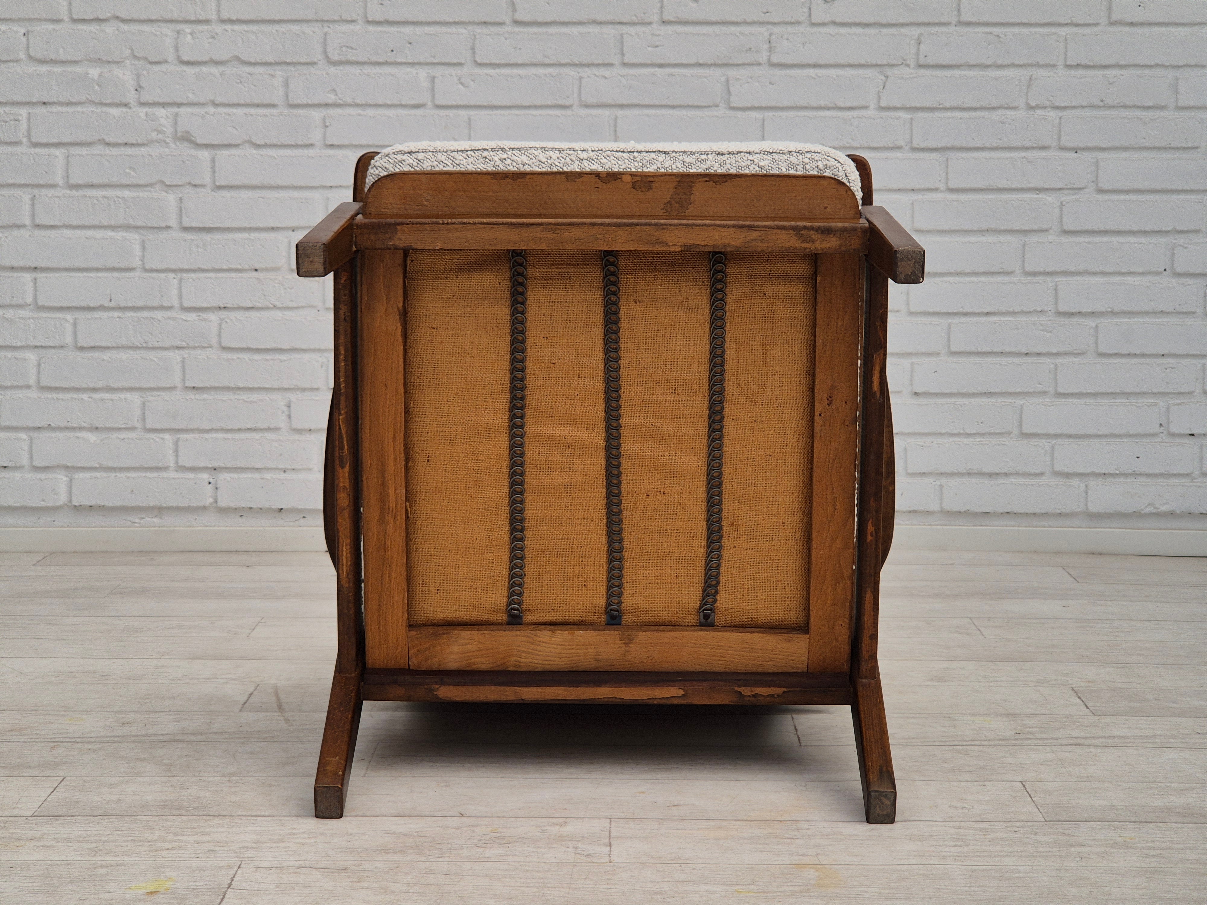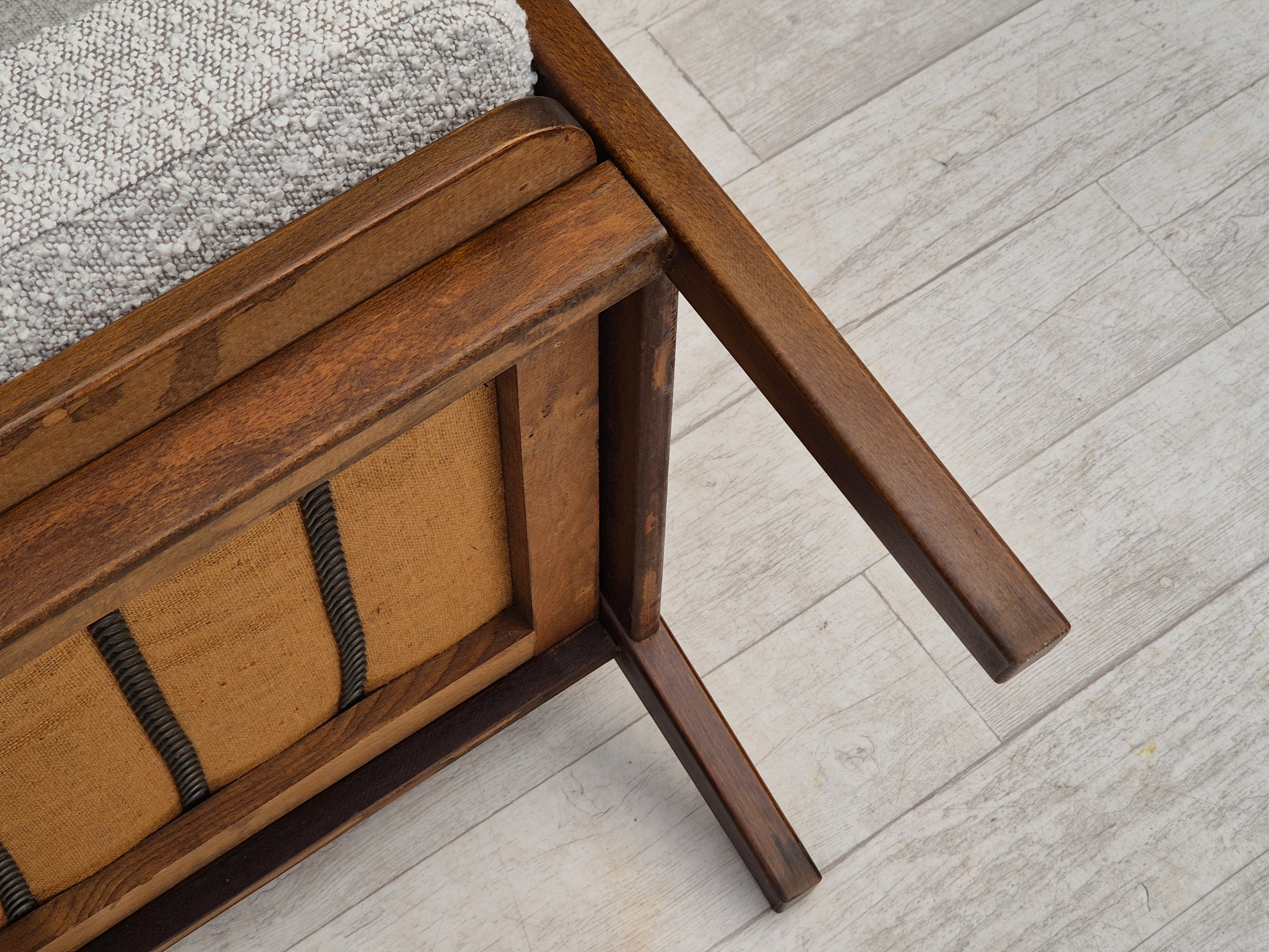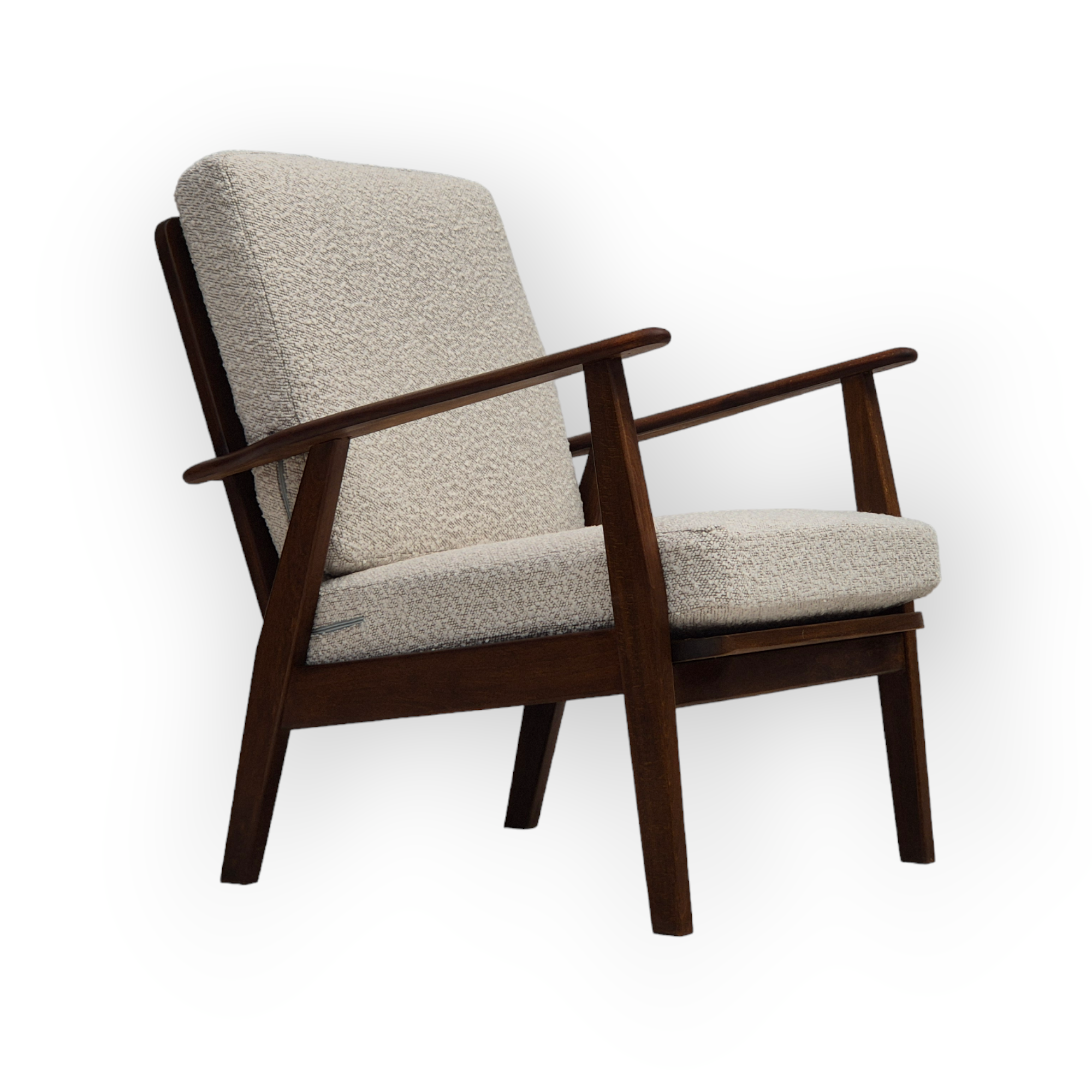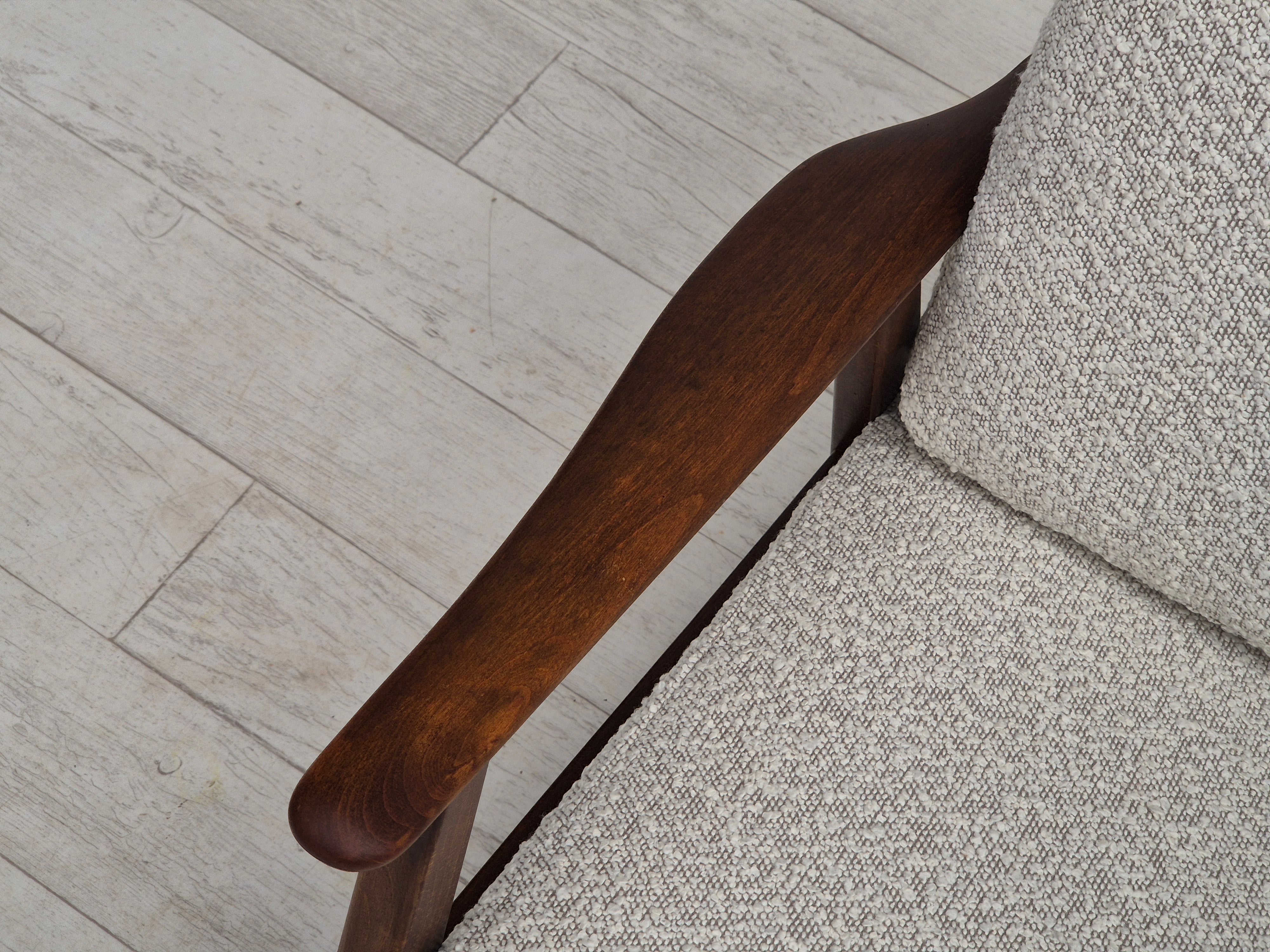 1960erne, Dansk lænestol. Renoveret i kvalitets hvid/ grå møbelstof. Helt ny ryghynde, fjedre i sædehynde. Fornyet bøgetræ. Fremstillet af Dansk møbelproducent i ca. 1960erne. Renoveret hos Retro Møbler Galleri af professionel møbelpolstrer, håndværker.