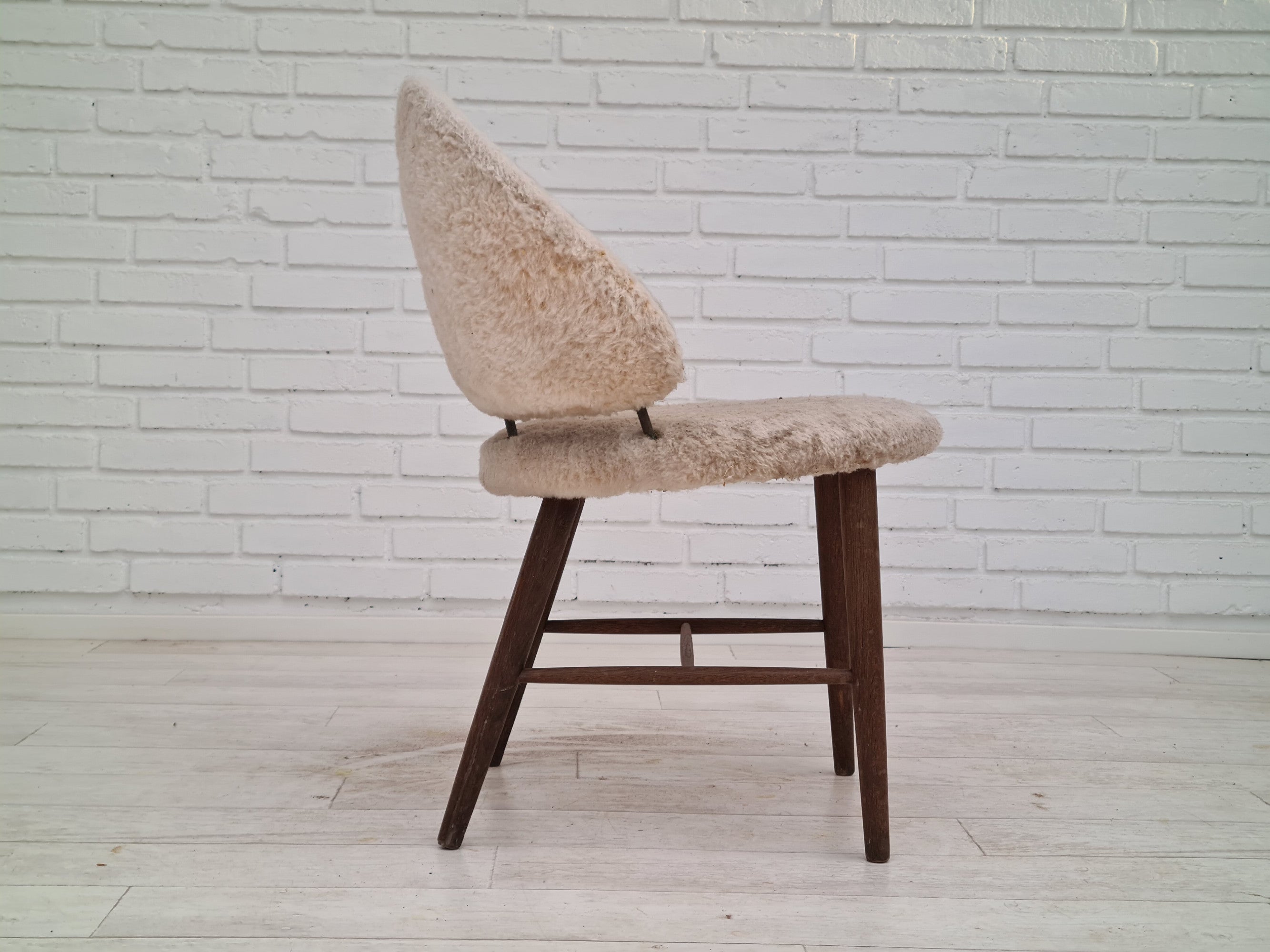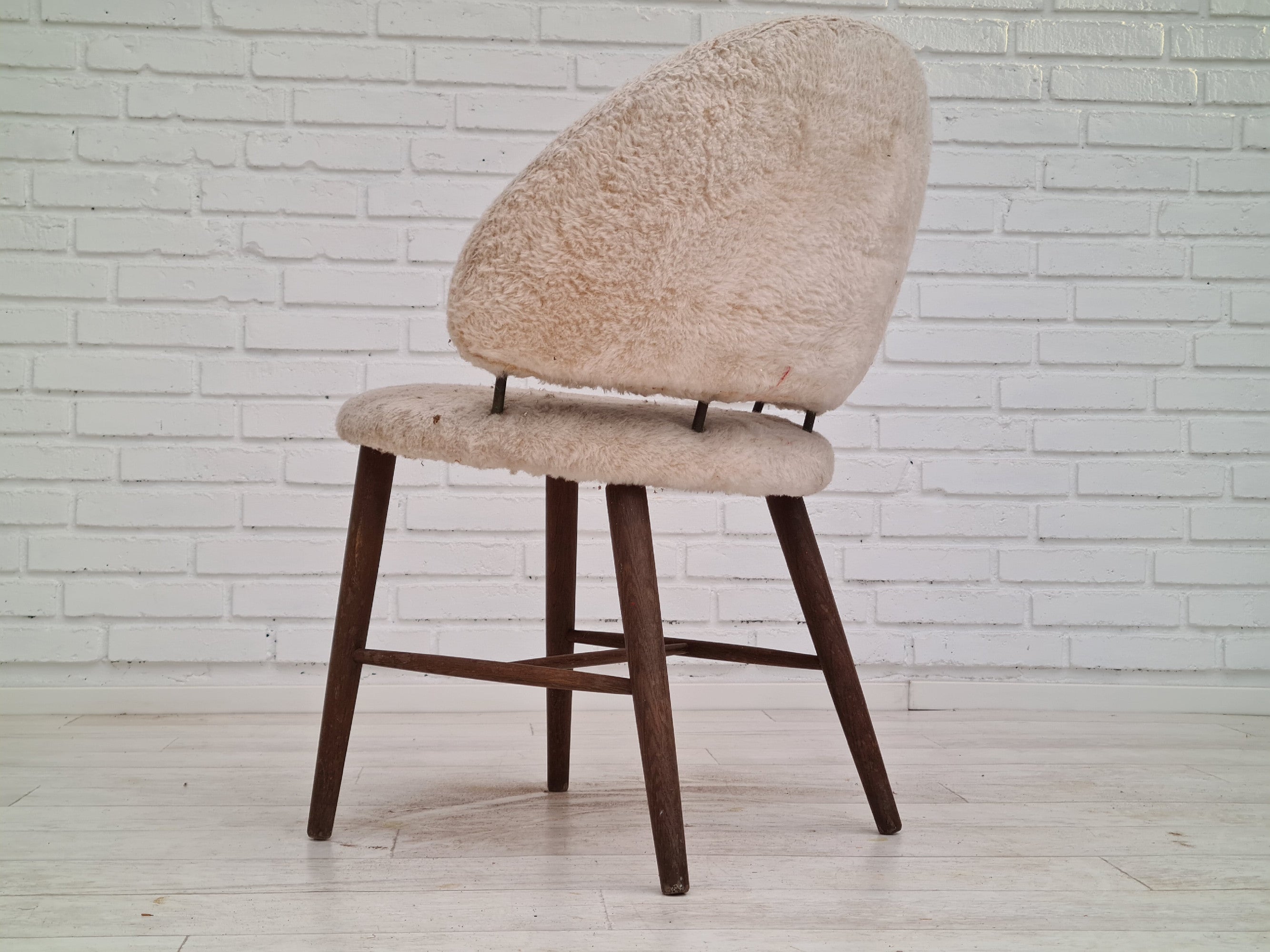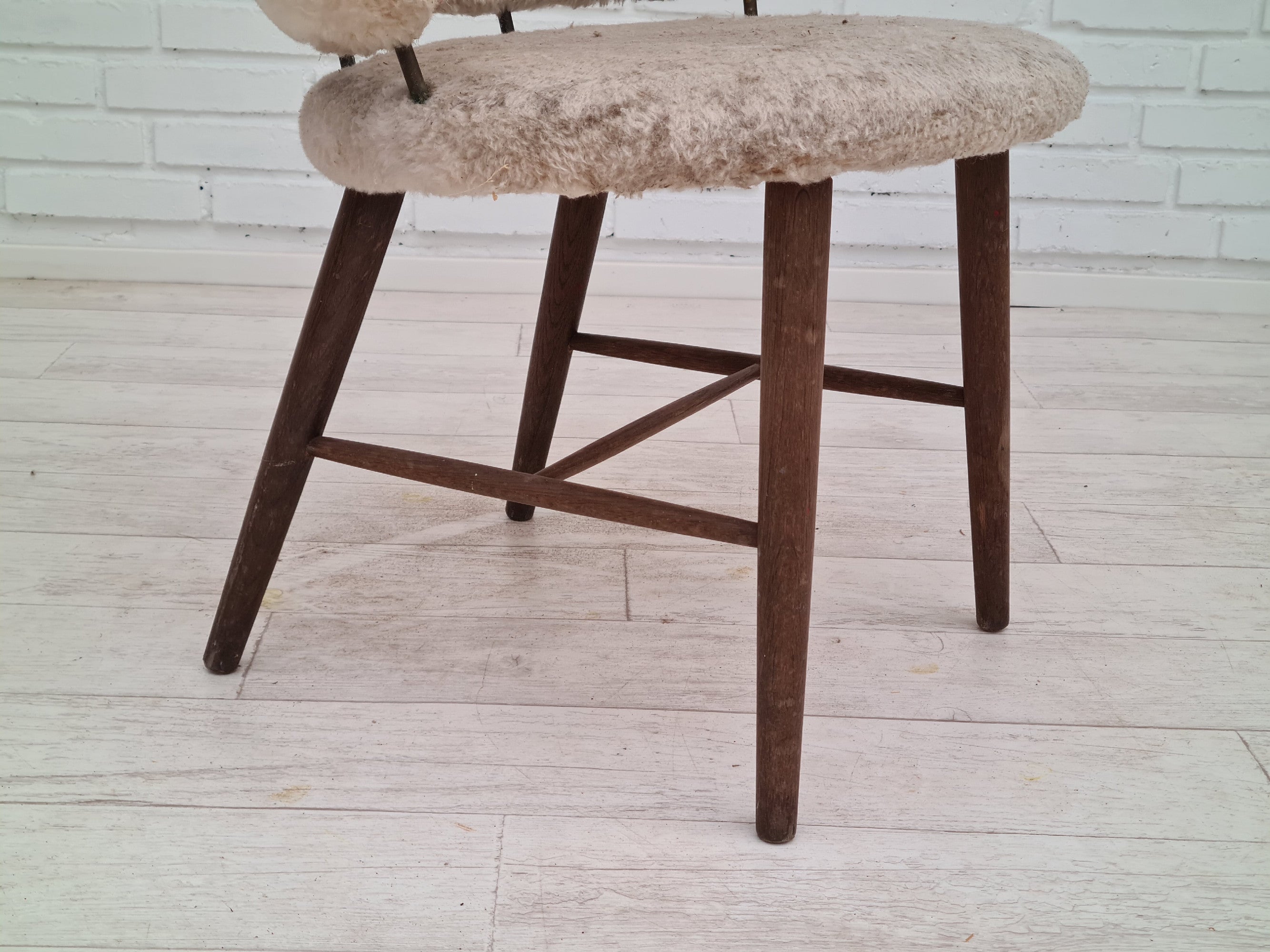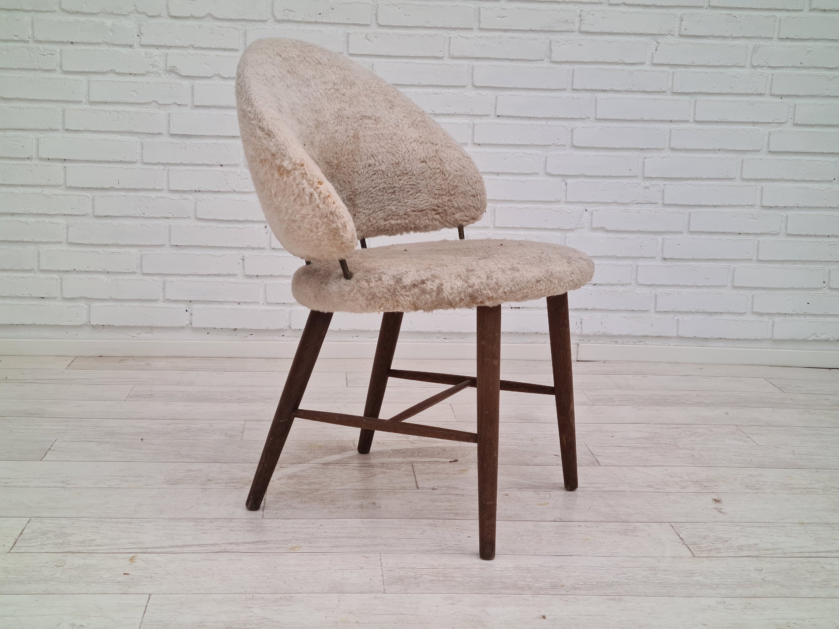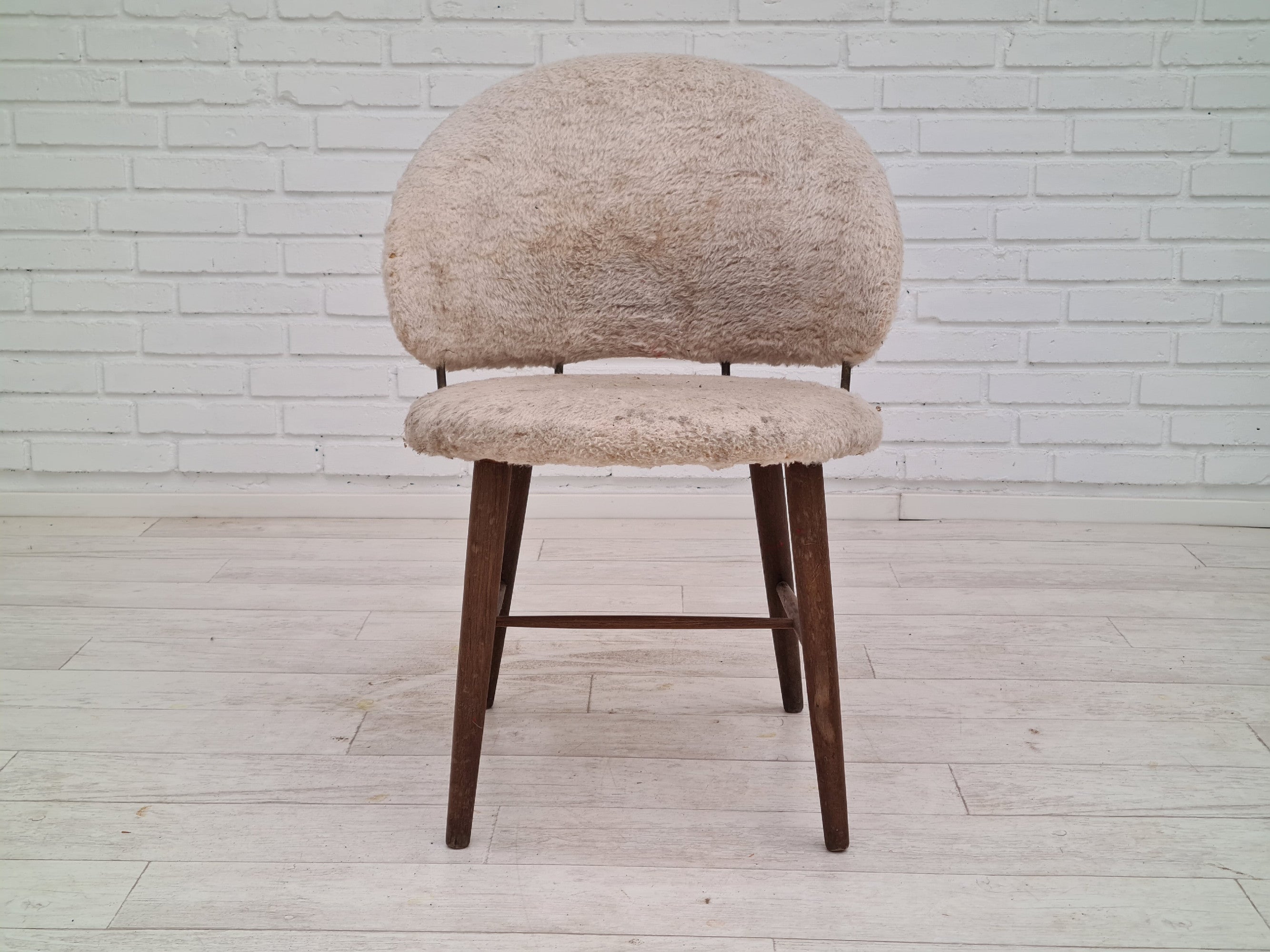 Dansk lille lænestol, 60erne, ben af teak træ. Skal laves helt ny polstring. Stol til salg efter renovering.